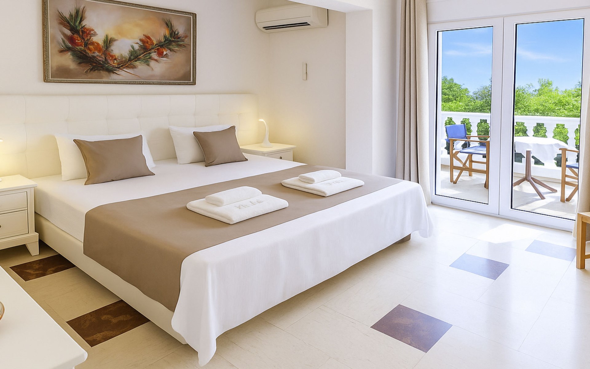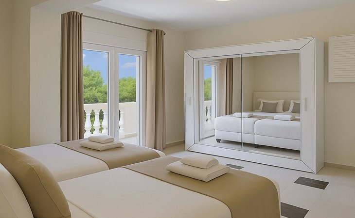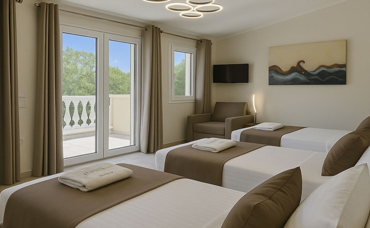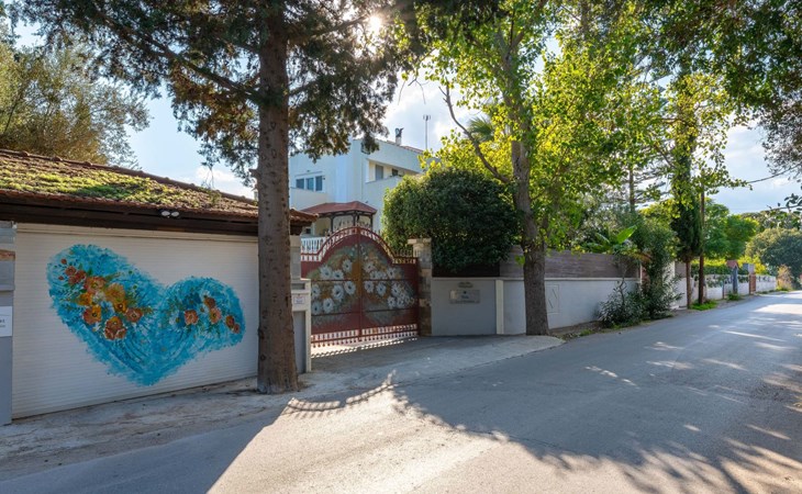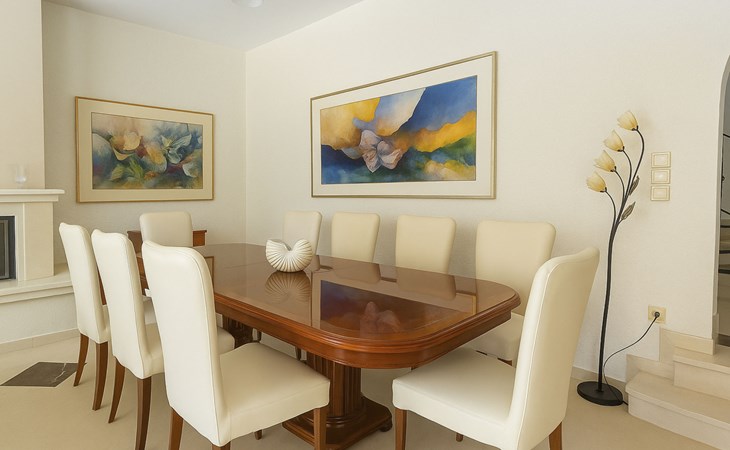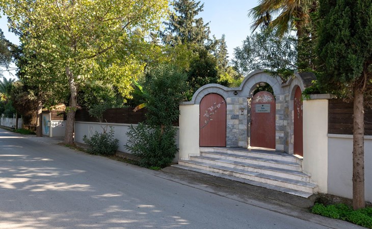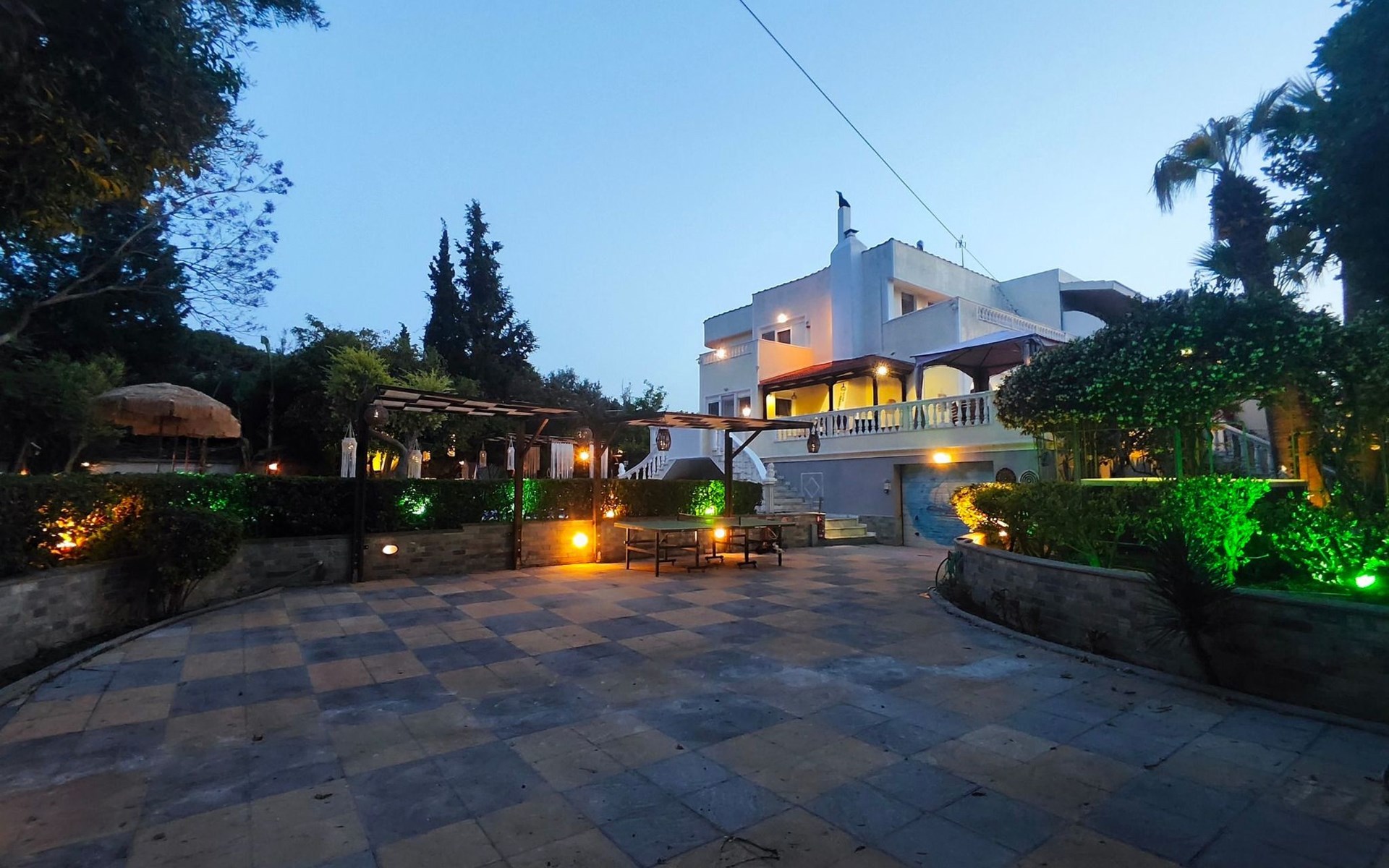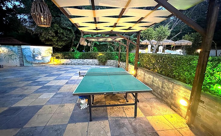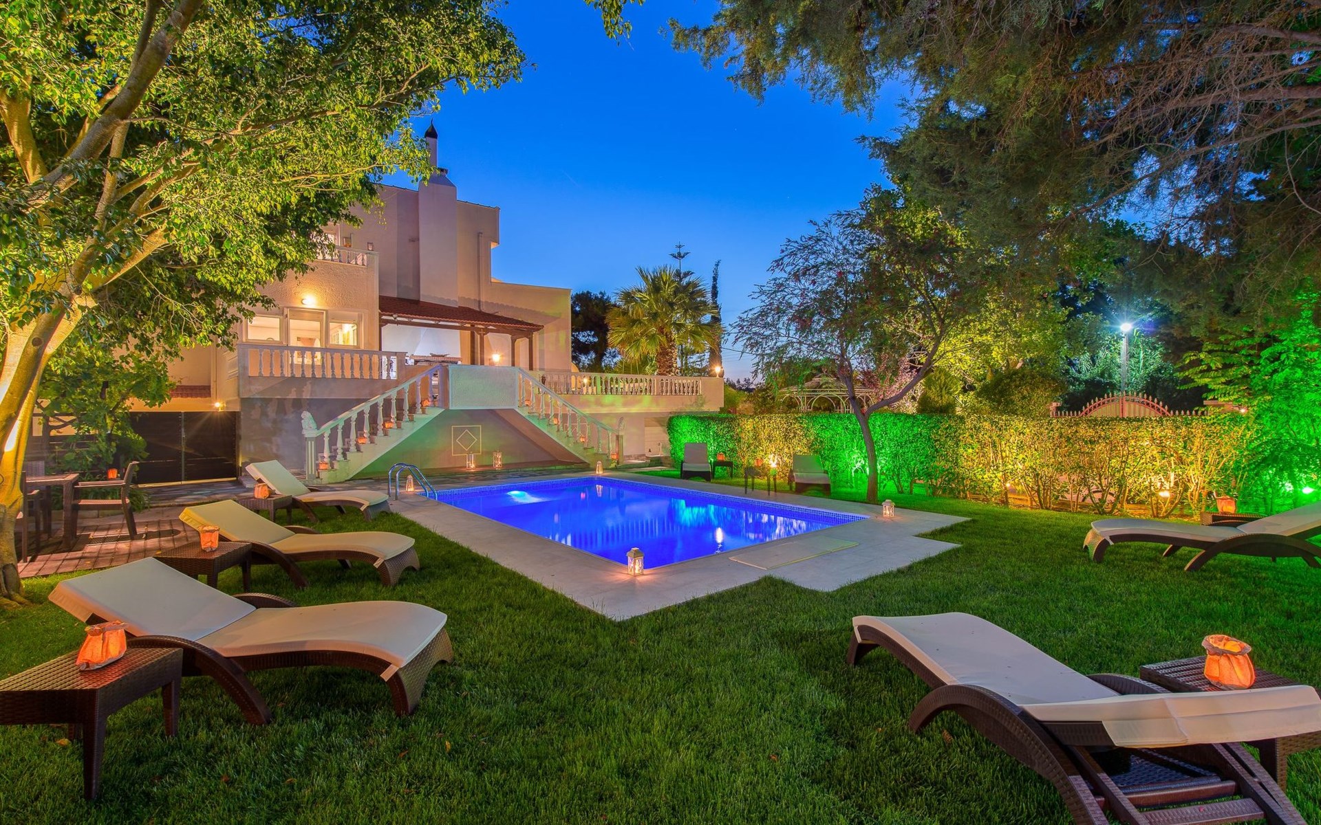 The freshwater swimming pool is adorned with elegant Greek white marble tiles and is surrounded by outdoor furniture. You can sunbathe on stylish loungers with comfortable cushions or relax on the lawn under the shade of the trees.