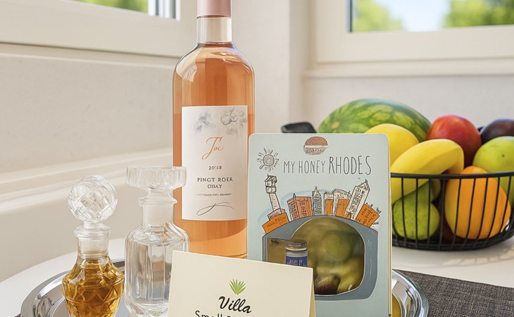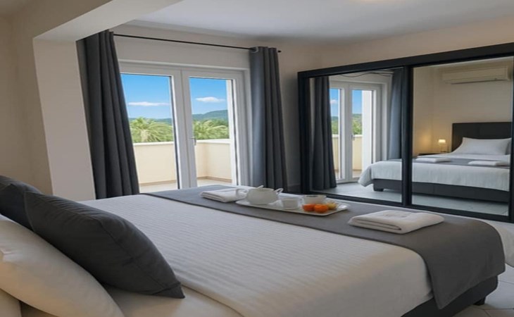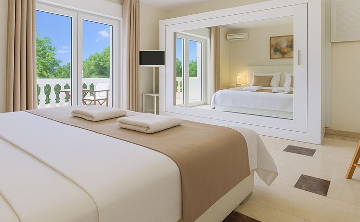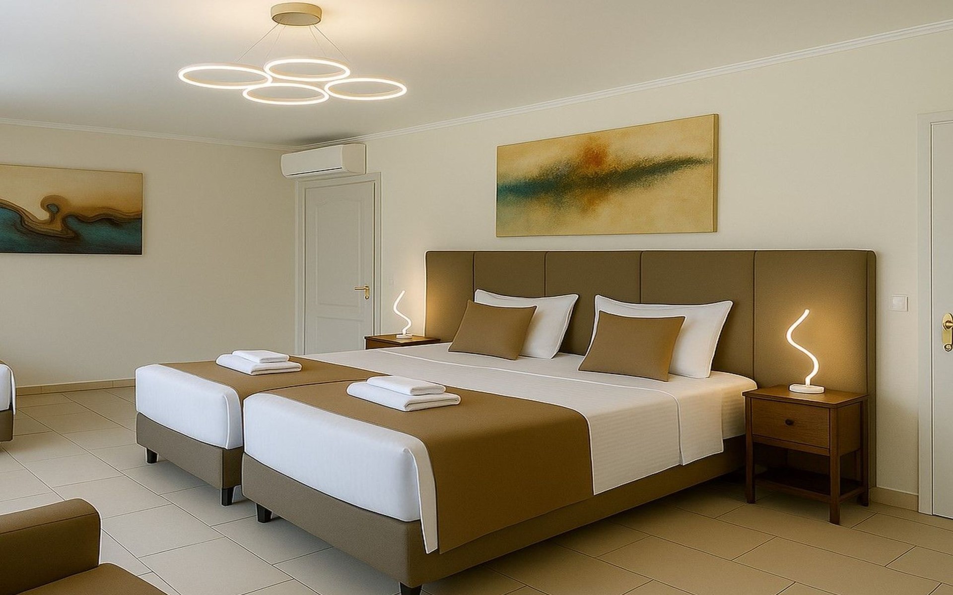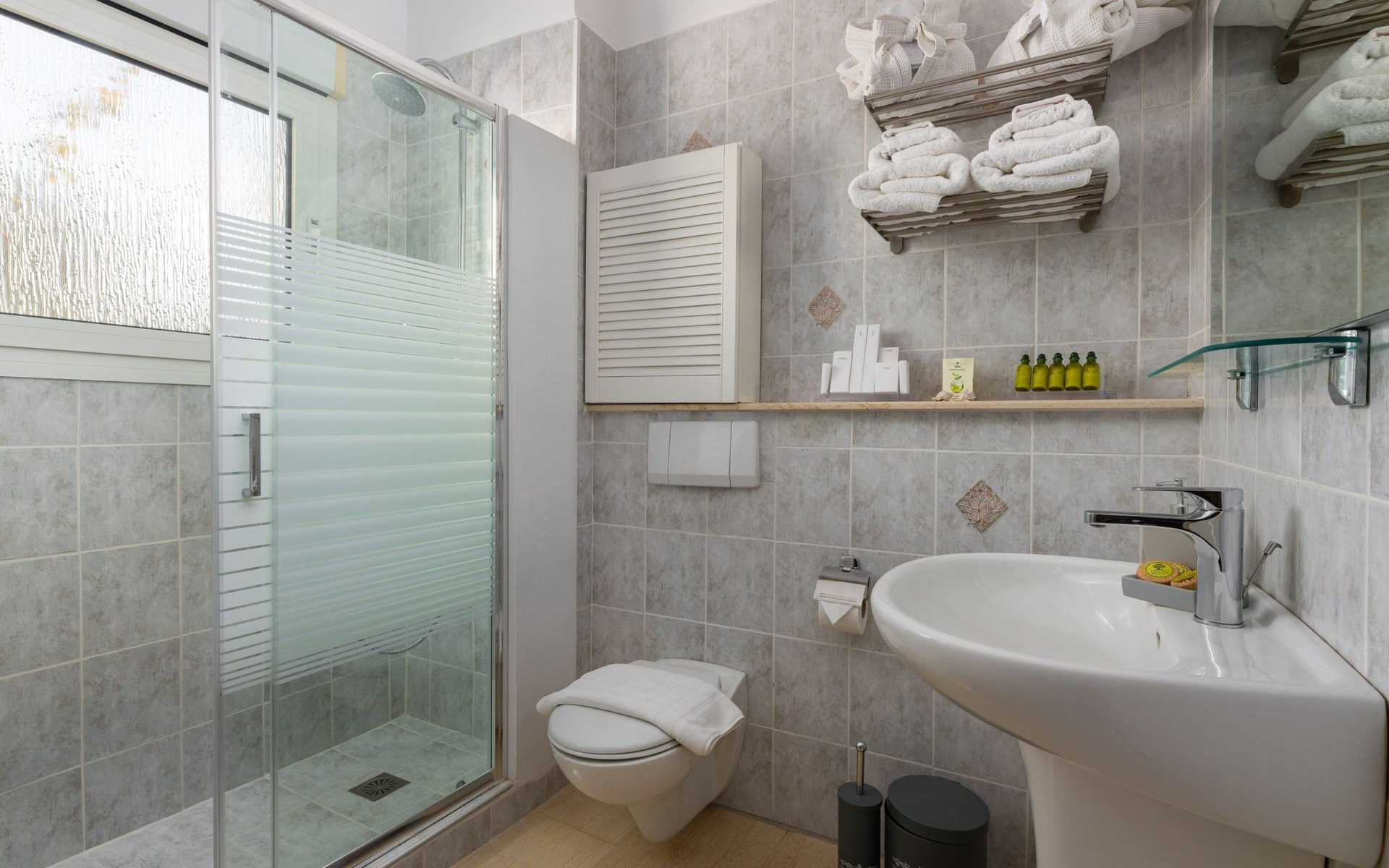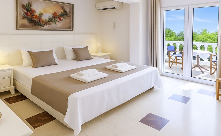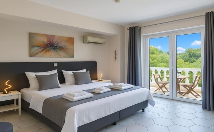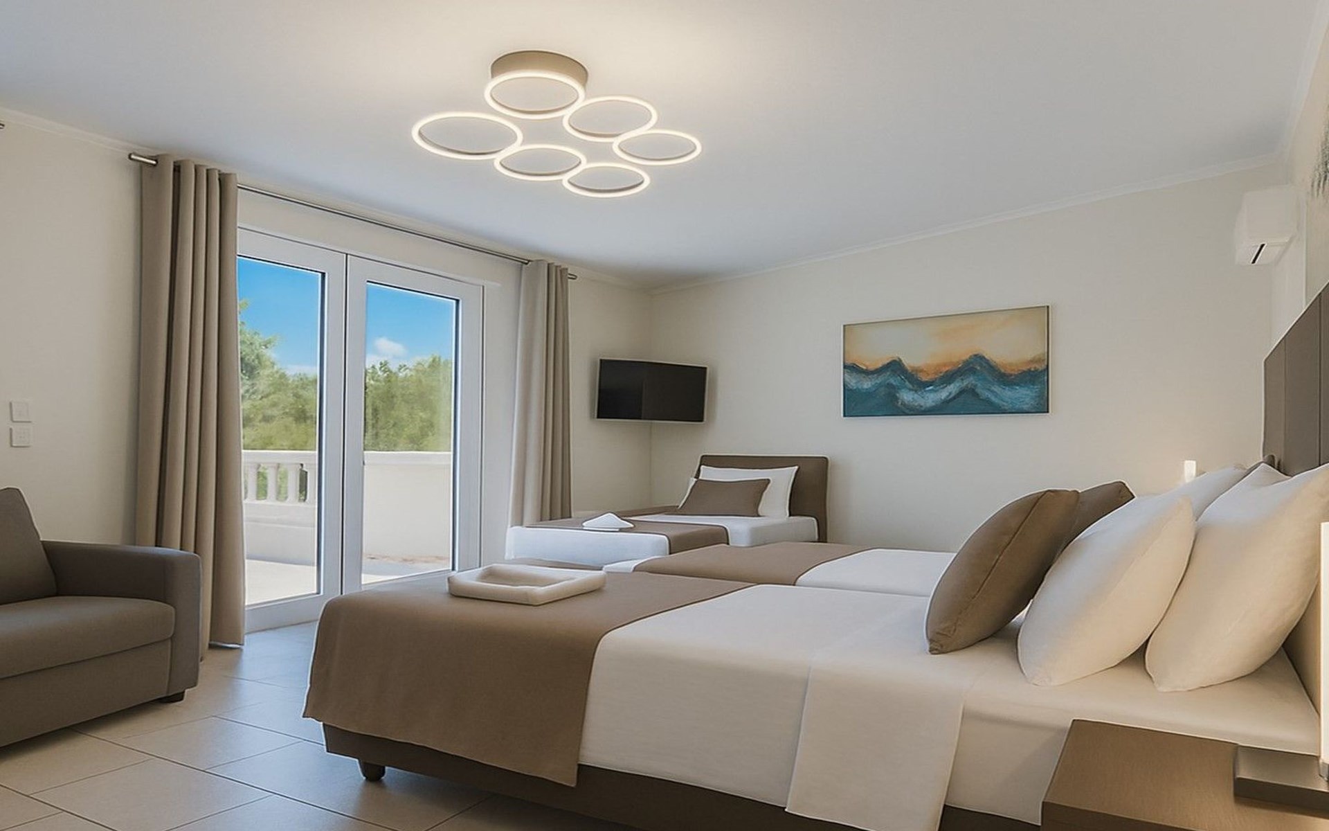 The freshwater swimming pool is adorned with elegant Greek white marble tiles and is surrounded by outdoor furniture. You can sunbathe on stylish loungers with comfortable cushions or relax on the lawn under the shade of the trees.