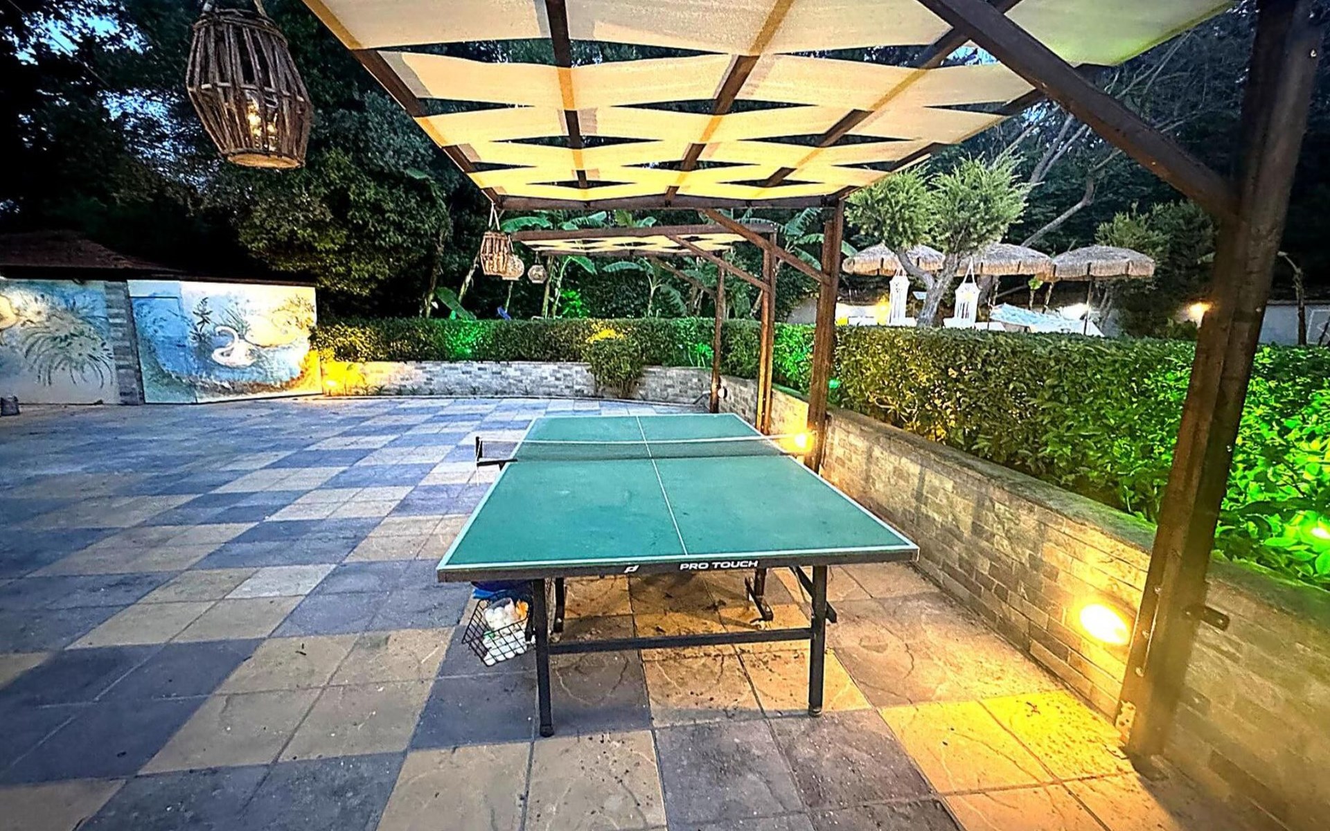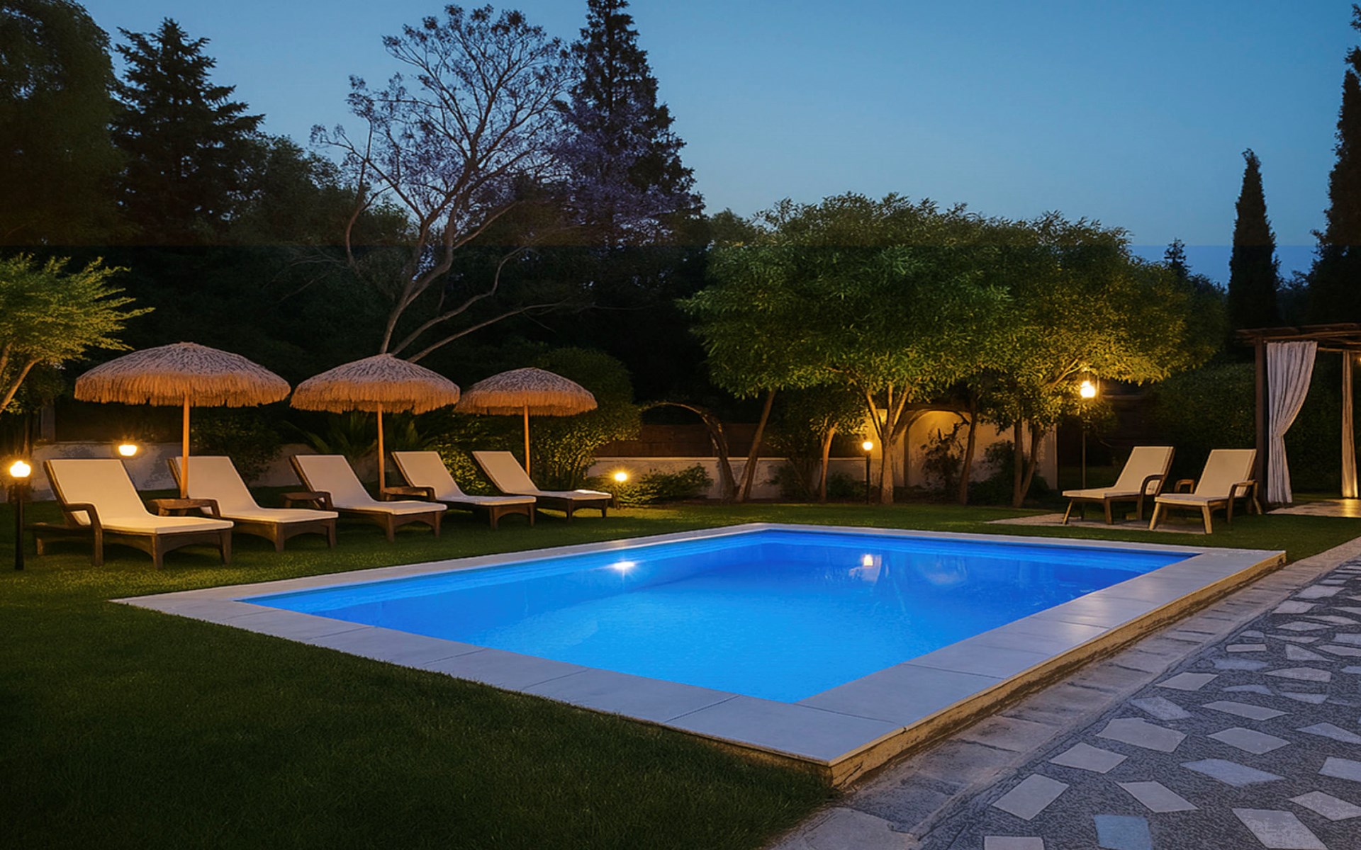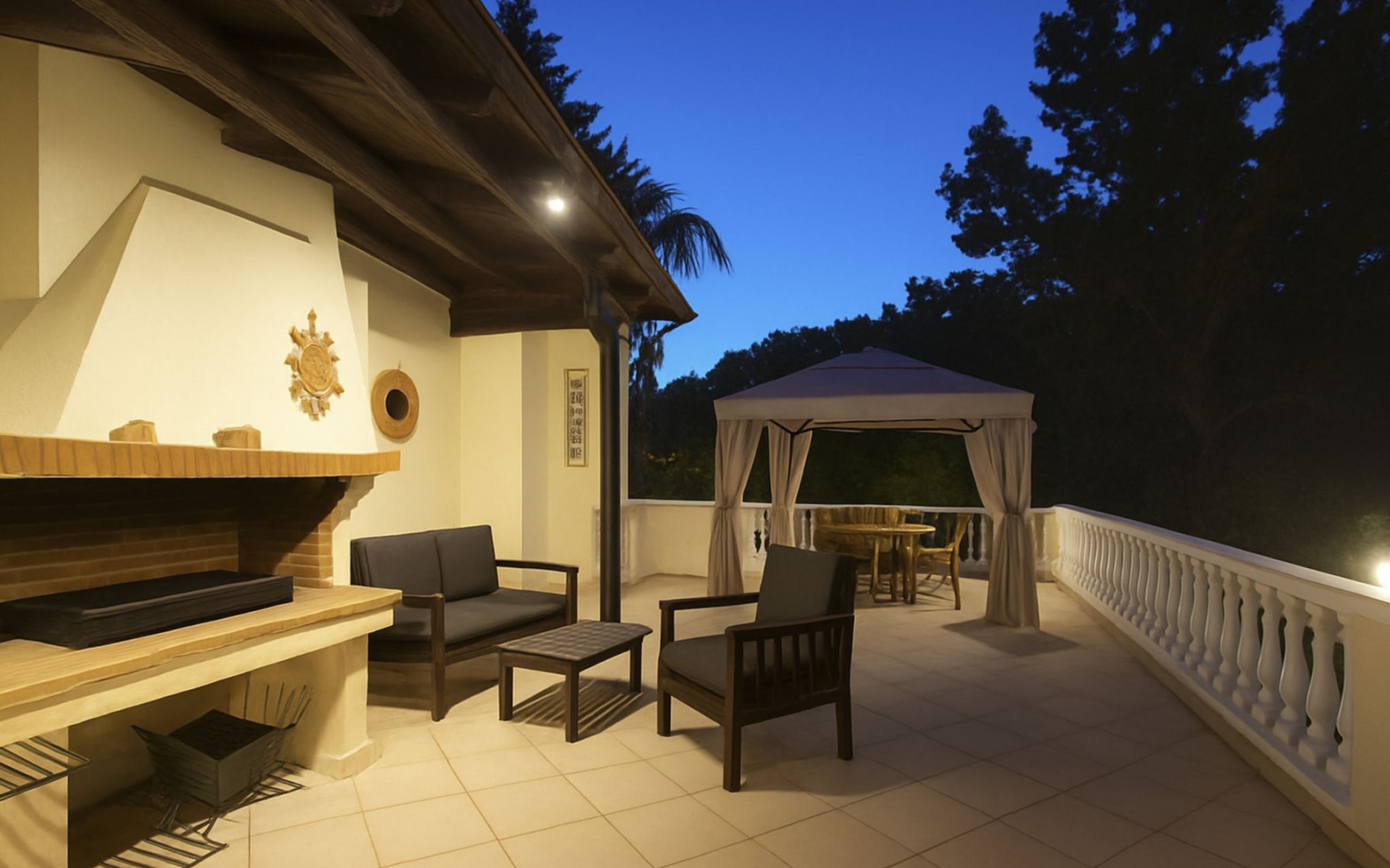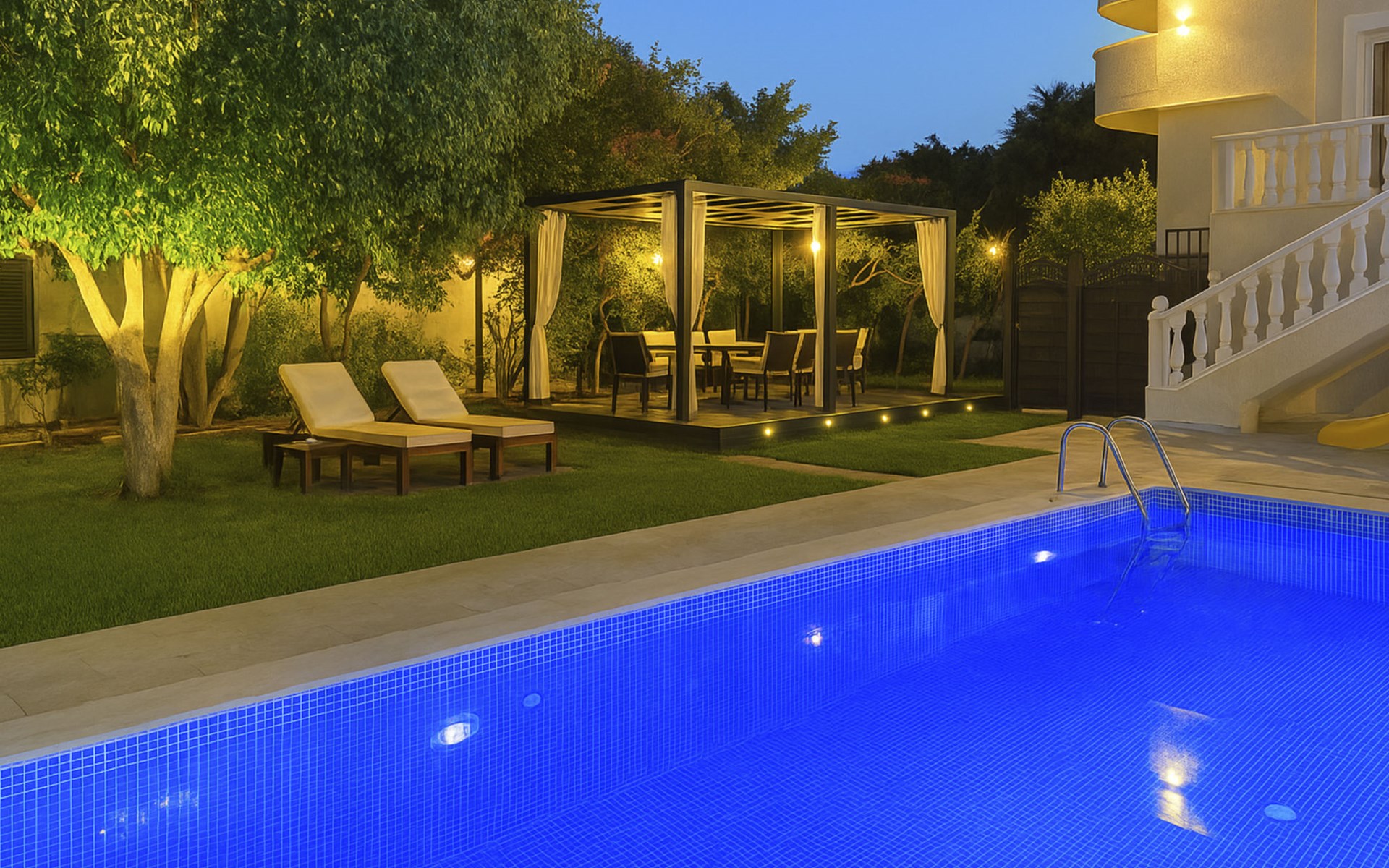 You’ll also enjoy grilling at the large stone BBQ under the pergola and dining at the wooden outdoor table on the veranda. In the evening, unwind with a glass of wine, a drink, or a beer in the beautifully lit garden, listening to the tranquil sounds of the fountain or the pool water, and enjoy a truly relaxing atmosphere and experience.