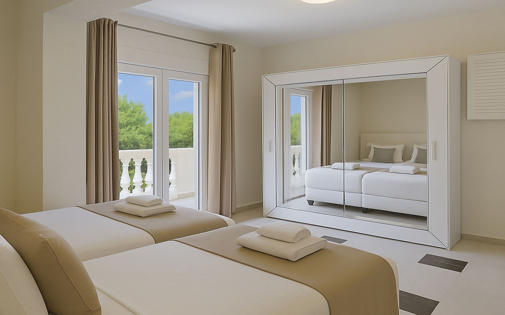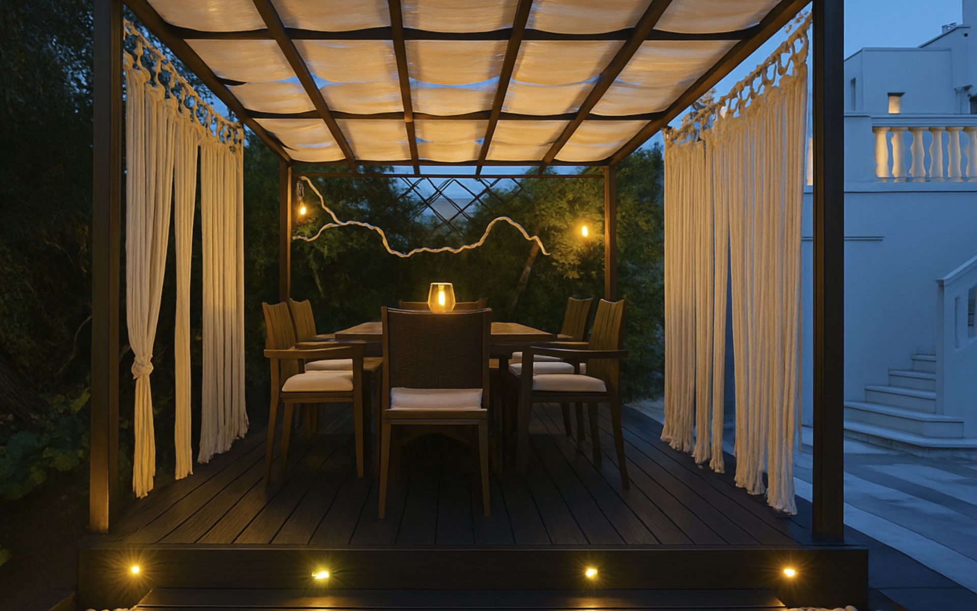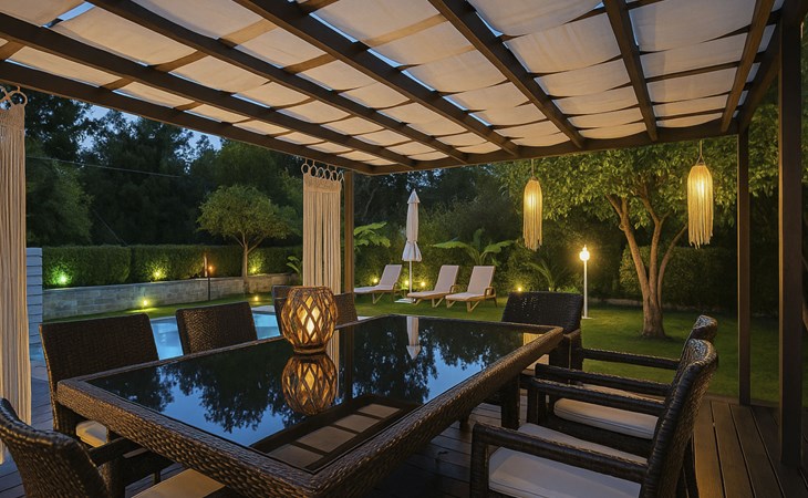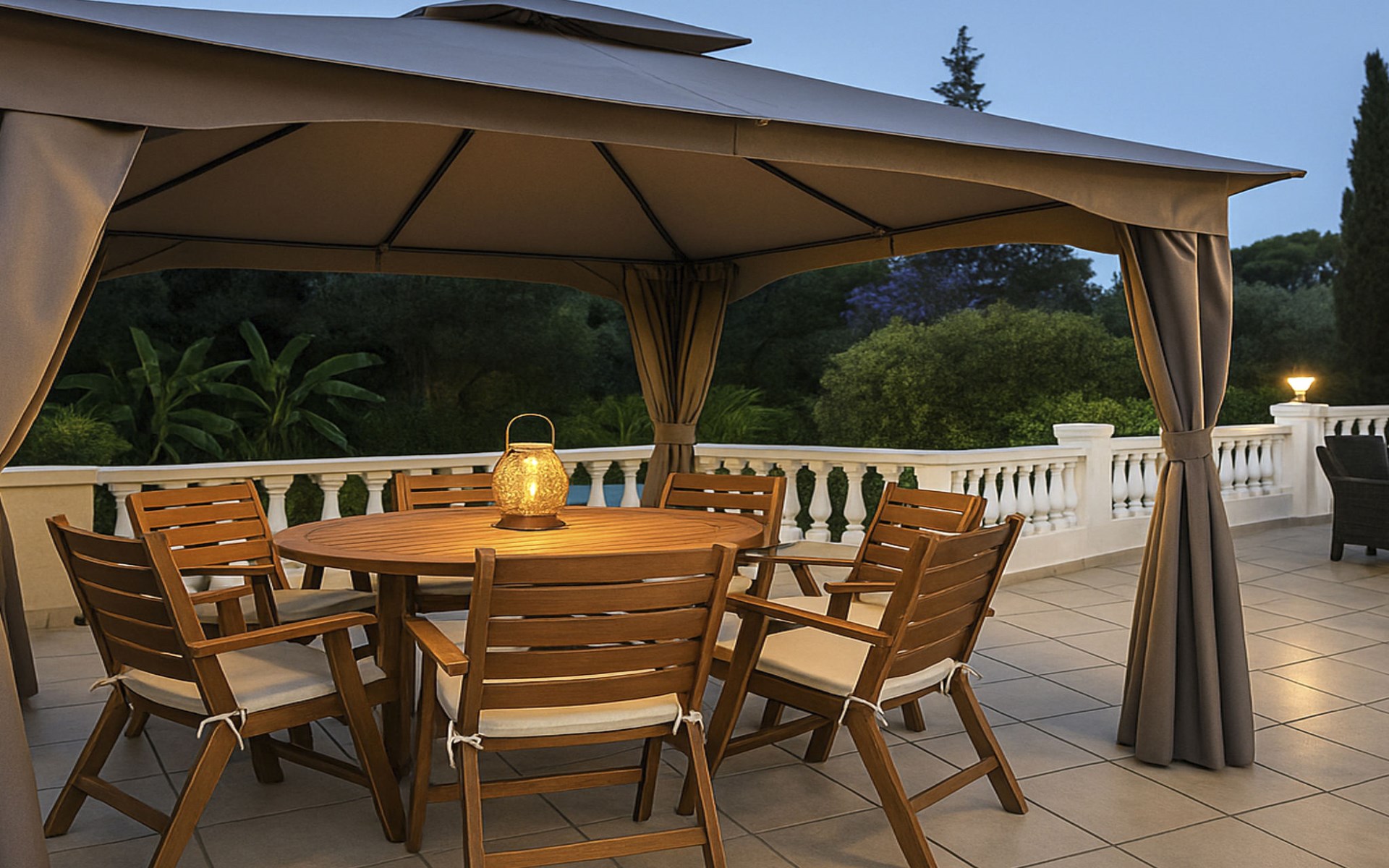 You’ll also enjoy grilling at the large stone BBQ under the pergola and dining at the wooden outdoor table on the veranda. In the evening, unwind with a glass of wine, a drink, or a beer in the beautifully lit garden, listening to the tranquil sounds of the fountain or the pool water, and enjoy a truly relaxing atmosphere and experience.