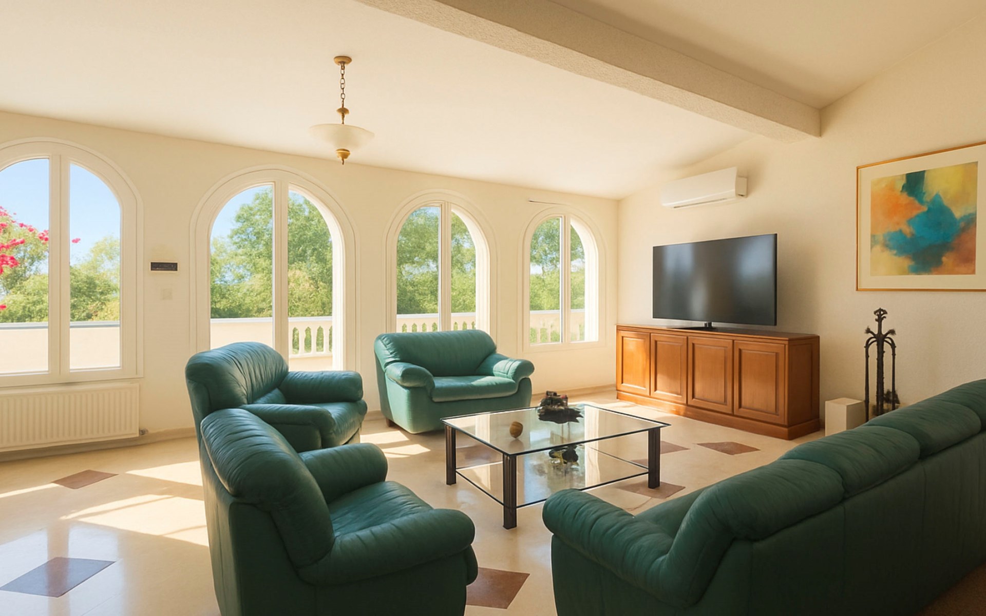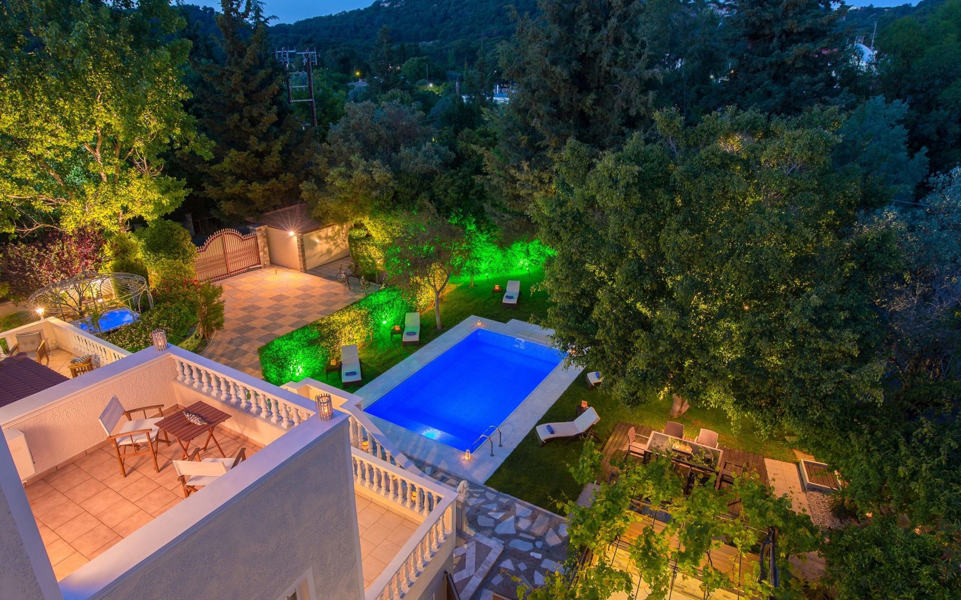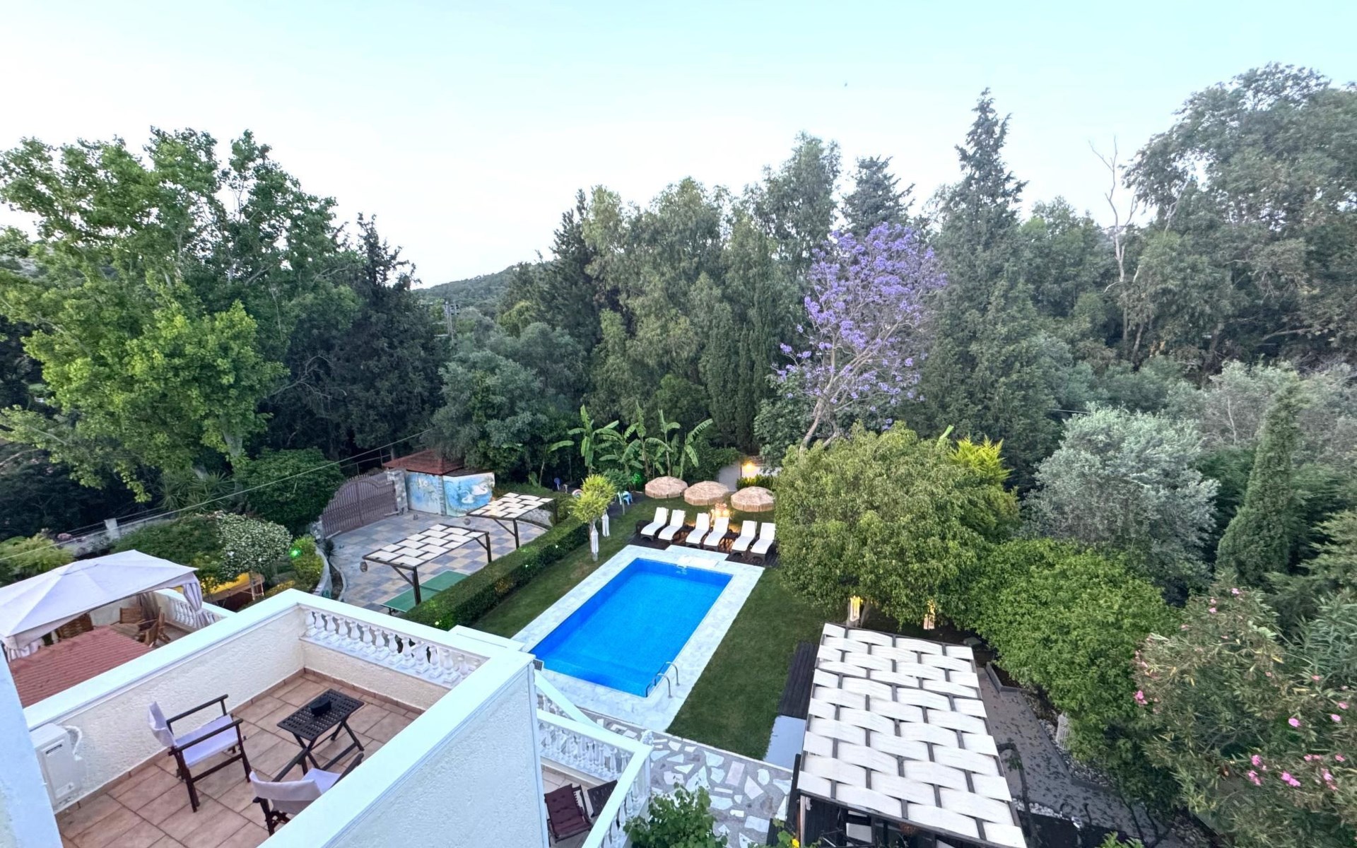 The villa features 3 recently renovated bedrooms accommodating up to 8 guests, 3 bathrooms, a spacious fully equipped kitchen, and a large living room with a dining area. Each bedroom has its own private balcony, and there is also a large veranda offering panoramic views of the lush garden and private pool.
