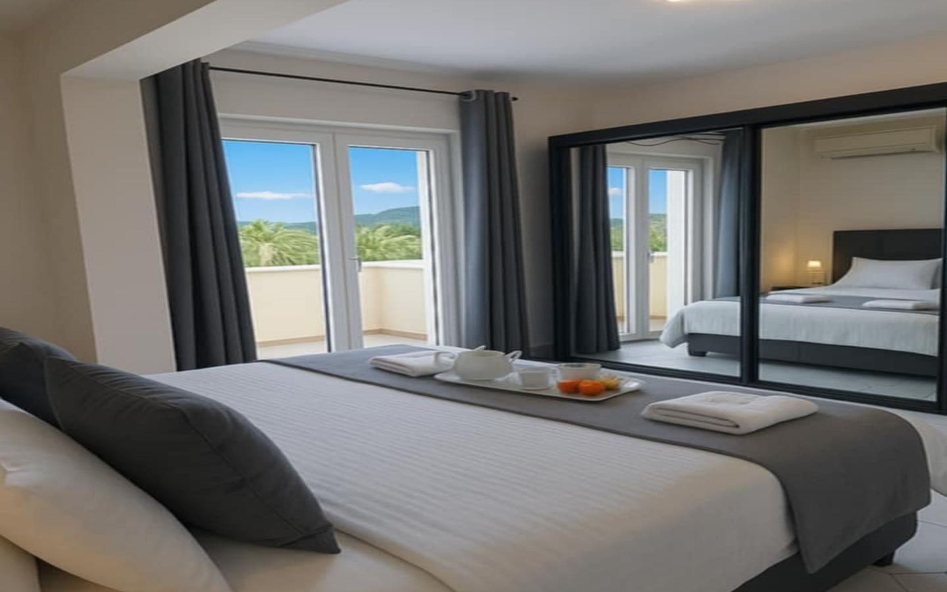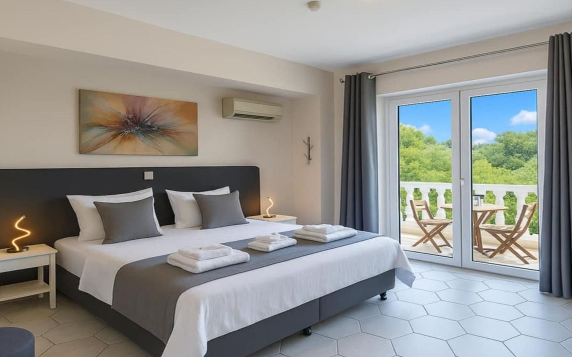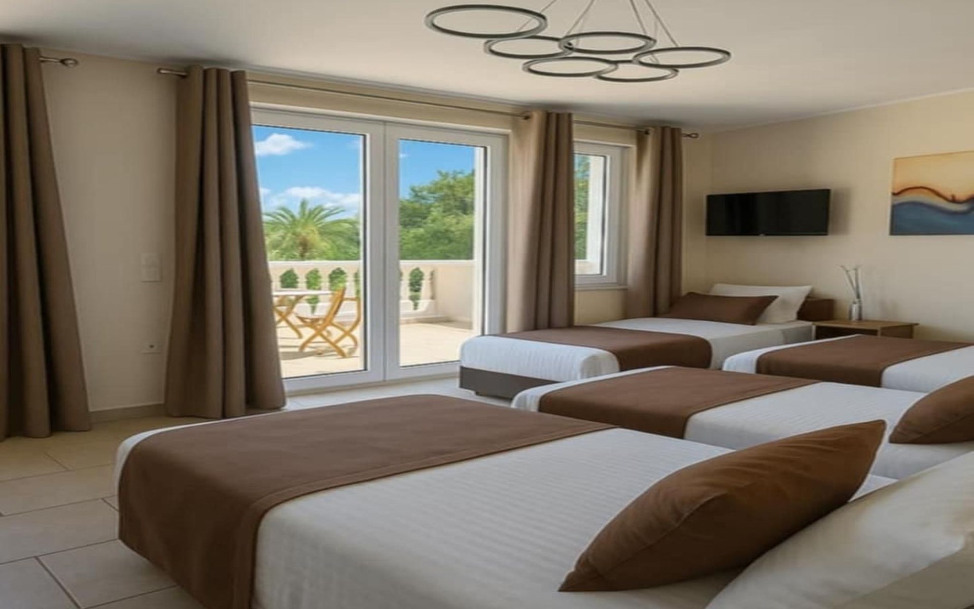 The villa features 3 recently renovated bedrooms accommodating up to 8 guests, 3 bathrooms, a spacious fully equipped kitchen, and a large living room with a dining area. Each bedroom has its own private balcony, and there is also a large veranda offering panoramic views of the lush garden and private pool.