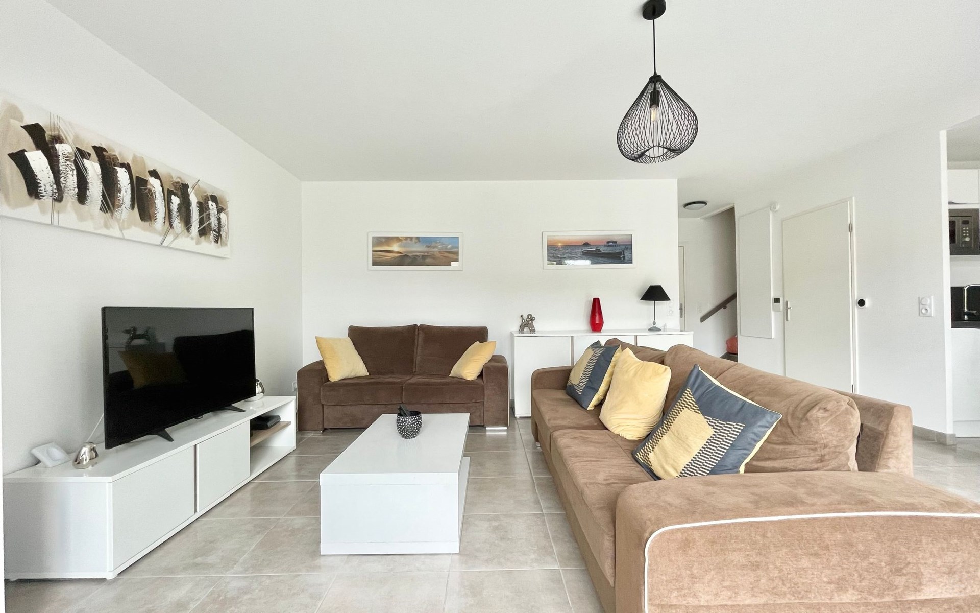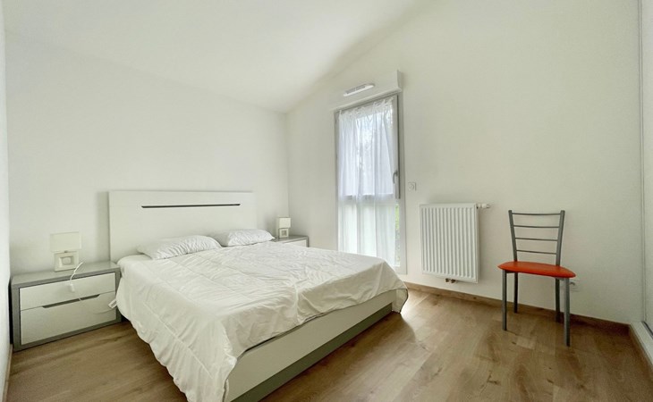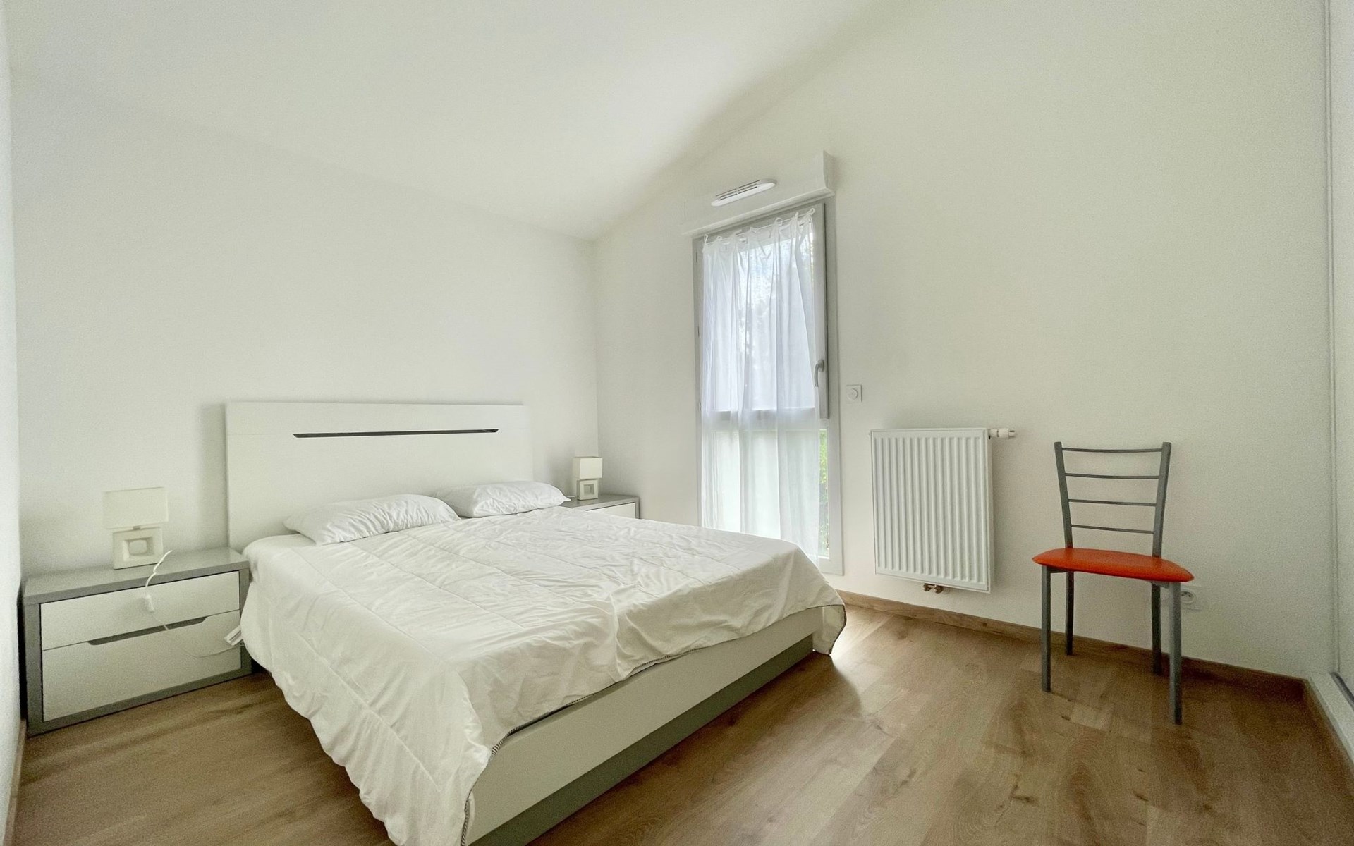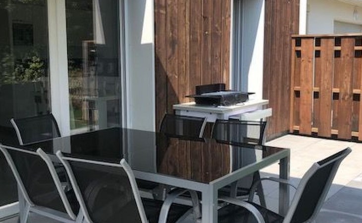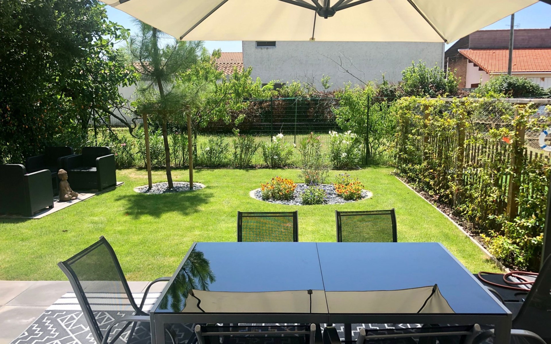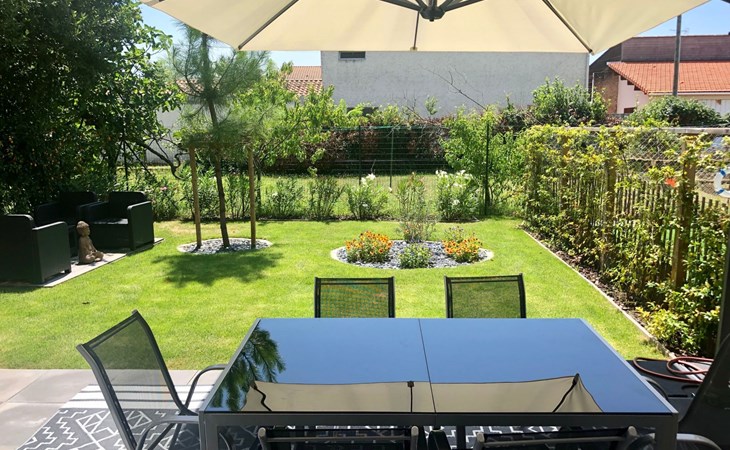 The 60 m² garden is laid to lawn and planted with trees, providing a private, unoverlooked space. A 20 m² terrace, equipped with a parasol, a six-seater dining table and a small electric barbecue, invites you to dine al fresco, while a 6 m² shaded wooden terrace completes this outdoor space with garden furniture, all in an individually fenced plot.