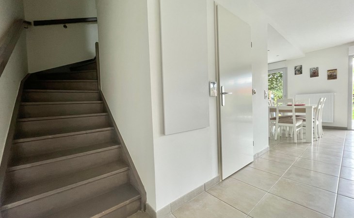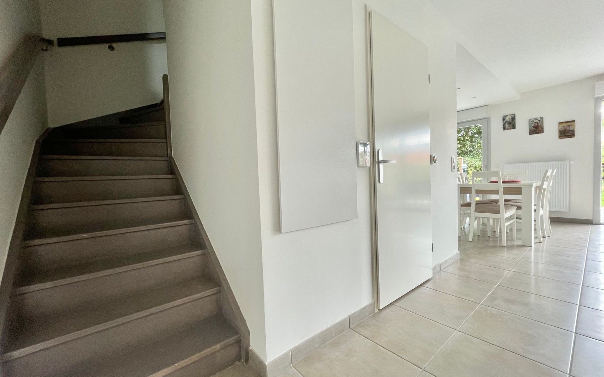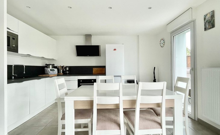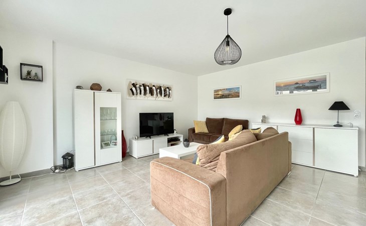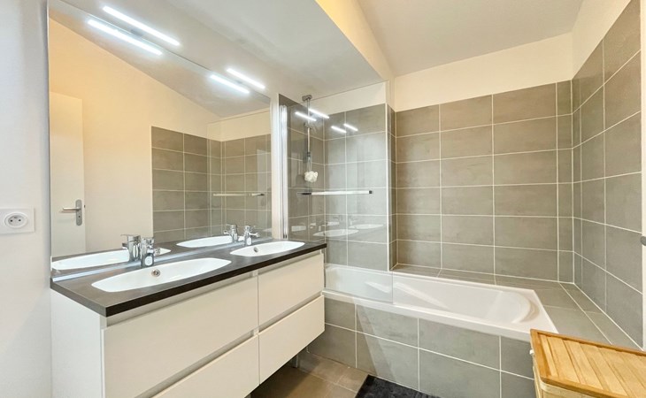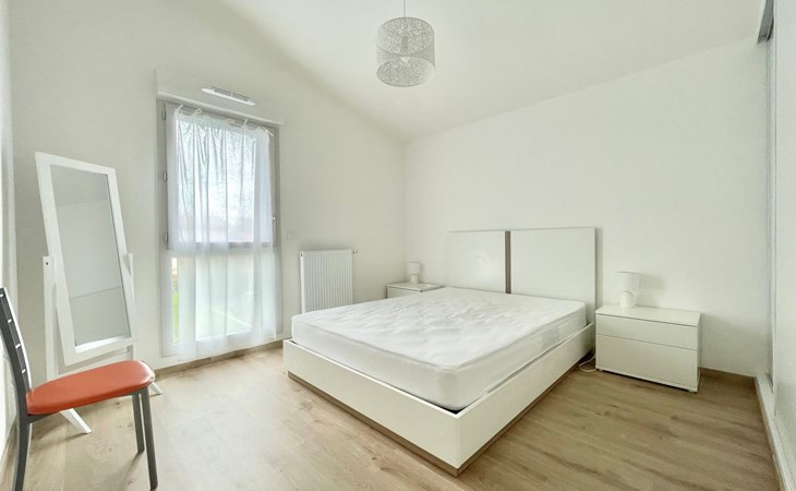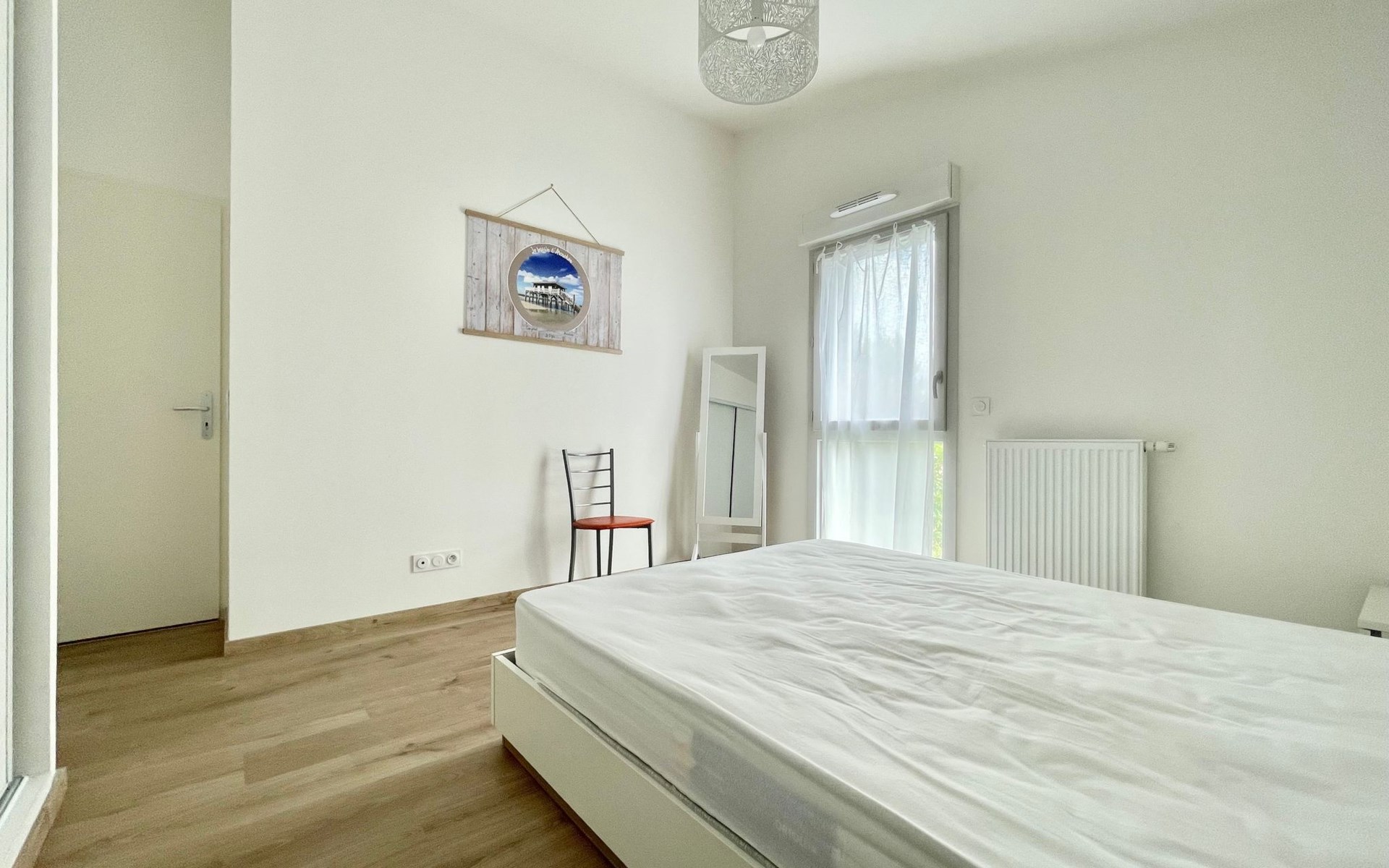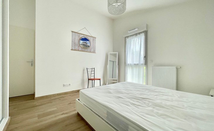 The 60 m² garden is laid to lawn and planted with trees, providing a private, unoverlooked space. A 20 m² terrace, equipped with a parasol, a six-seater dining table and a small electric barbecue, invites you to dine al fresco, while a 6 m² shaded wooden terrace completes this outdoor space with garden furniture, all in an individually fenced plot.