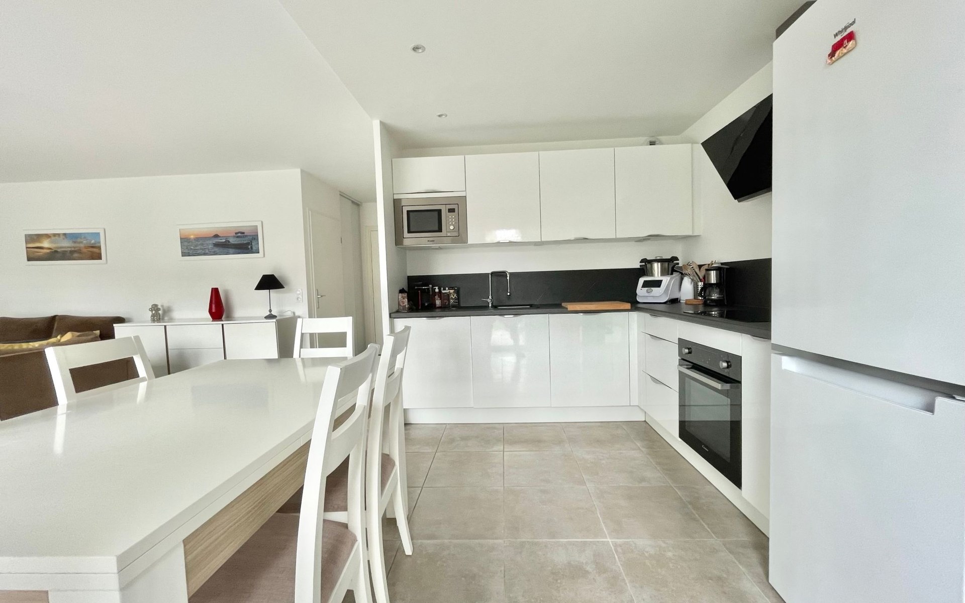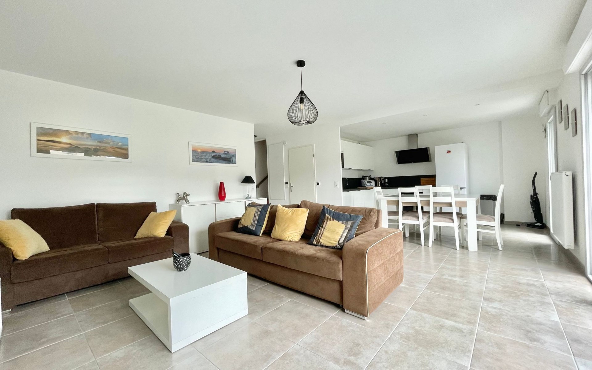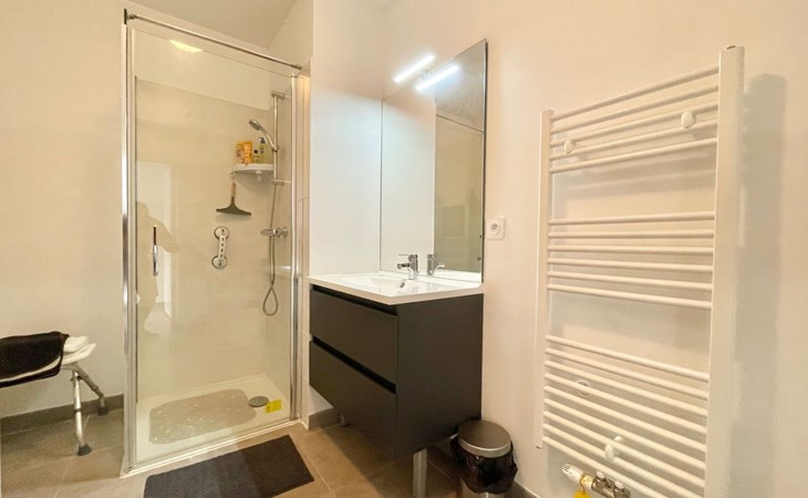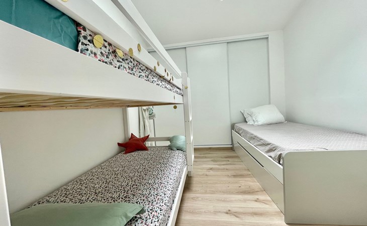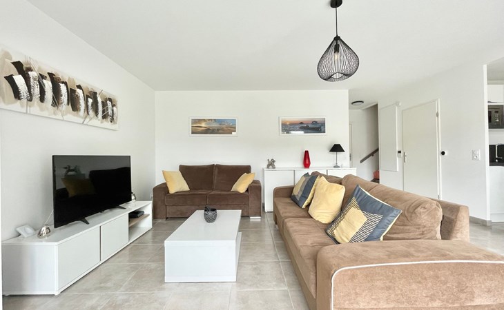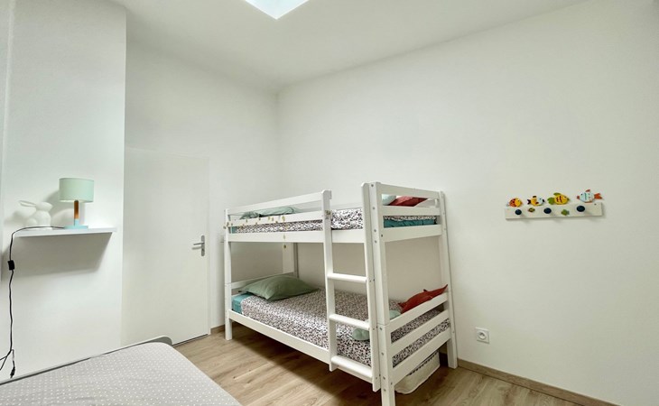 Inside, the accommodation extends over two floors. The ground floor, measuring 48 m², includes an entrance hall with storeroom, a shower room with toilet suitable for people with reduced mobility, as well as a fully-equipped kitchen opening onto a spacious dining room and a large living room with TV and SFR box. The staircase leads to the first floor, where there are two bedrooms with 150 cm beds overlooking the garden, a children's bedroom with a 90 cm bed and an extra 100 cm adult bed, two baby cots, a bathroom with bath/shower and double washbasin, and a separate toilet.
