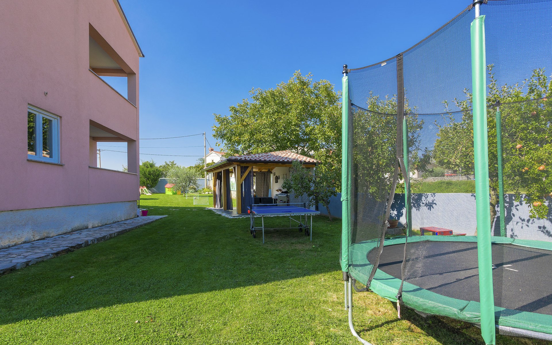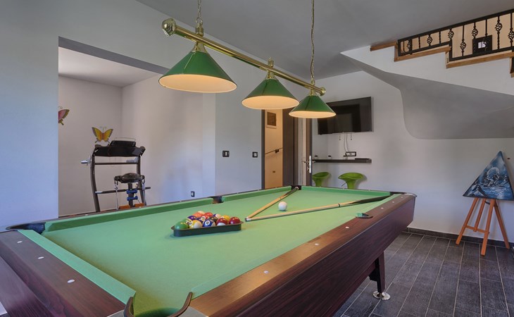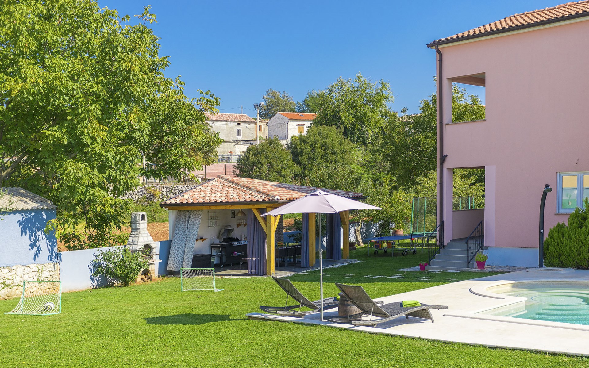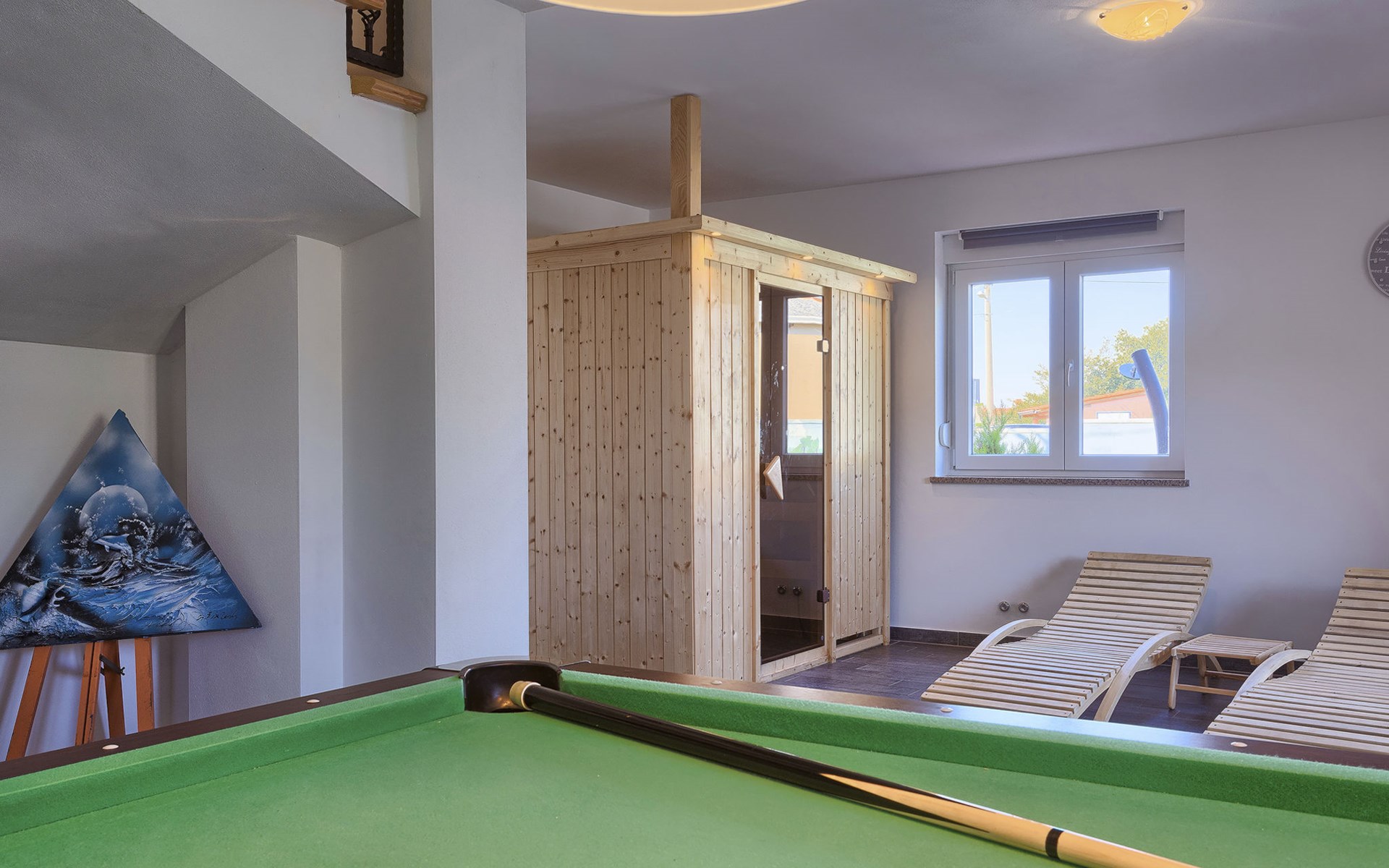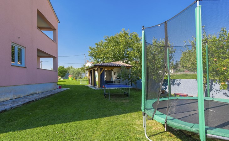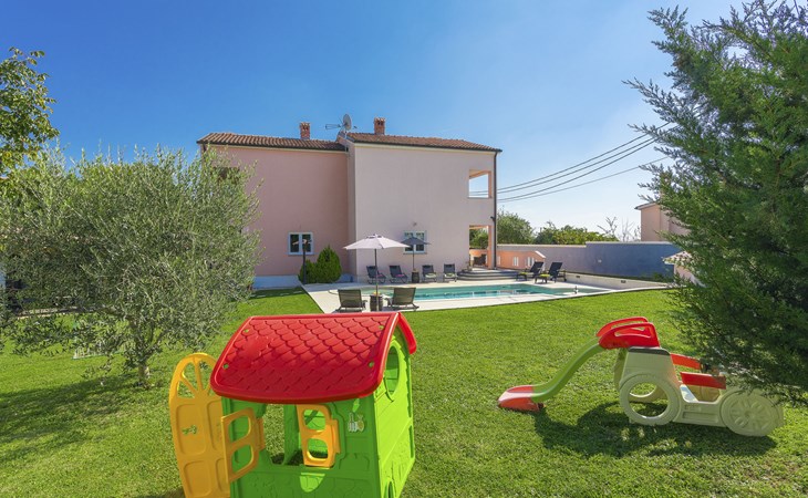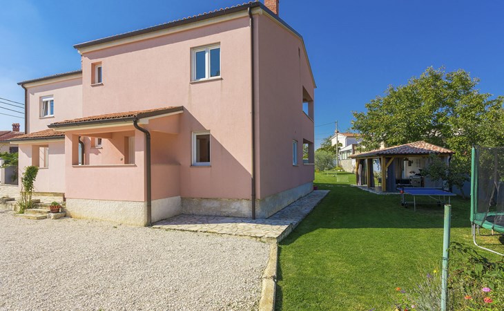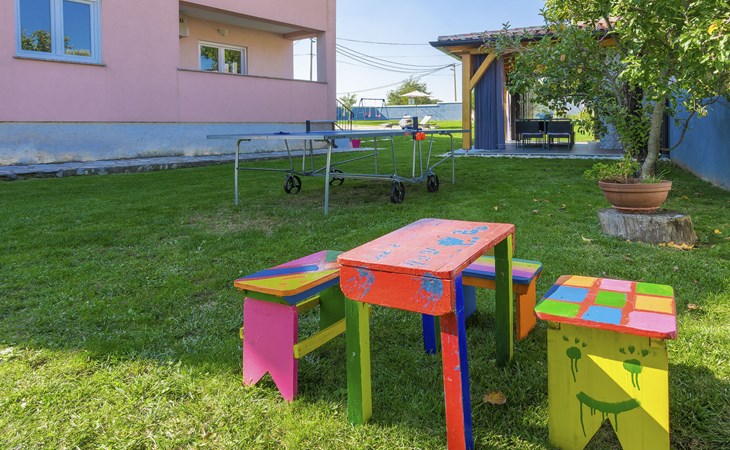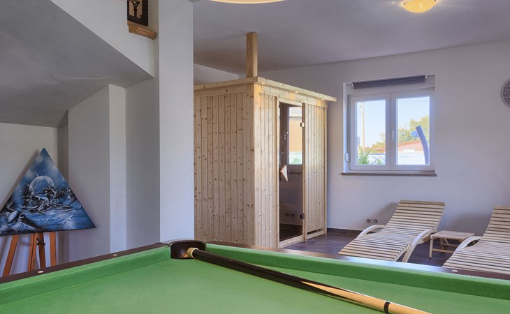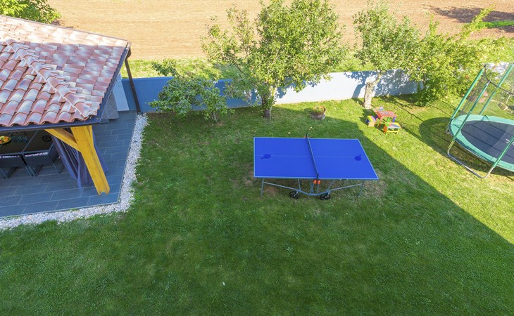 Single-family house "Paus", 2 storeys. In the hamlet Orihi 7 km from the centre of Barban, in a quiet, sunny position, 15 km from the sea. Private: property 1'000 m2 (fenced), garden with lawn and wildlife garden, swimming pool heated (32 m2, depth 140 cm, seasonal availability: 27.Apr. - 26.Oct.) with internal staircase. Unconventional pool shape. Outdoor shower, table tennis, terrace (40 m2), garden furniture, barbecue, children's playground (slide, swing). In the house: internet access, sauna, billiard table, trampoline, washing machine. Parking at the house on the premises. Shop 50 m, restaurant 250 m, bus stop 3 km, pebble beach 15 km. Riding stable 15 km, walking paths from the house 100 m, cycle lane 150 m. Nearby attractions: Adrenalin park 15 km. Groups of teenagers are not allowed.