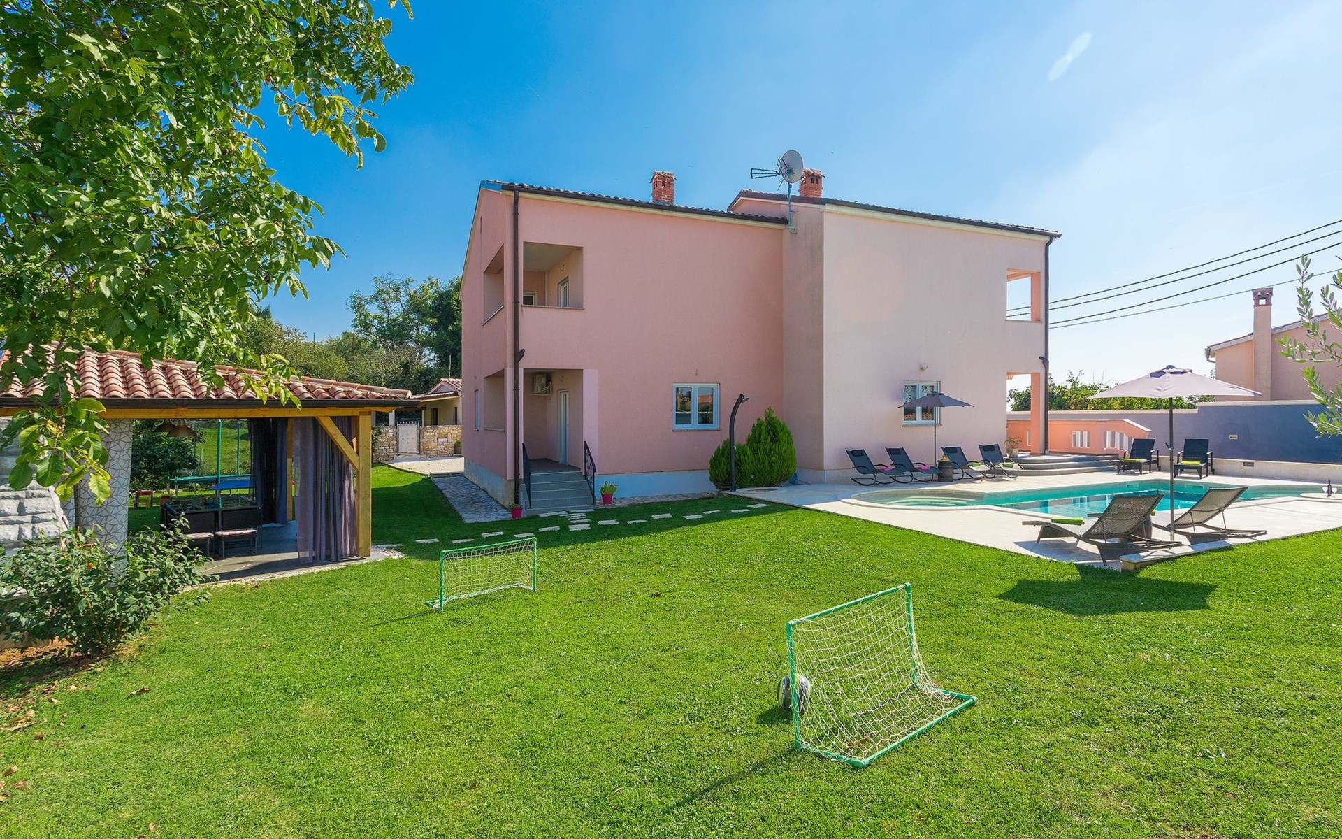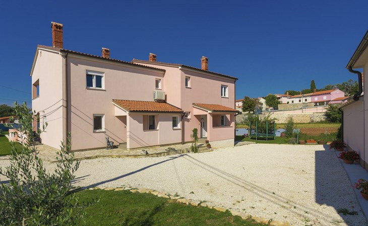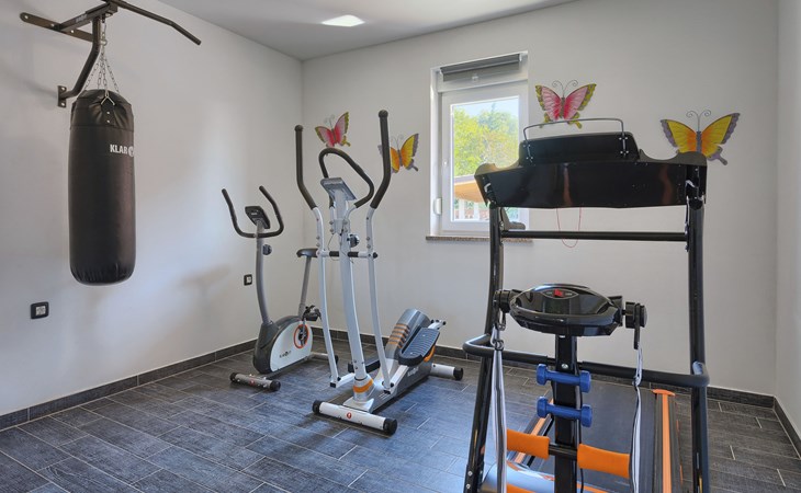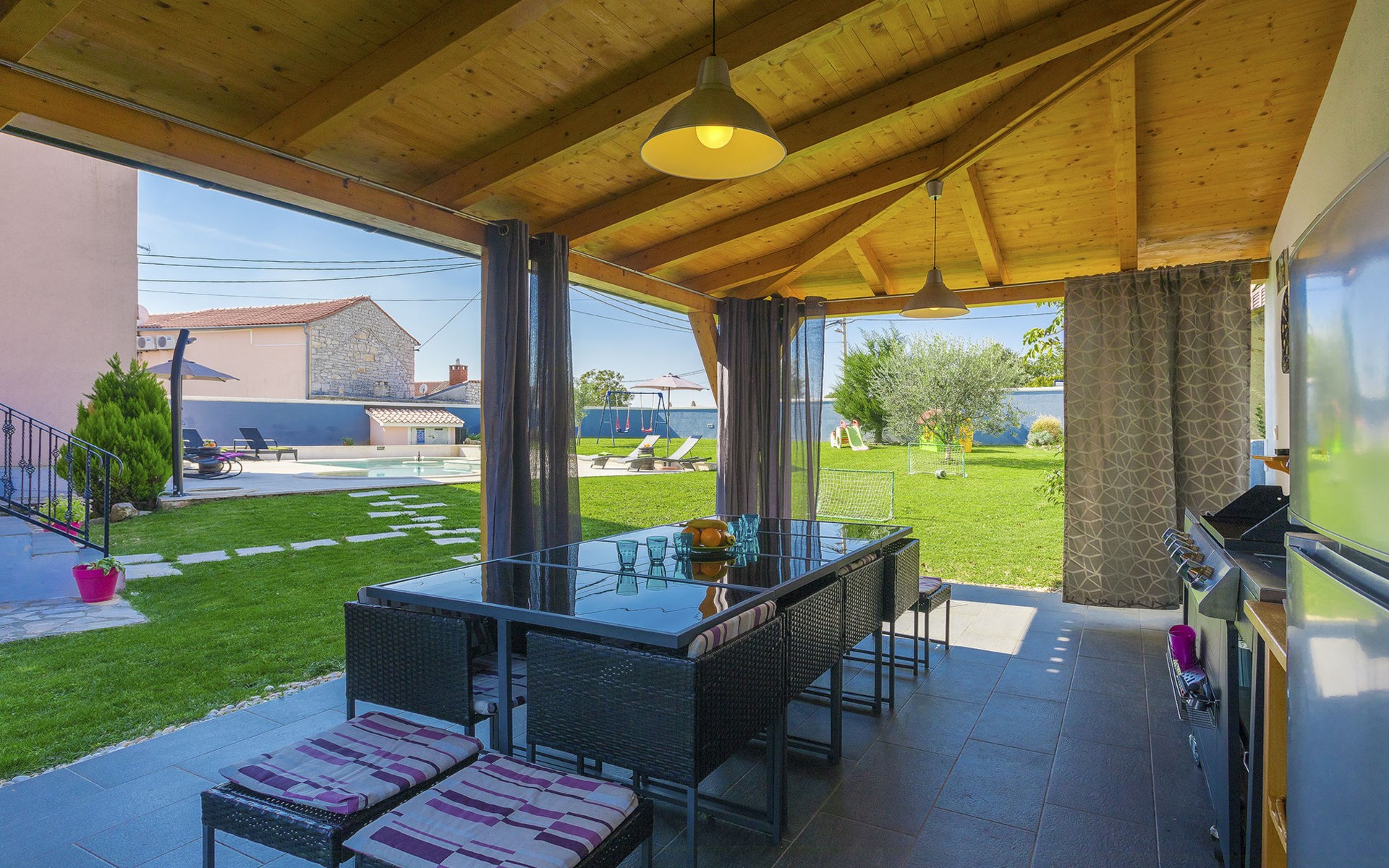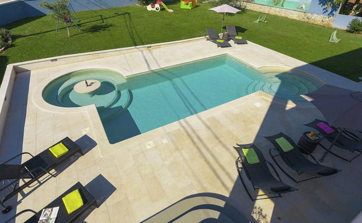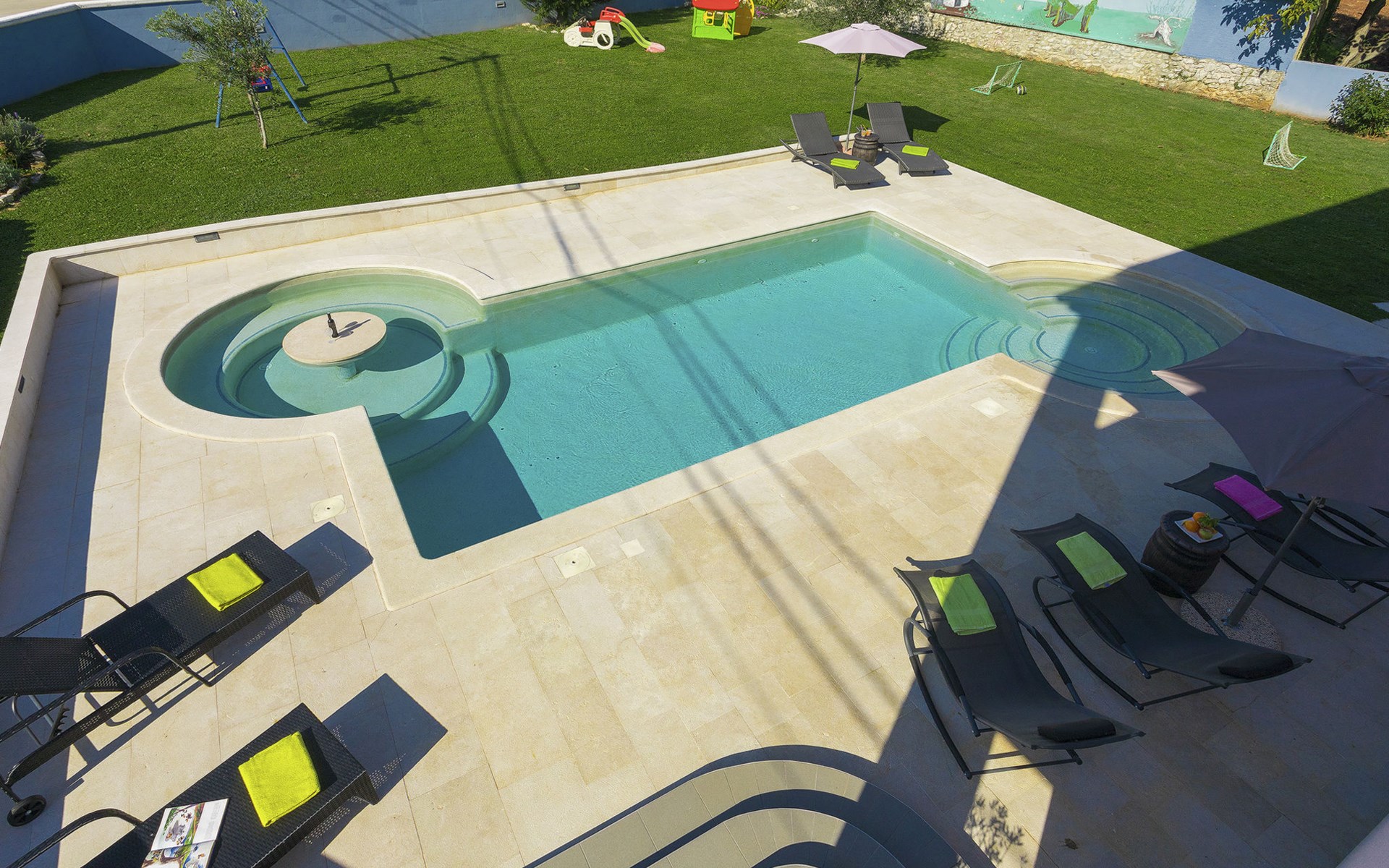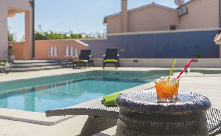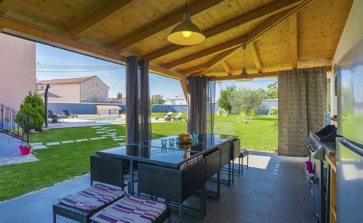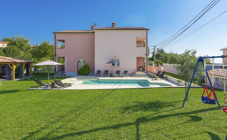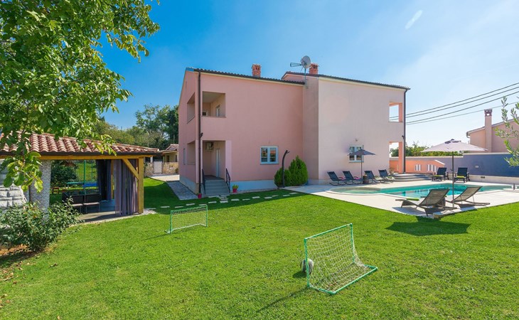 Single-family house "Paus", 2 storeys. In the hamlet Orihi 7 km from the centre of Barban, in a quiet, sunny position, 15 km from the sea. Private: property 1'000 m2 (fenced), garden with lawn and wildlife garden, swimming pool heated (32 m2, depth 140 cm, seasonal availability: 27.Apr. - 26.Oct.) with internal staircase. Unconventional pool shape. Outdoor shower, table tennis, terrace (40 m2), garden furniture, barbecue, children's playground (slide, swing). In the house: internet access, sauna, billiard table, trampoline, washing machine. Parking at the house on the premises. Shop 50 m, restaurant 250 m, bus stop 3 km, pebble beach 15 km. Riding stable 15 km, walking paths from the house 100 m, cycle lane 150 m. Nearby attractions: Adrenalin park 15 km. Groups of teenagers are not allowed.