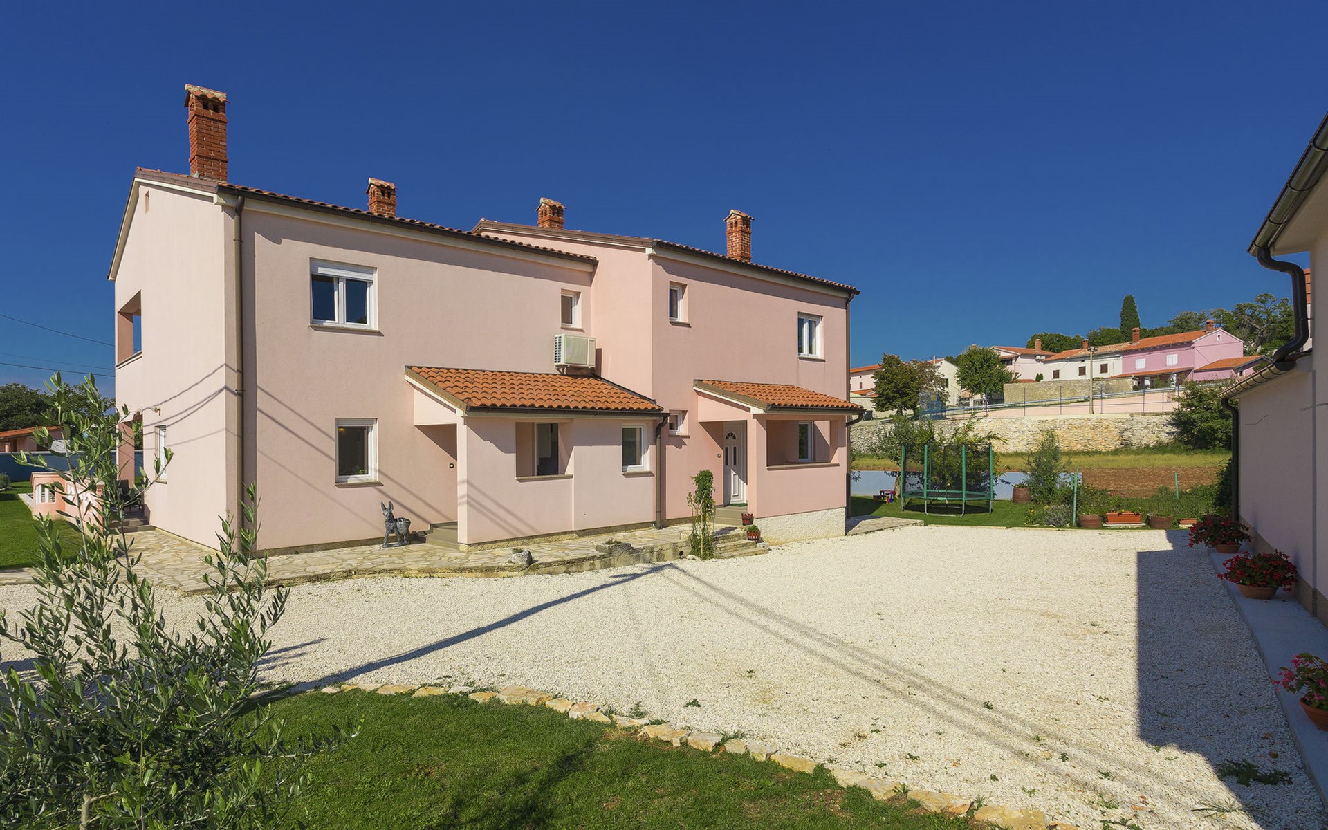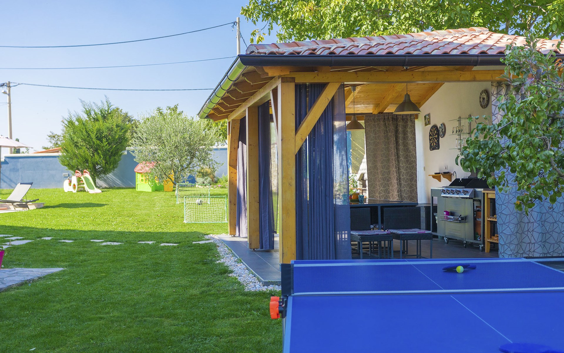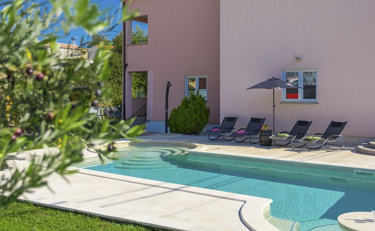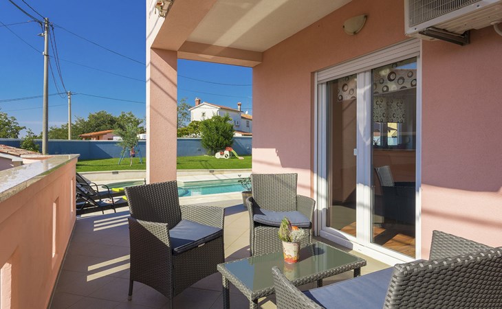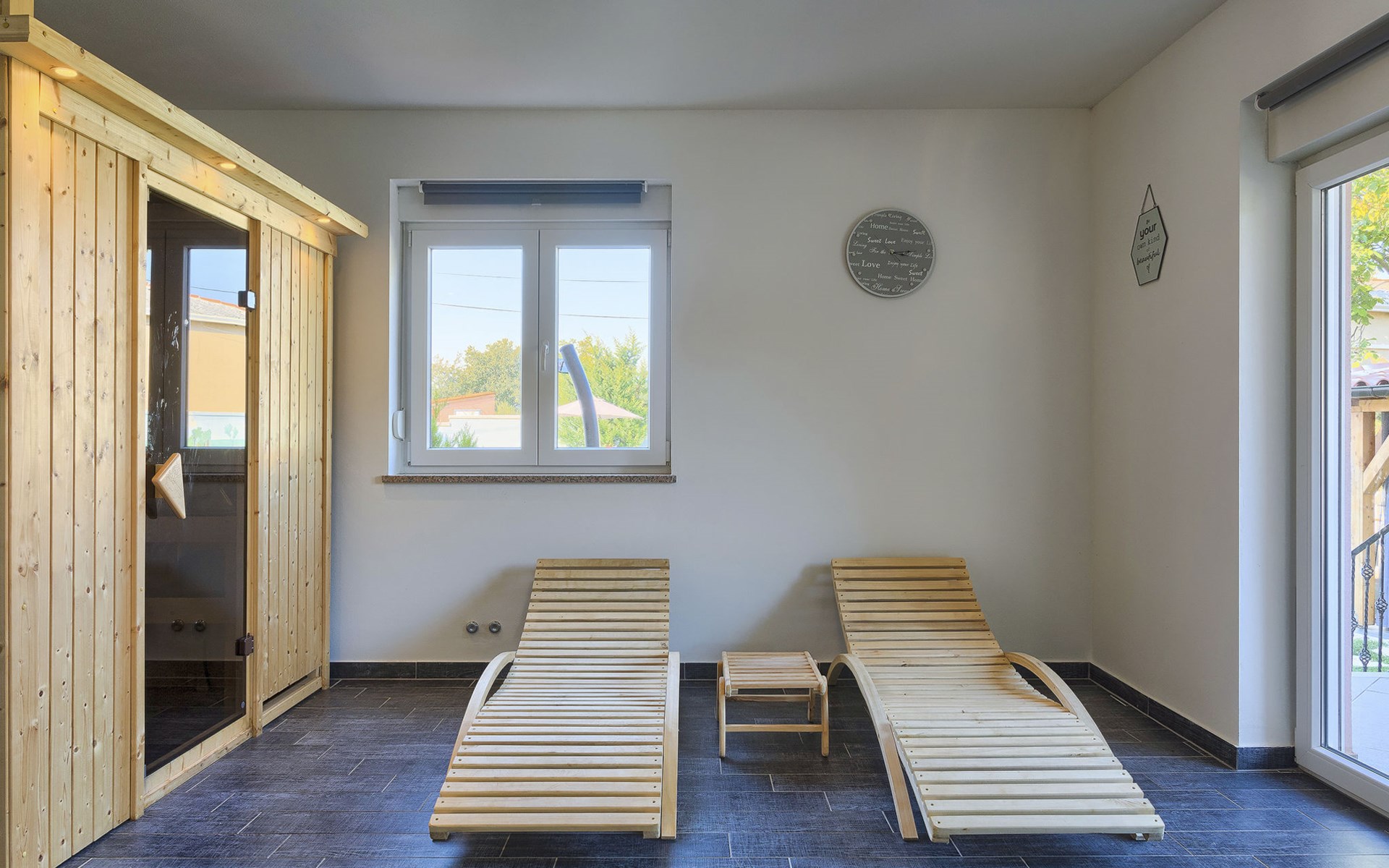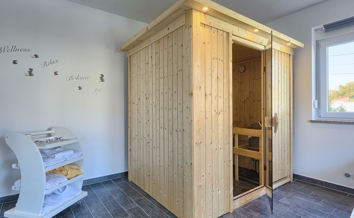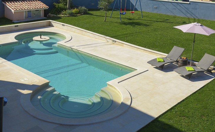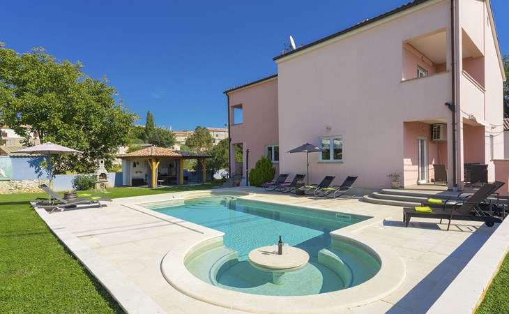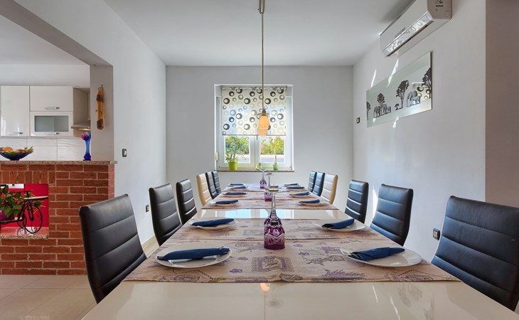 Single-family house "Paus", 2 storeys. In the hamlet Orihi 7 km from the centre of Barban, in a quiet, sunny position, 15 km from the sea. Private: property 1'000 m2 (fenced), garden with lawn and wildlife garden, swimming pool heated (32 m2, depth 140 cm, seasonal availability: 27.Apr. - 26.Oct.) with internal staircase. Unconventional pool shape. Outdoor shower, table tennis, terrace (40 m2), garden furniture, barbecue, children's playground (slide, swing). In the house: internet access, sauna, billiard table, trampoline, washing machine. Parking at the house on the premises. Shop 50 m, restaurant 250 m, bus stop 3 km, pebble beach 15 km. Riding stable 15 km, walking paths from the house 100 m, cycle lane 150 m. Nearby attractions: Adrenalin park 15 km. Groups of teenagers are not allowed.