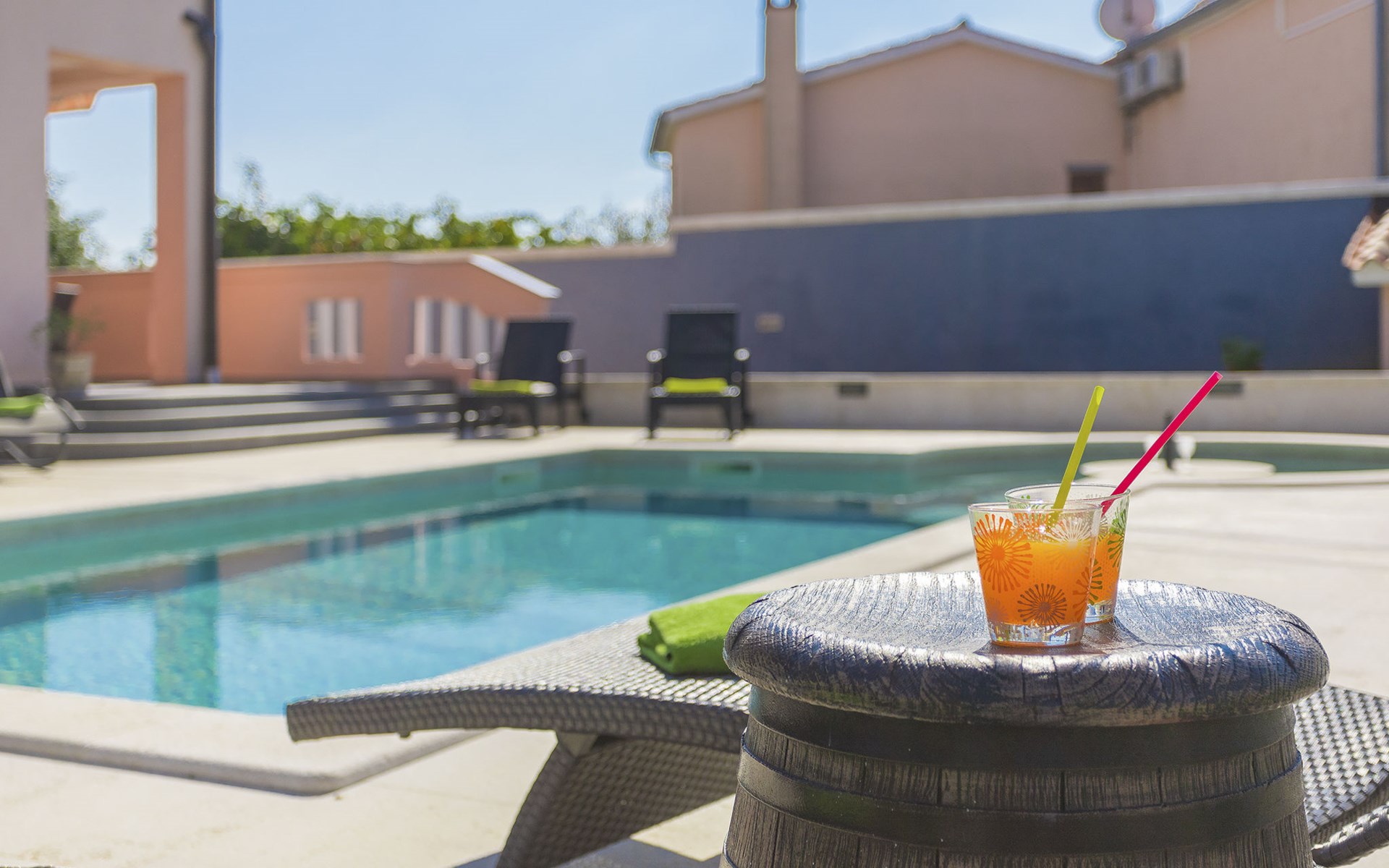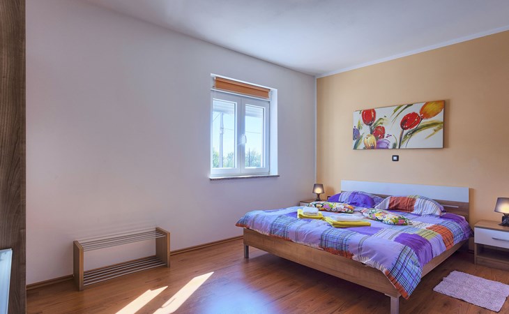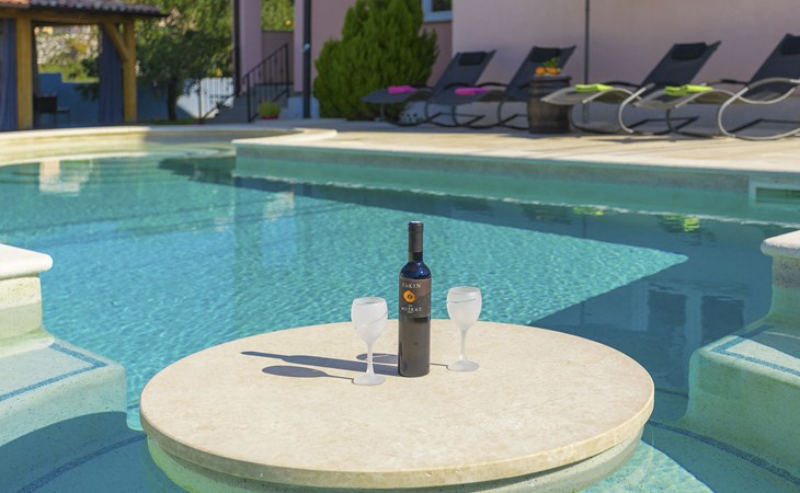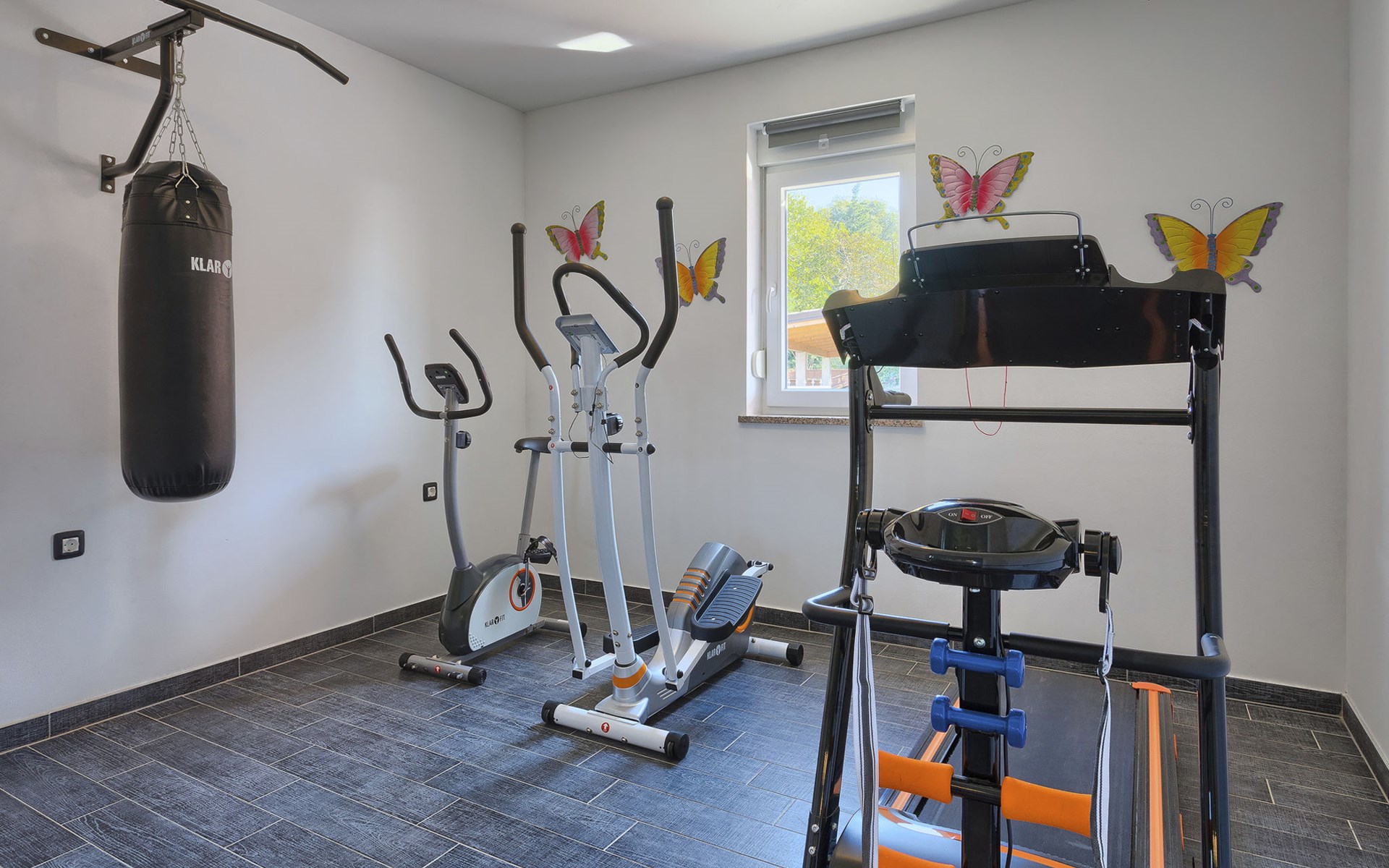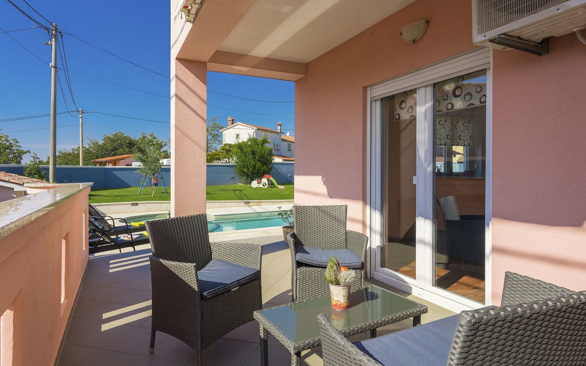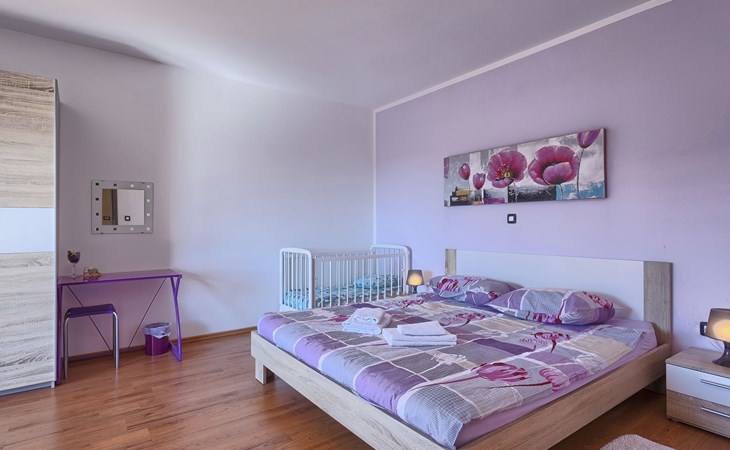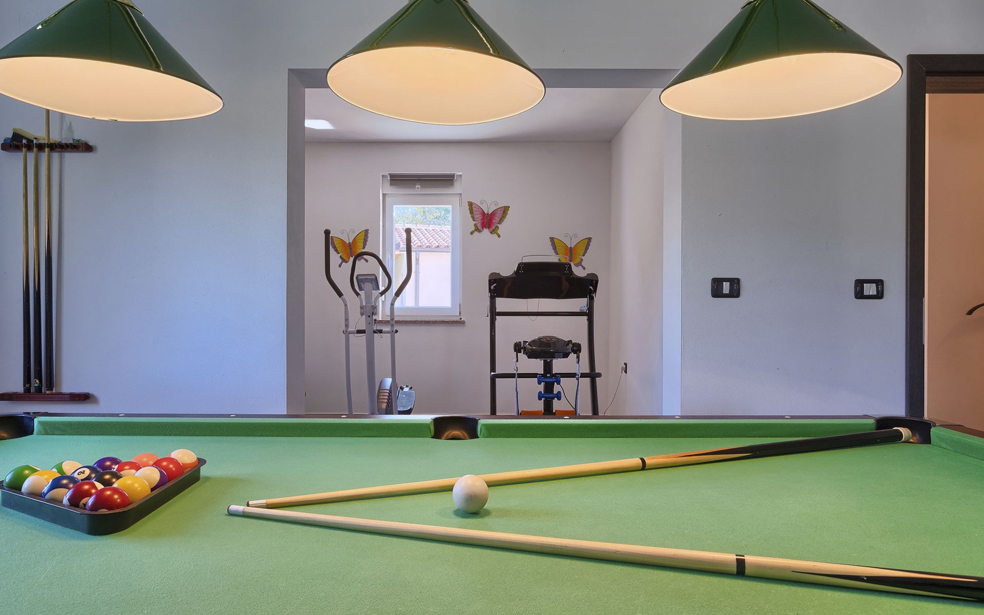 Single-family house "Paus", 2 storeys. In the hamlet Orihi 7 km from the centre of Barban, in a quiet, sunny position, 15 km from the sea. Private: property 1'000 m2 (fenced), garden with lawn and wildlife garden, swimming pool heated (32 m2, depth 140 cm, seasonal availability: 27.Apr. - 26.Oct.) with internal staircase. Unconventional pool shape. Outdoor shower, table tennis, terrace (40 m2), garden furniture, barbecue, children's playground (slide, swing). In the house: internet access, sauna, billiard table, trampoline, washing machine. Parking at the house on the premises. Shop 50 m, restaurant 250 m, bus stop 3 km, pebble beach 15 km. Riding stable 15 km, walking paths from the house 100 m, cycle lane 150 m. Nearby attractions: Adrenalin park 15 km. Groups of teenagers are not allowed.