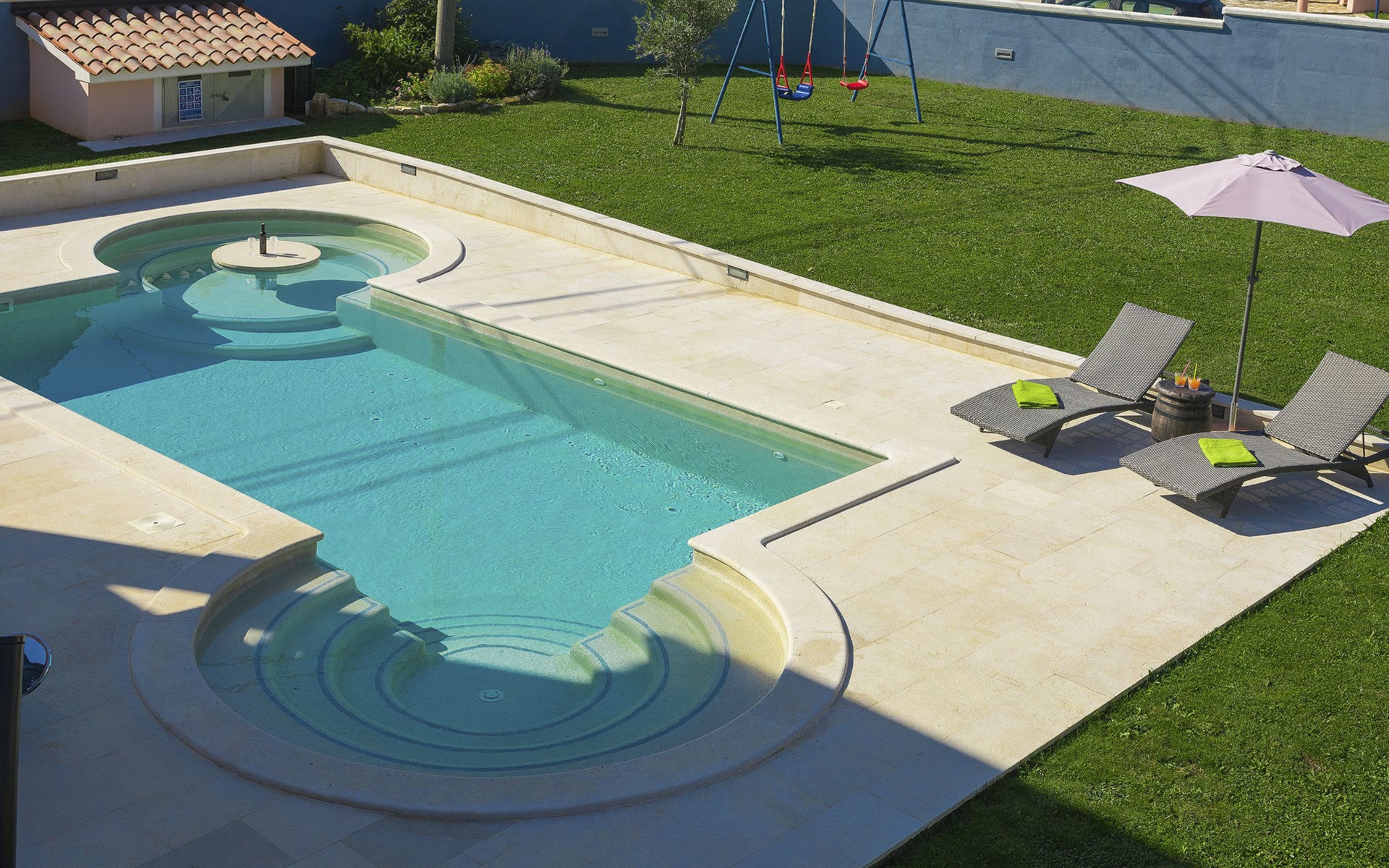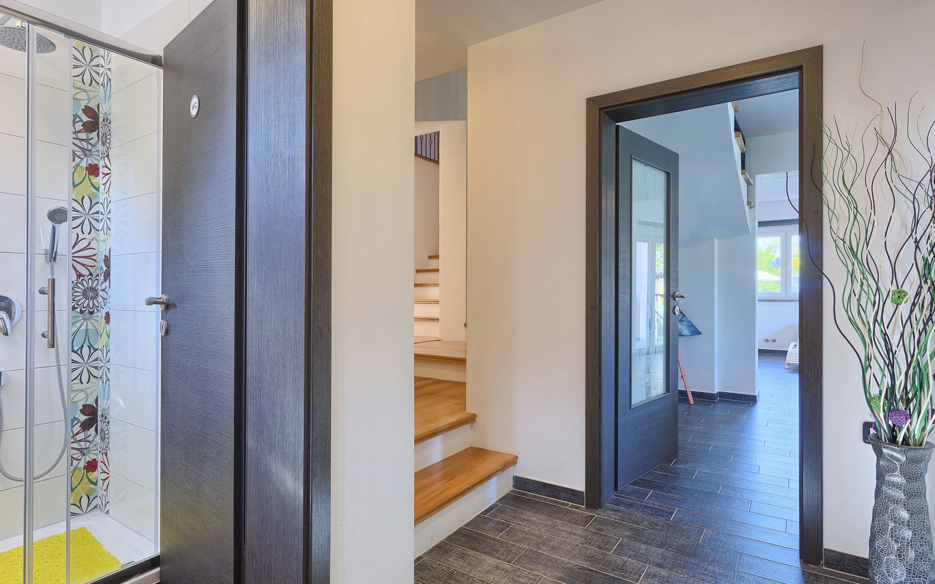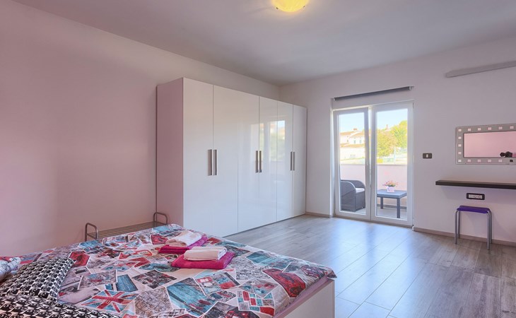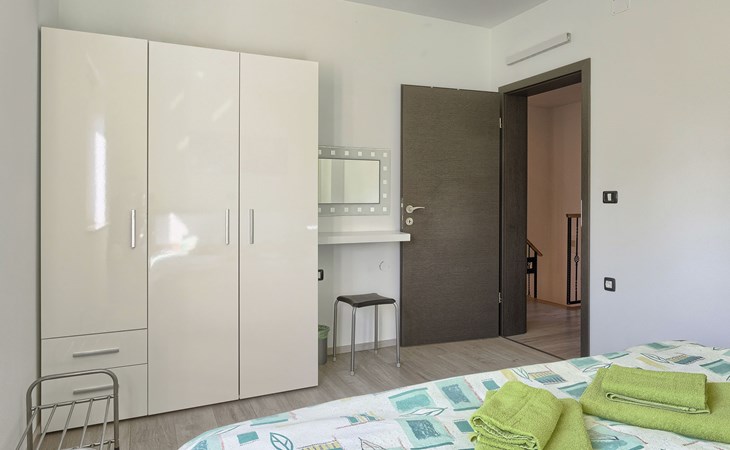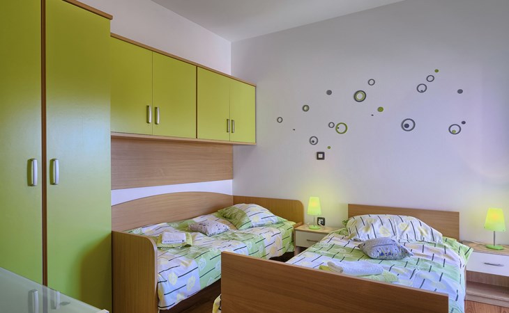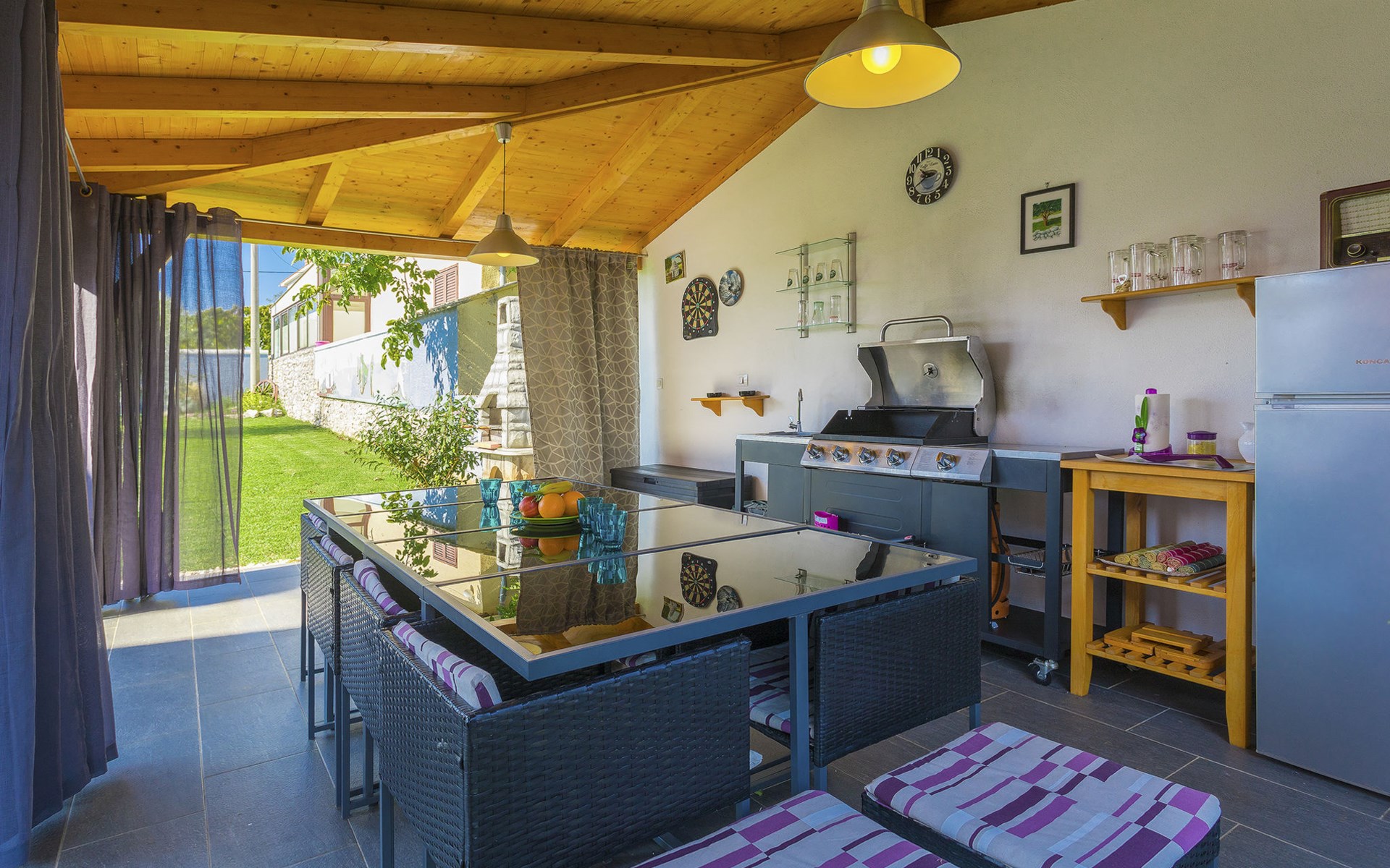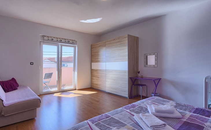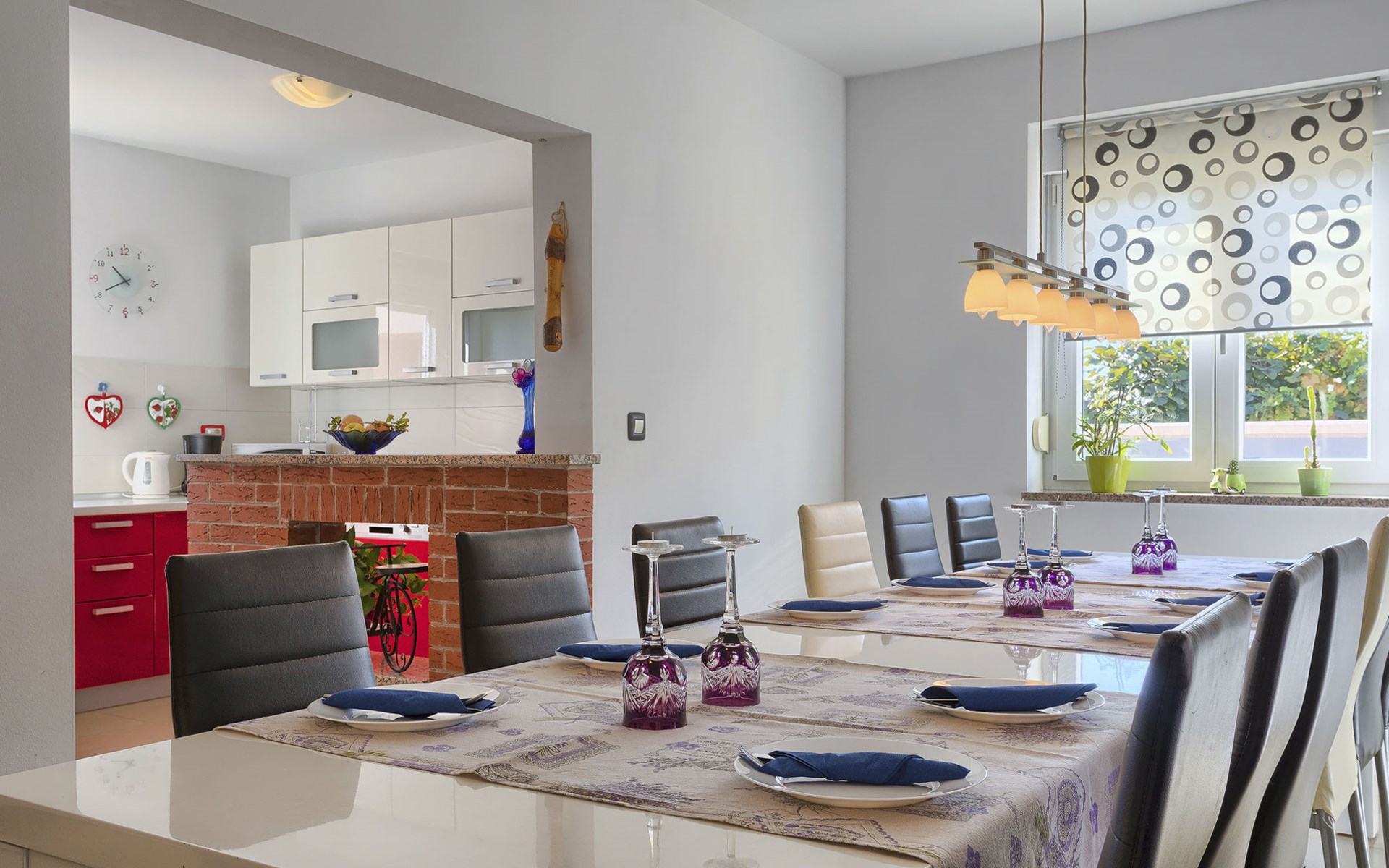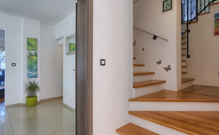 Single-family house "Paus", 2 storeys. In the hamlet Orihi 7 km from the centre of Barban, in a quiet, sunny position, 15 km from the sea. Private: property 1'000 m2 (fenced), garden with lawn and wildlife garden, swimming pool heated (32 m2, depth 140 cm, seasonal availability: 27.Apr. - 26.Oct.) with internal staircase. Unconventional pool shape. Outdoor shower, table tennis, terrace (40 m2), garden furniture, barbecue, children's playground (slide, swing). In the house: internet access, sauna, billiard table, trampoline, washing machine. Parking at the house on the premises. Shop 50 m, restaurant 250 m, bus stop 3 km, pebble beach 15 km. Riding stable 15 km, walking paths from the house 100 m, cycle lane 150 m. Nearby attractions: Adrenalin park 15 km. Groups of teenagers are not allowed.