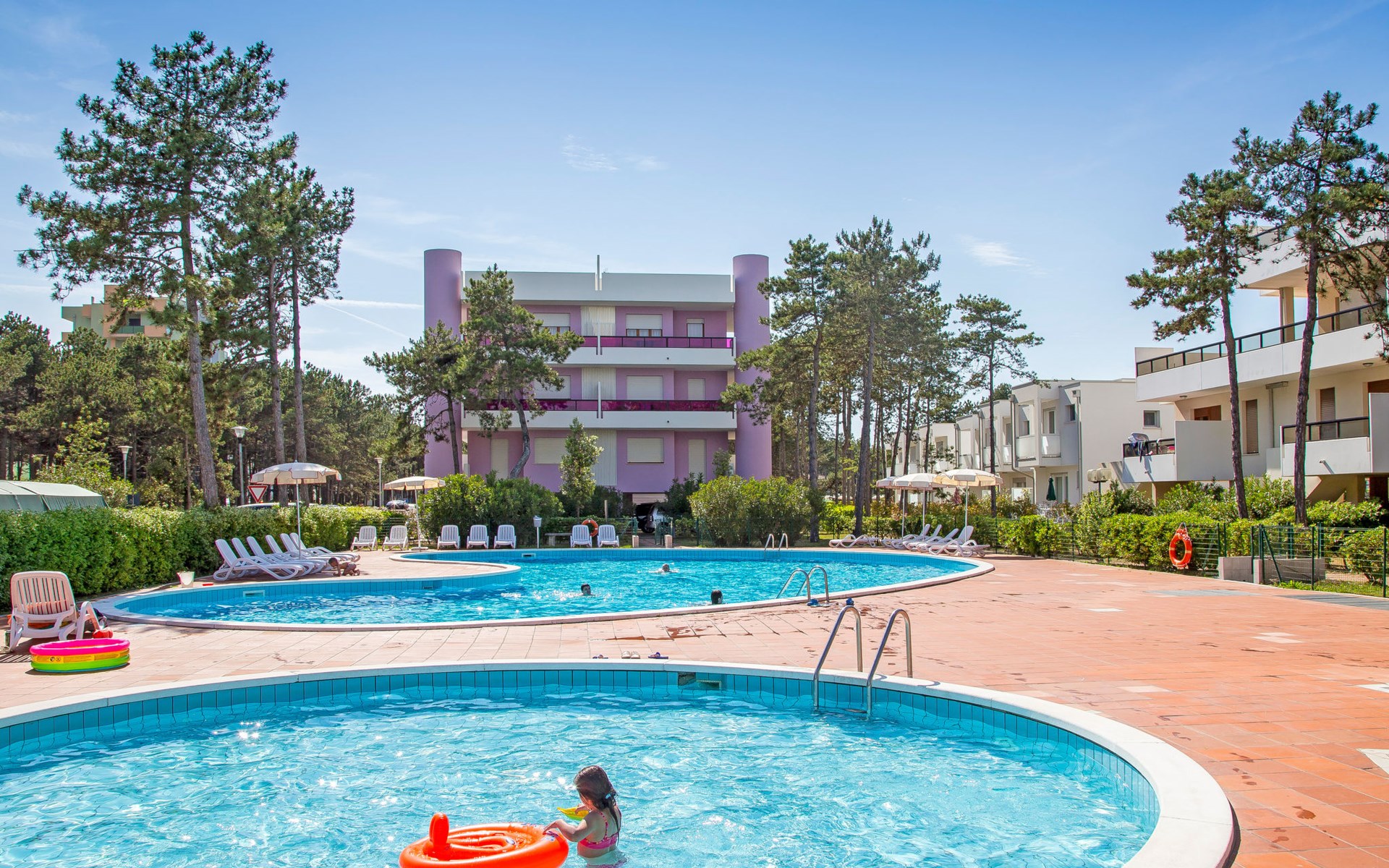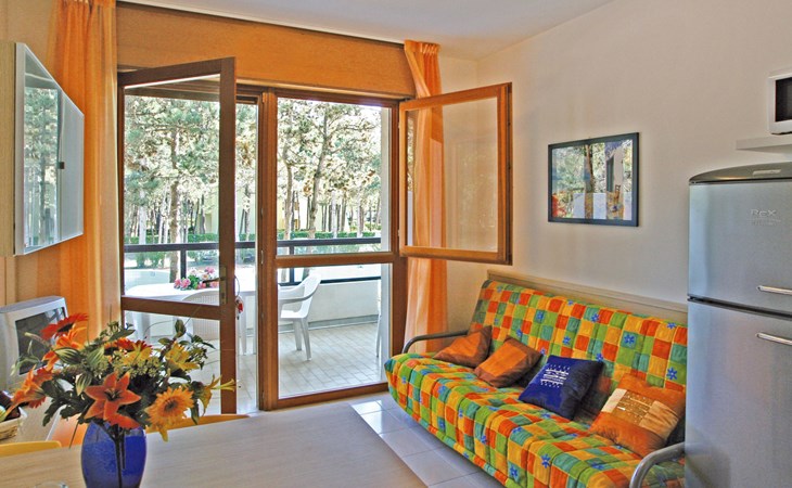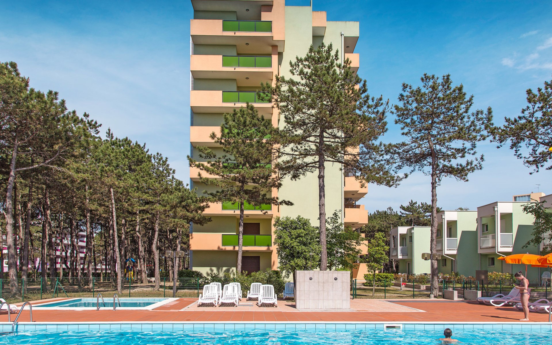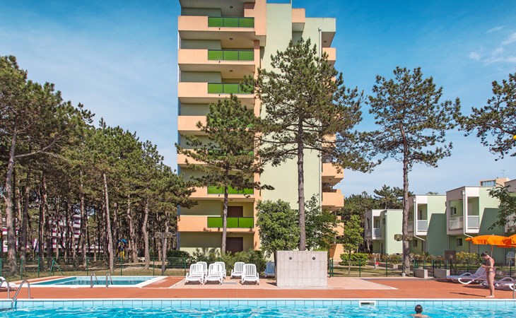 Large resort "Villaggio Serenissima", 8 storeys. 4 houses in the resort. In the district of Bibione-Lido del Sole 1.3 km from the centre of Bibione, 13 km from the centre of Lignano, 100 km from the centre of Venezia, 400 m from the sea. For shared use: natural state property with plants and trees, swimming pool (13 x 6 m, seasonal availability: 15.May. - 15.Sep.). Children's pool. In the house: lift. Parking at the house on the premises. Shop, restaurant 250 m, bus stop 350 m, railway station "Latisana (Milano-Venezia-Triest)" 21 km, sandy beach 400 m, thermal baths "Bibione Thermae" 1 km. Golf course (18 hole) 9 km.