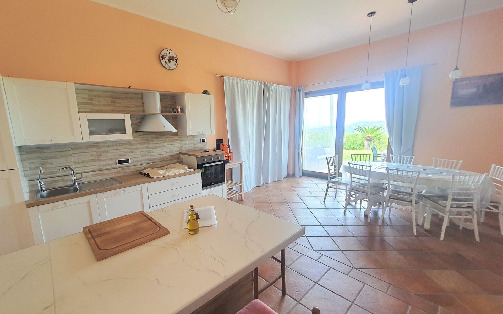 The interior of the villa is furnished with every imaginable convenience to ensure a comfortable and carefree stay. Four spacious bedrooms and three bathrooms, each with a shower, offer ample space for all guests. The rooms are air-conditioned to ensure maximum comfort even on the hottest days, and the kitchen is equipped with everything you need, including a gas cooker, dishwasher and an inviting wood-burning barbecue, perfect for cheerful evenings outdoors. The villa also has a handy washing machine, making it ideal for longer stays.