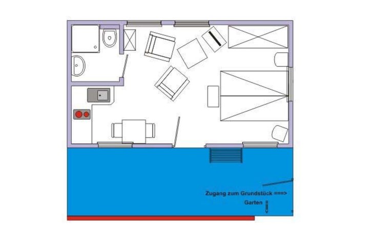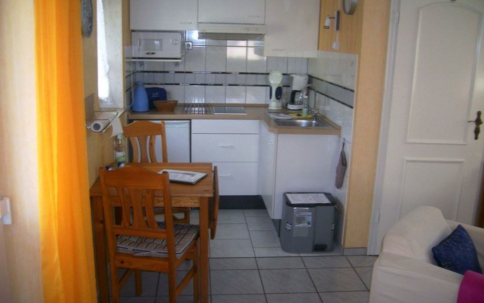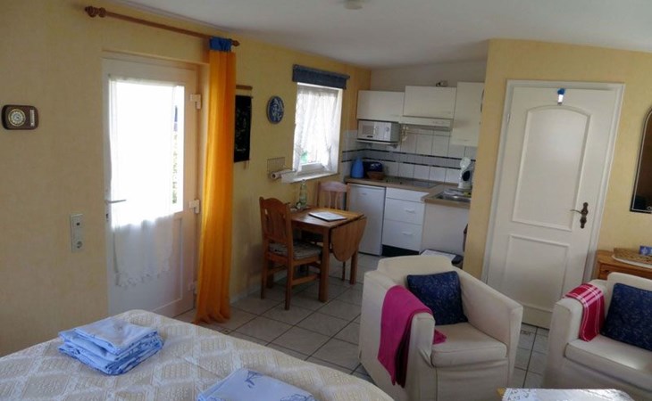The kitchenette consists of a sink, 2-plate ceramic hob, fridge and extractor bonnet. A microwave, coffee machine, toaster, egg cooker and sufficient crockery are also available.