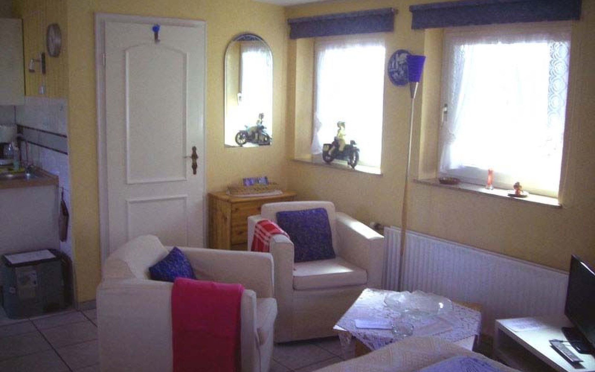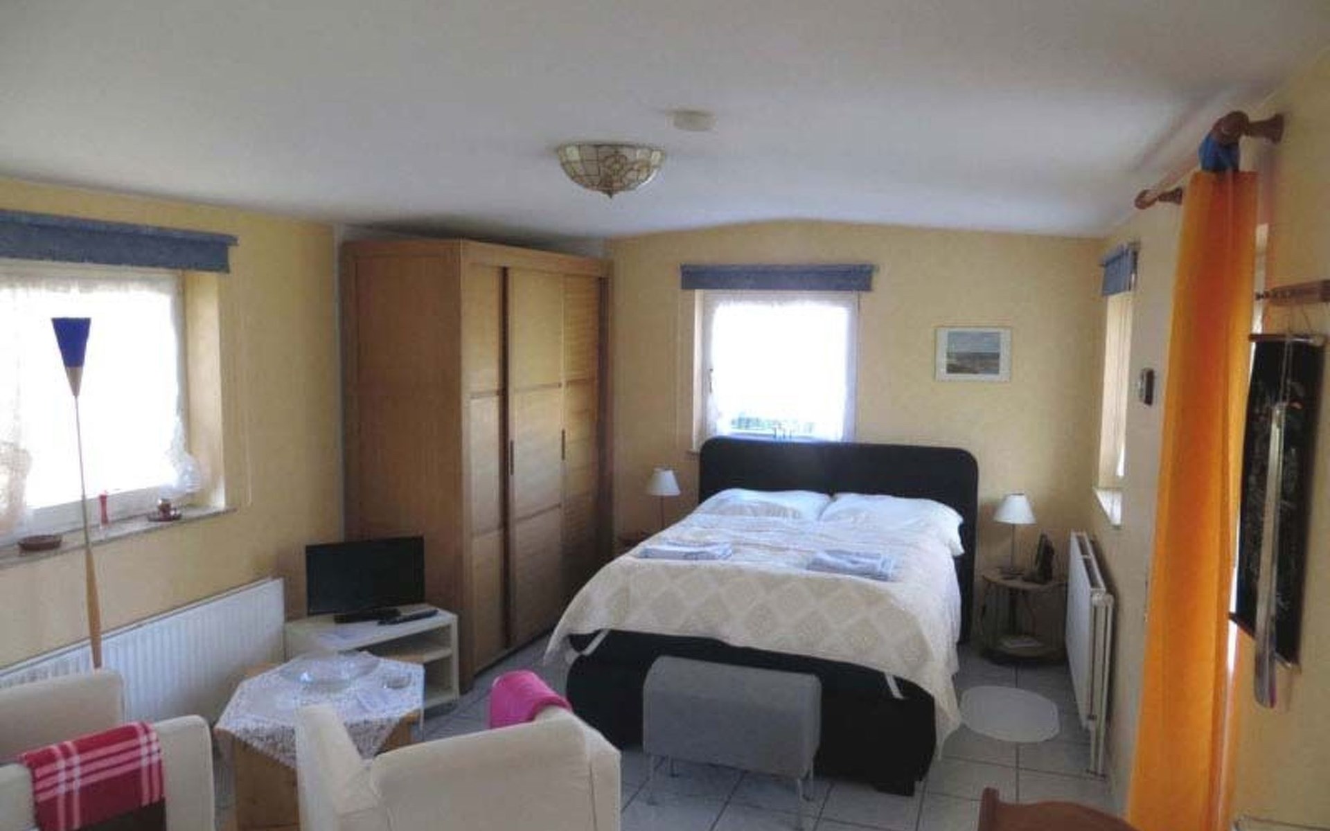 The flat is furnished with 2 armchairs with coffee table, a box-spring bed with bedside tables and lamps, as well as a large wardrobe. Satellite TV, flat screen TV and radio.