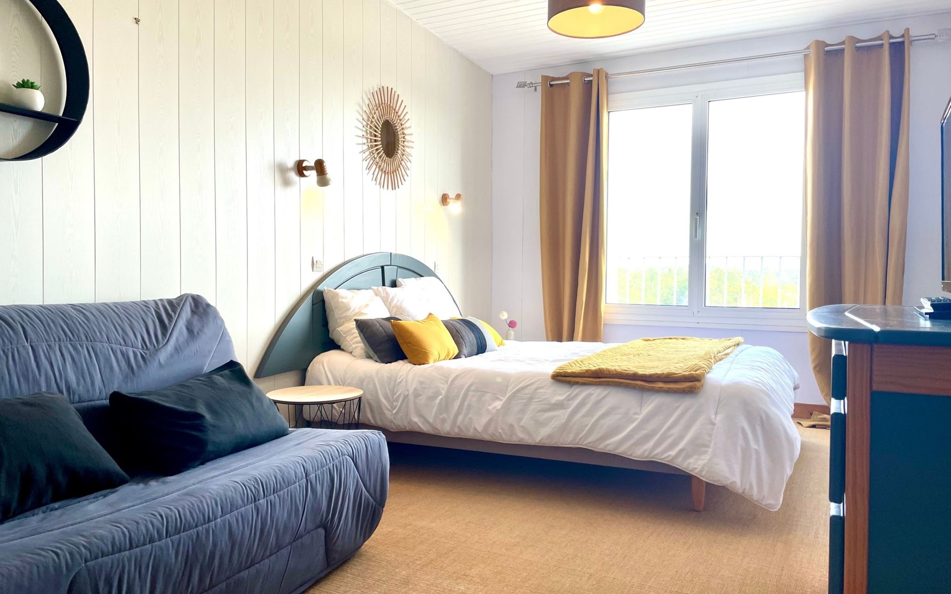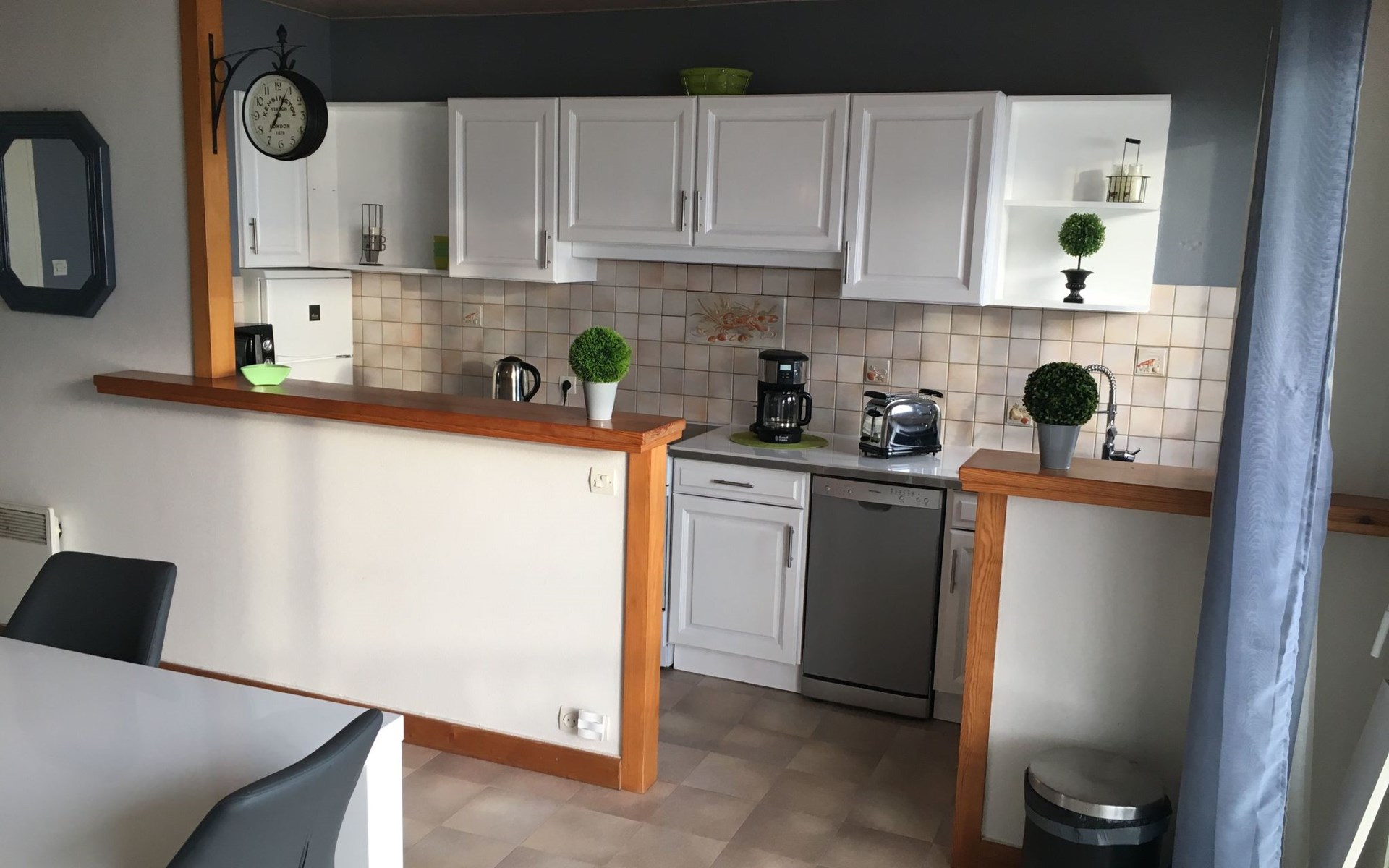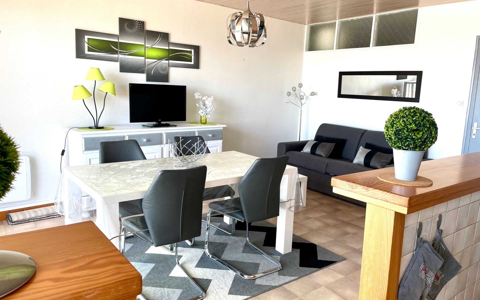 The interior of the flat has been designed with your comfort in mind, with a spacious bedroom equipped with a 160 cm bed and a BZ, ideal for relaxing after a day of exploring. The living area elegantly combines a cosy lounge with a fully equipped kitchen, providing everything you need to prepare meals as you would at home, including a ceramic hob, coffee maker, filter coffee maker and dishwasher. A washing machine is also available for private use, ensuring total autonomy during your stay.