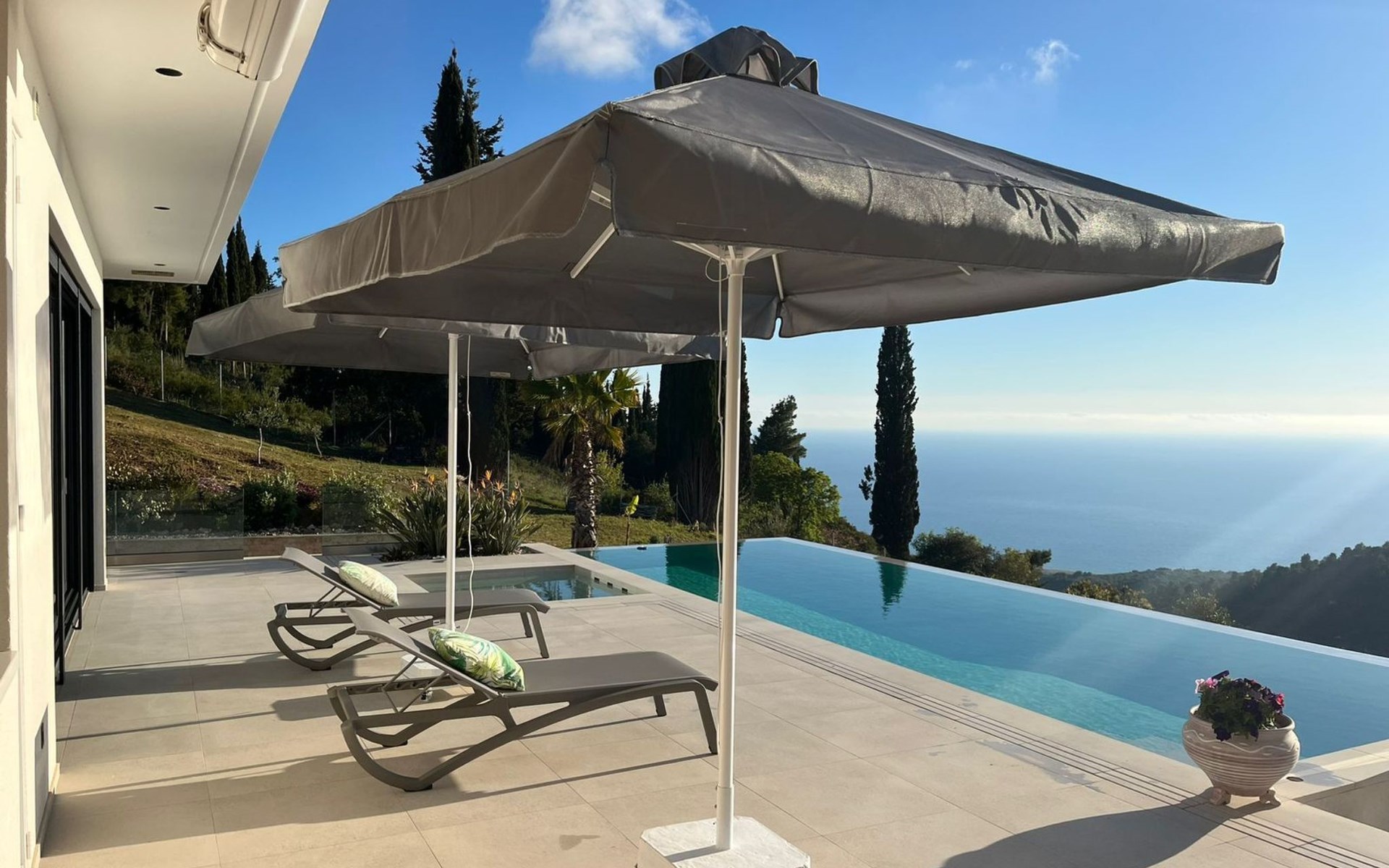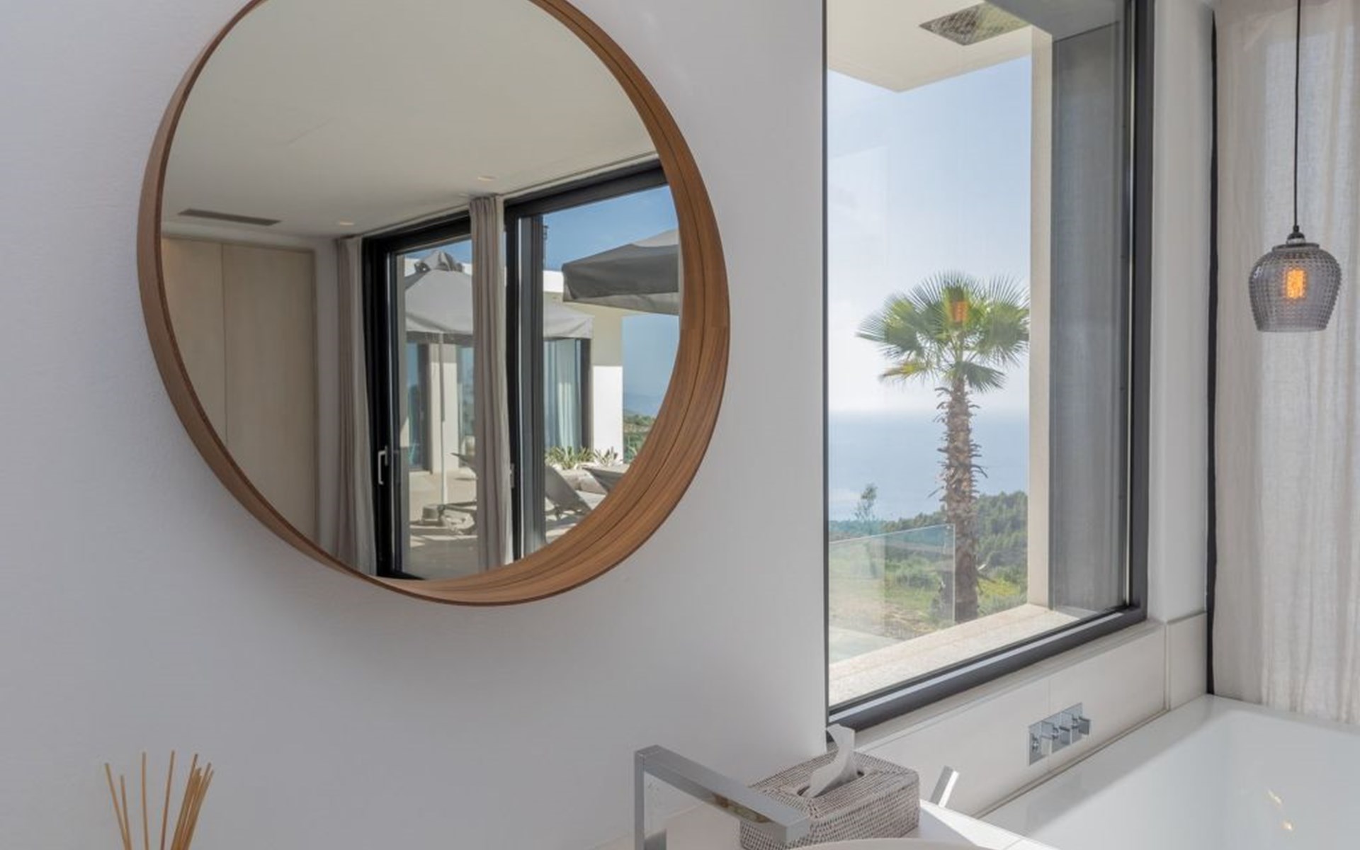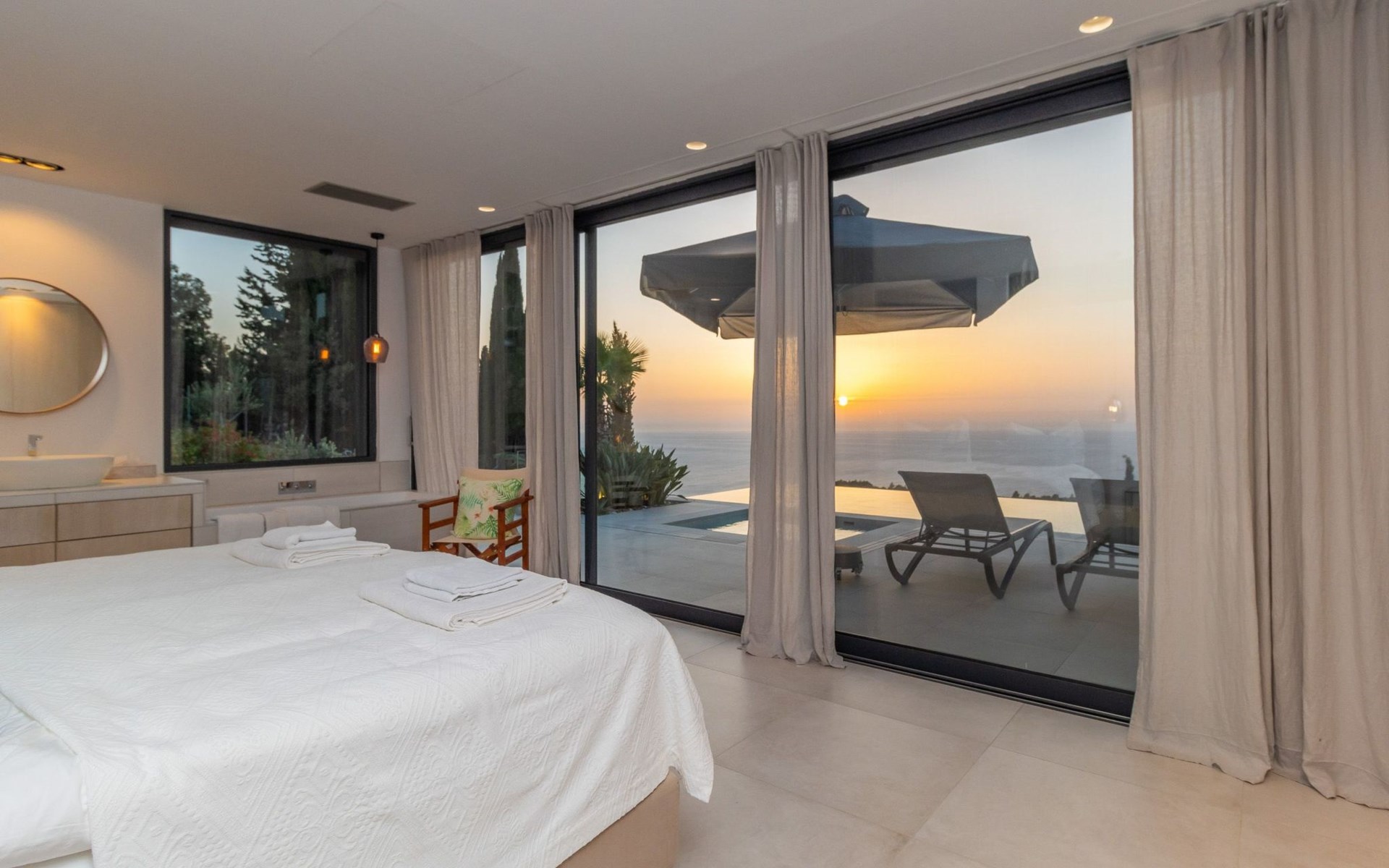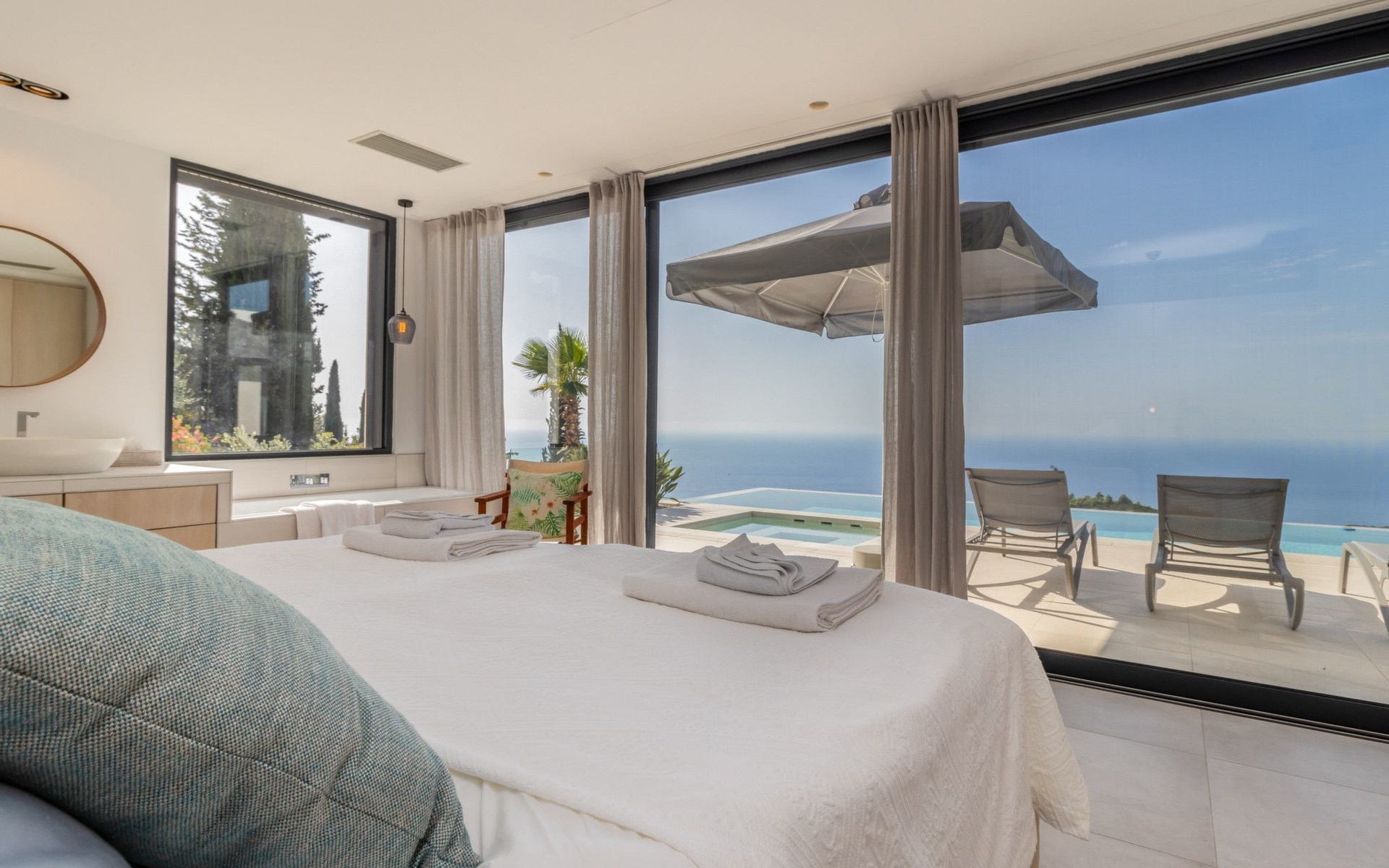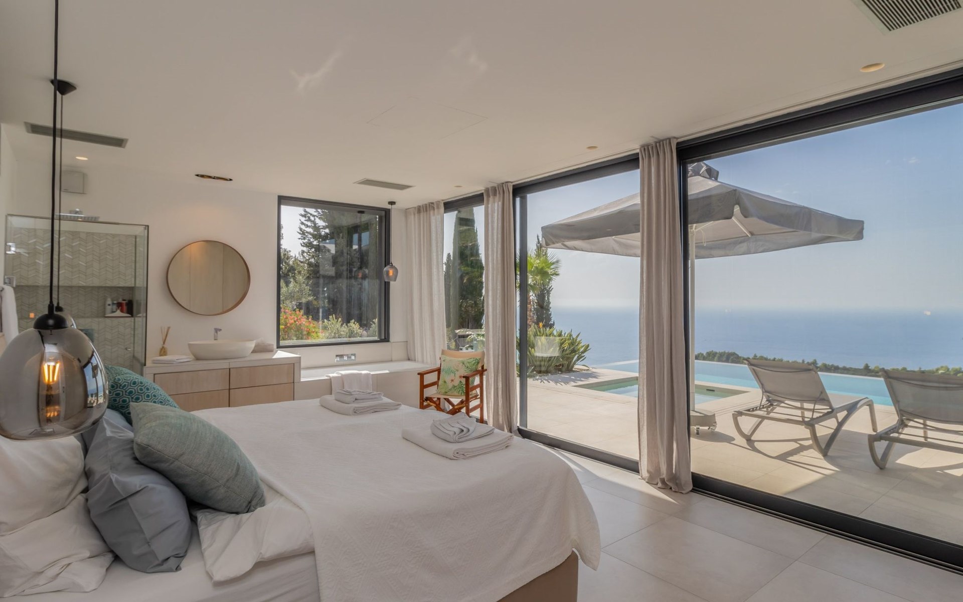 The master bedroom on the upper floor also opens onto the terrace and offers uninterrupted views of the sea over the infinity pool. All bedrooms on the ground floor offer beautiful views of the sea through large windows and have direct access to the garden, and are equipped with highly comfortable box-spring beds.