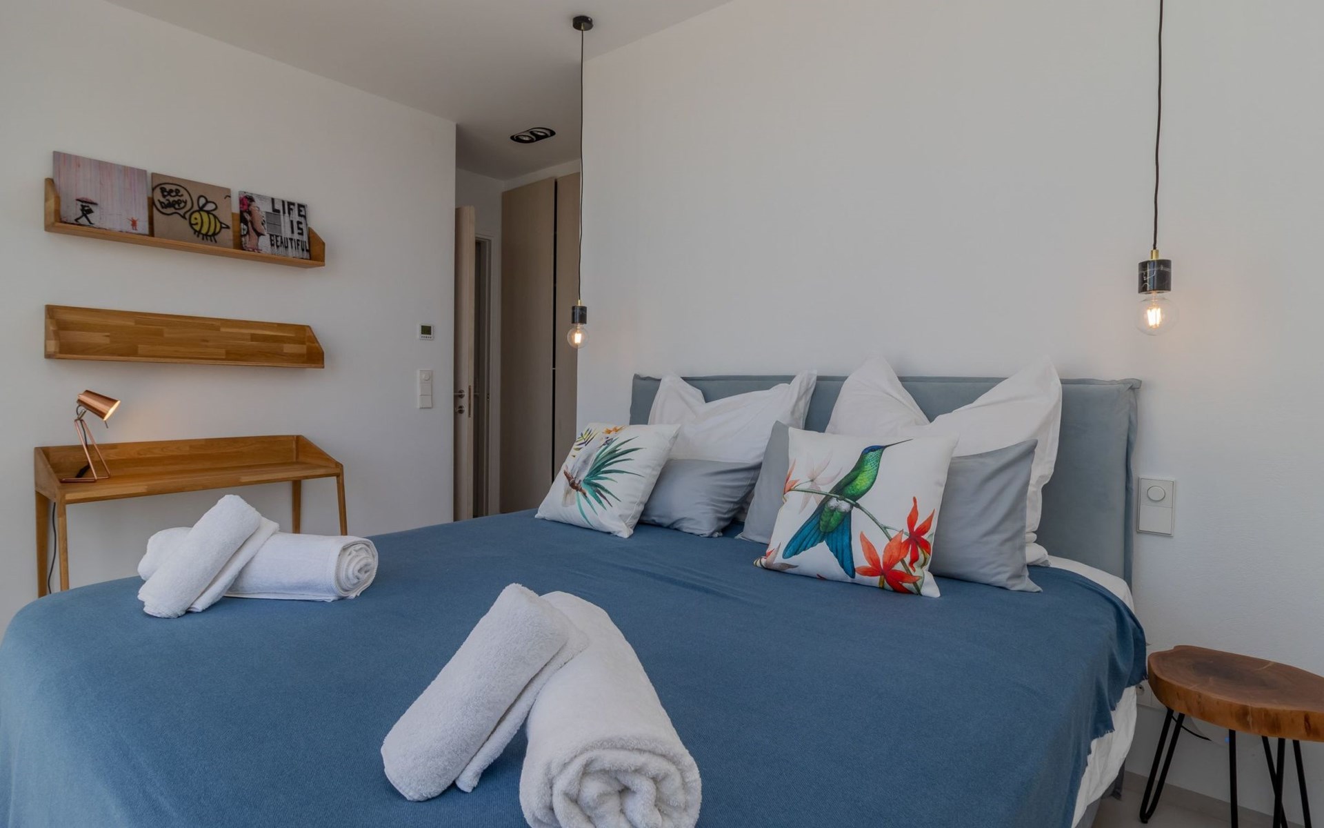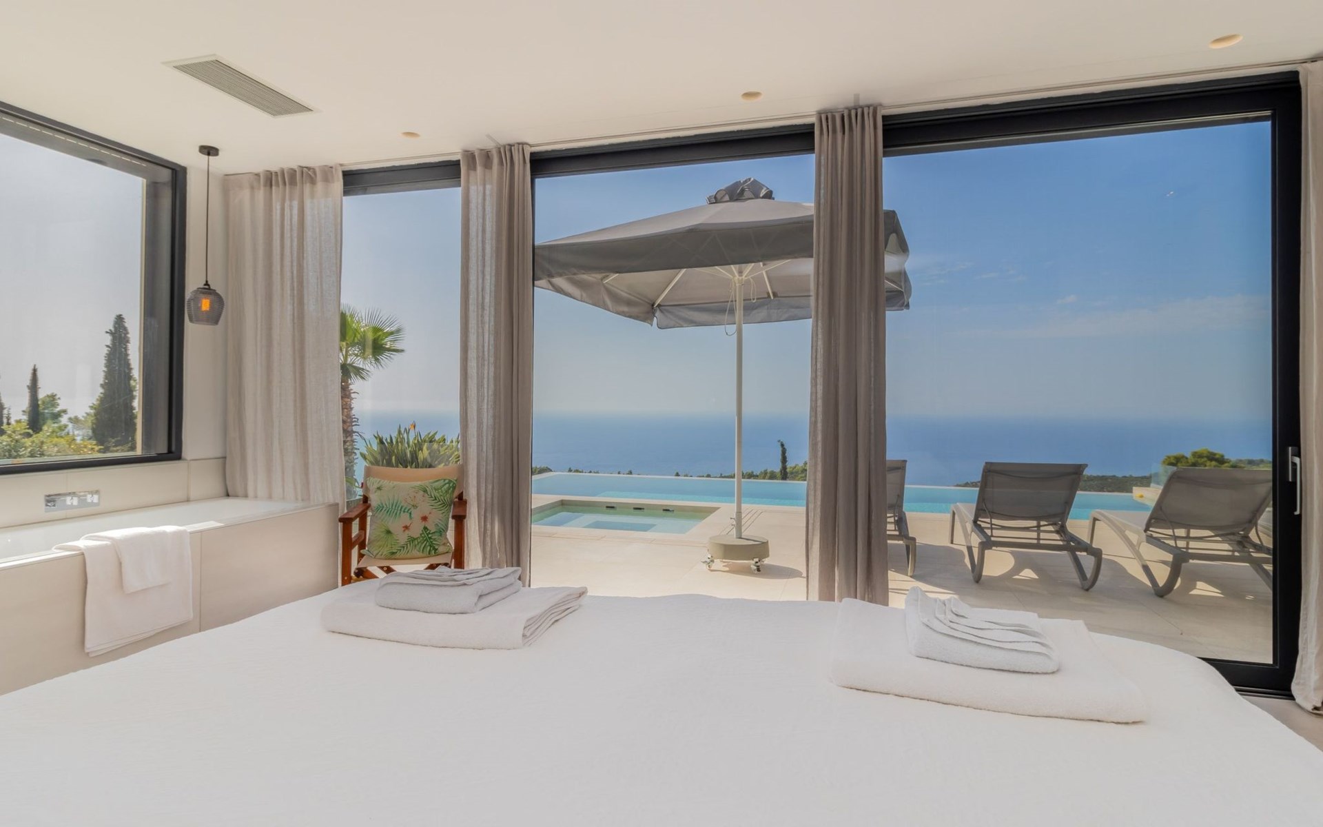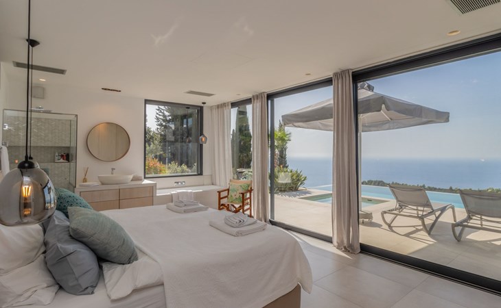 - Master bedroom with king-size box-spring bed, en-suite shower, washbasin and bathtub overlooking the infinity pool and the open sea