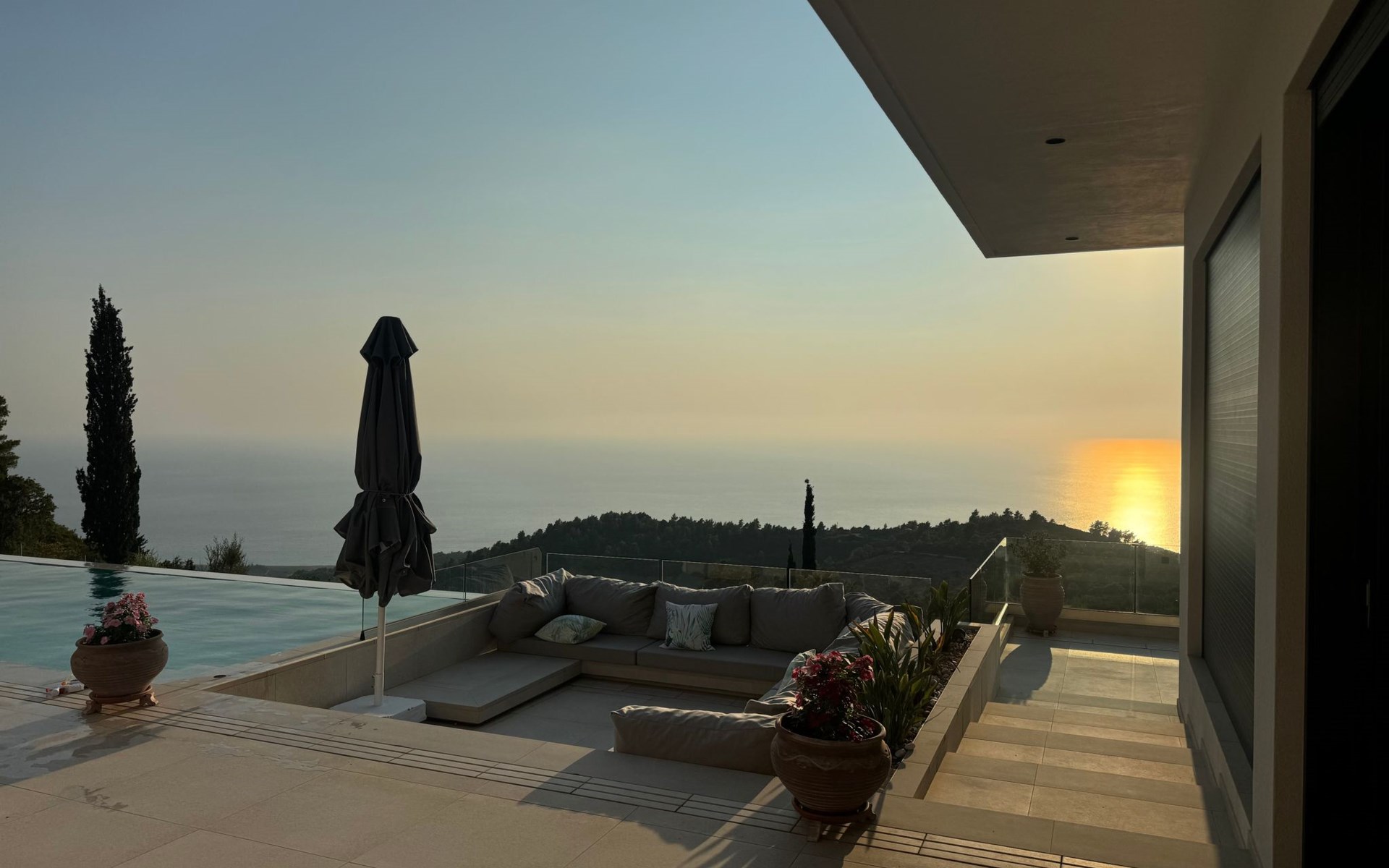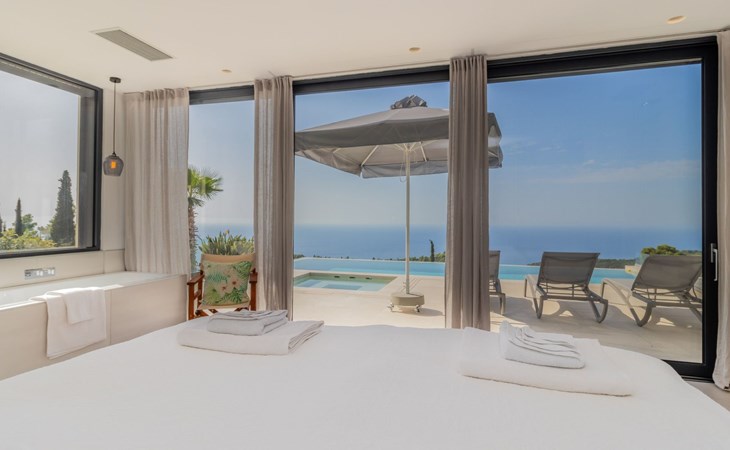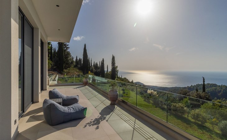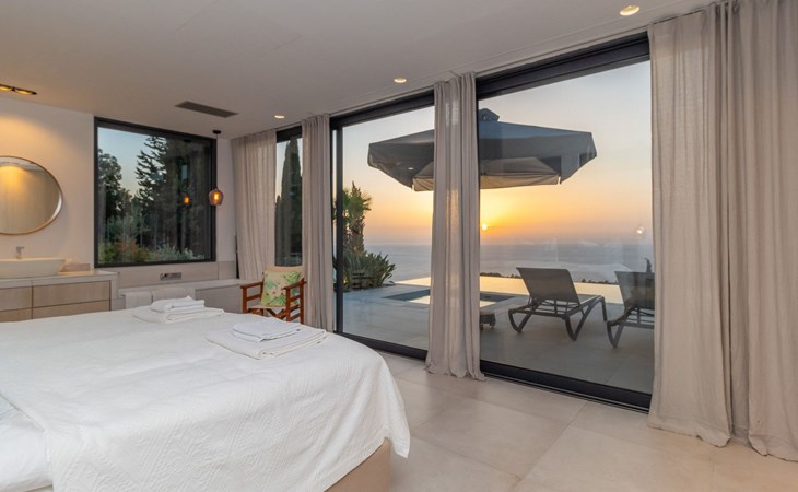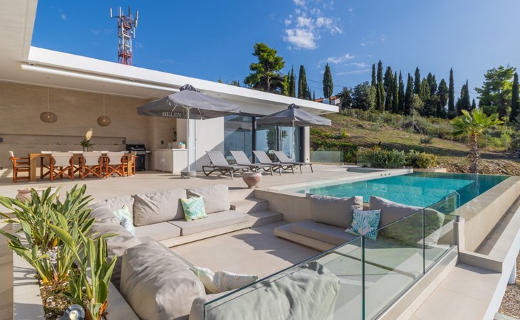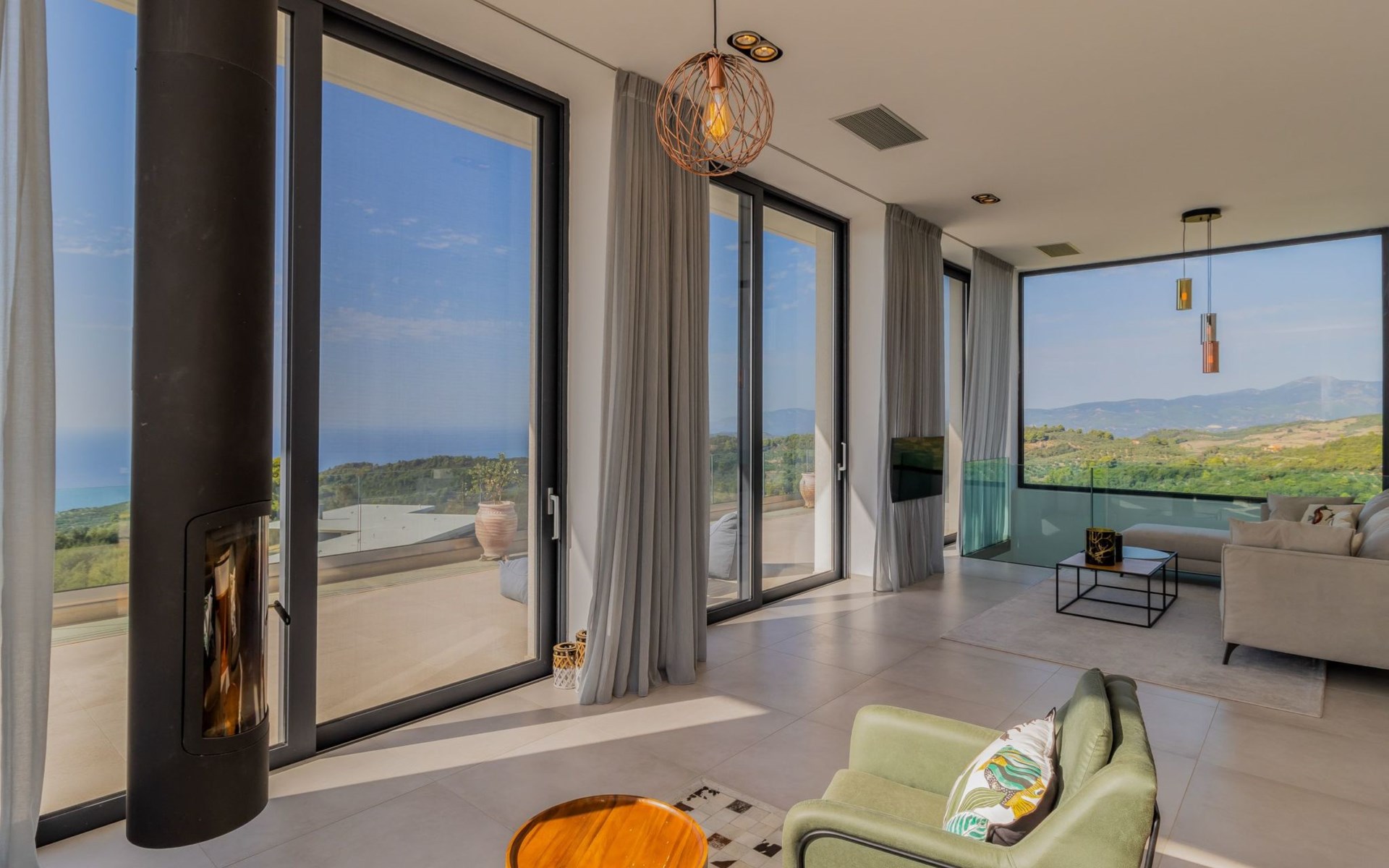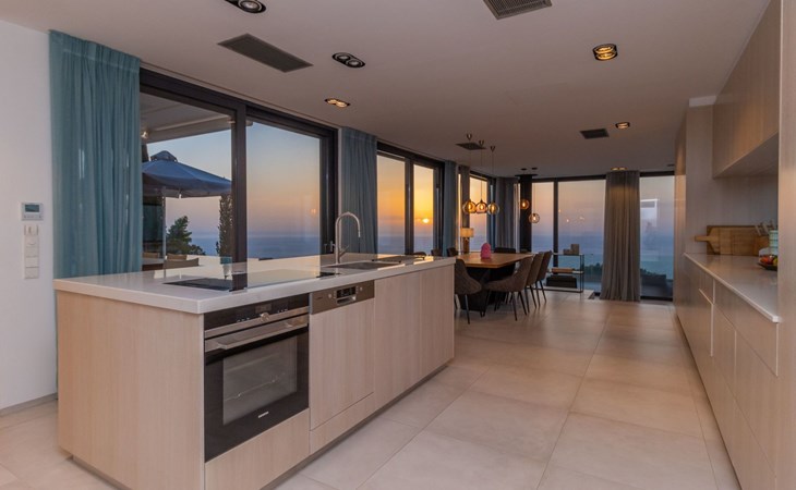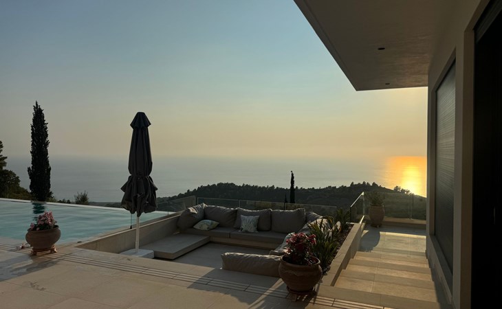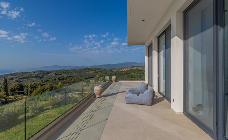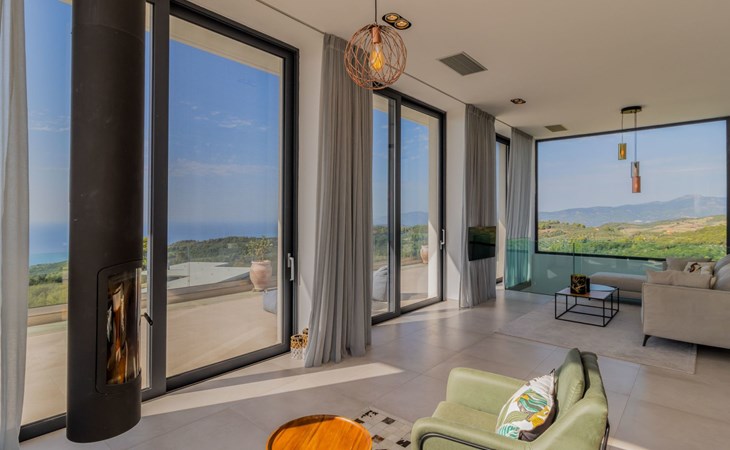 Villa Horizon is a modern villa with large glass fronts that maximise the view of the Ionian Sea. On clear days you can see as far as the island of Zakynthos. The design is modern but cosy and emphasises the beautiful nature surrounding the house.