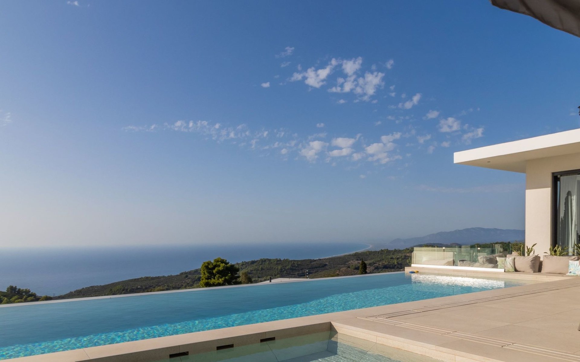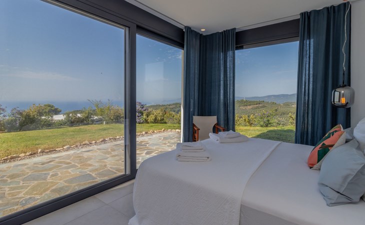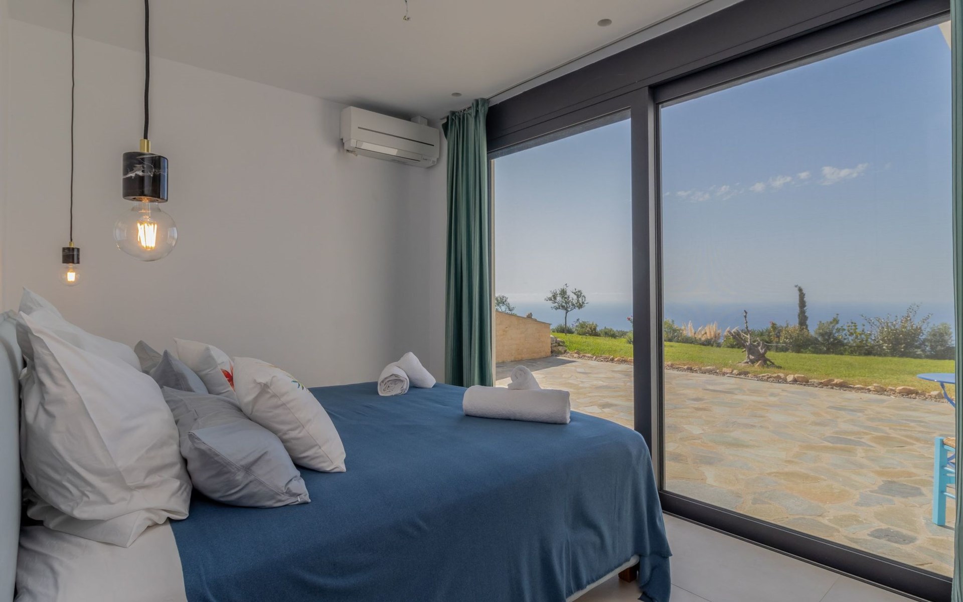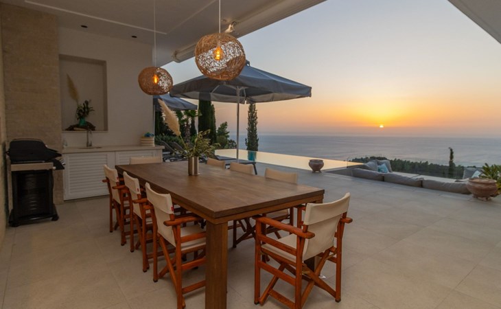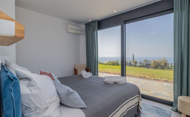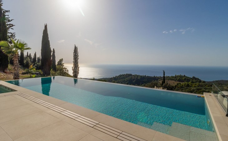 Villa Horizon is a modern villa with large glass fronts that maximise the view of the Ionian Sea. On clear days you can see as far as the island of Zakynthos. The design is modern but cosy and emphasises the beautiful nature surrounding the house.