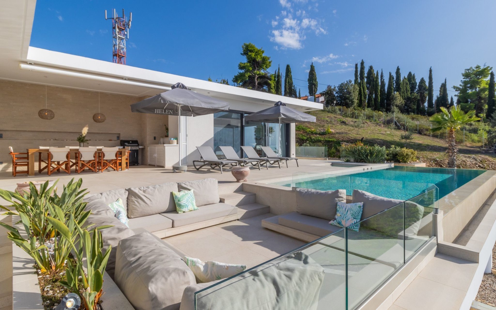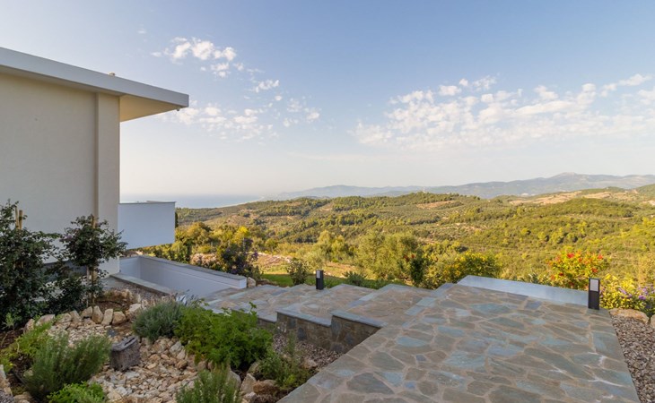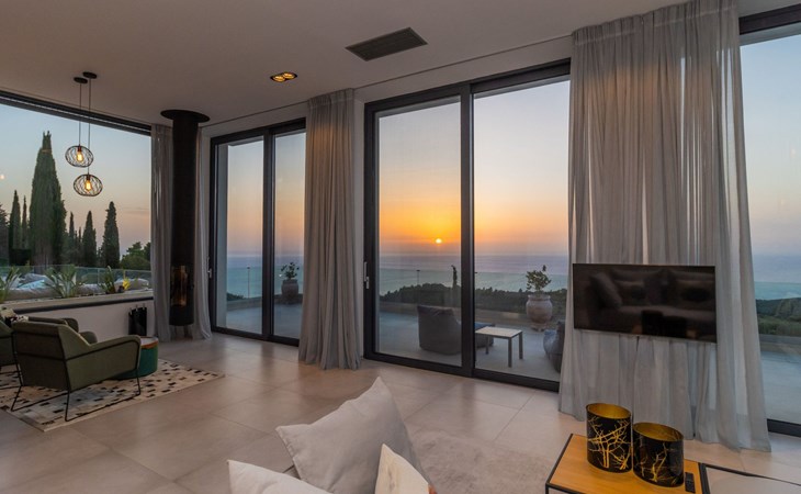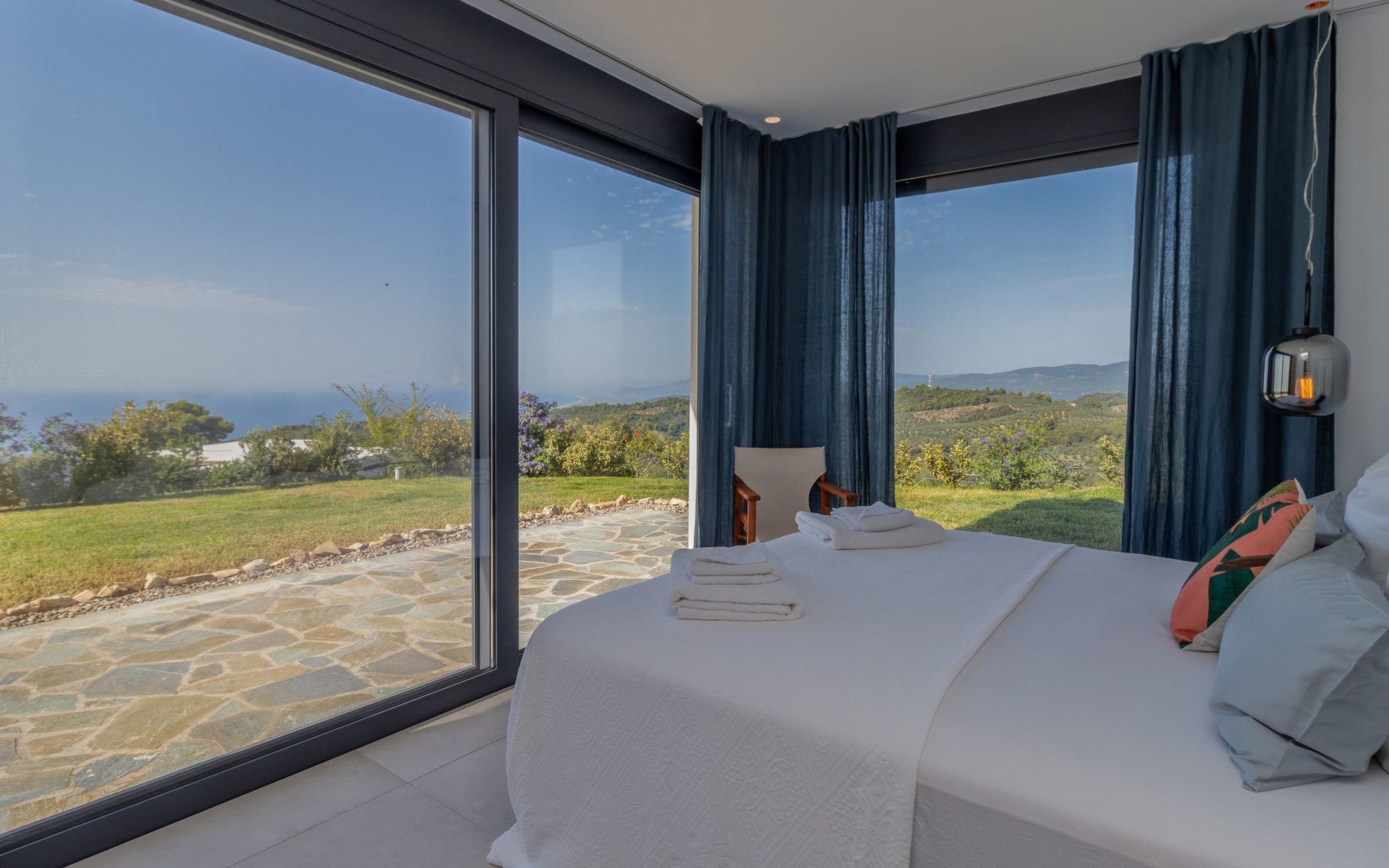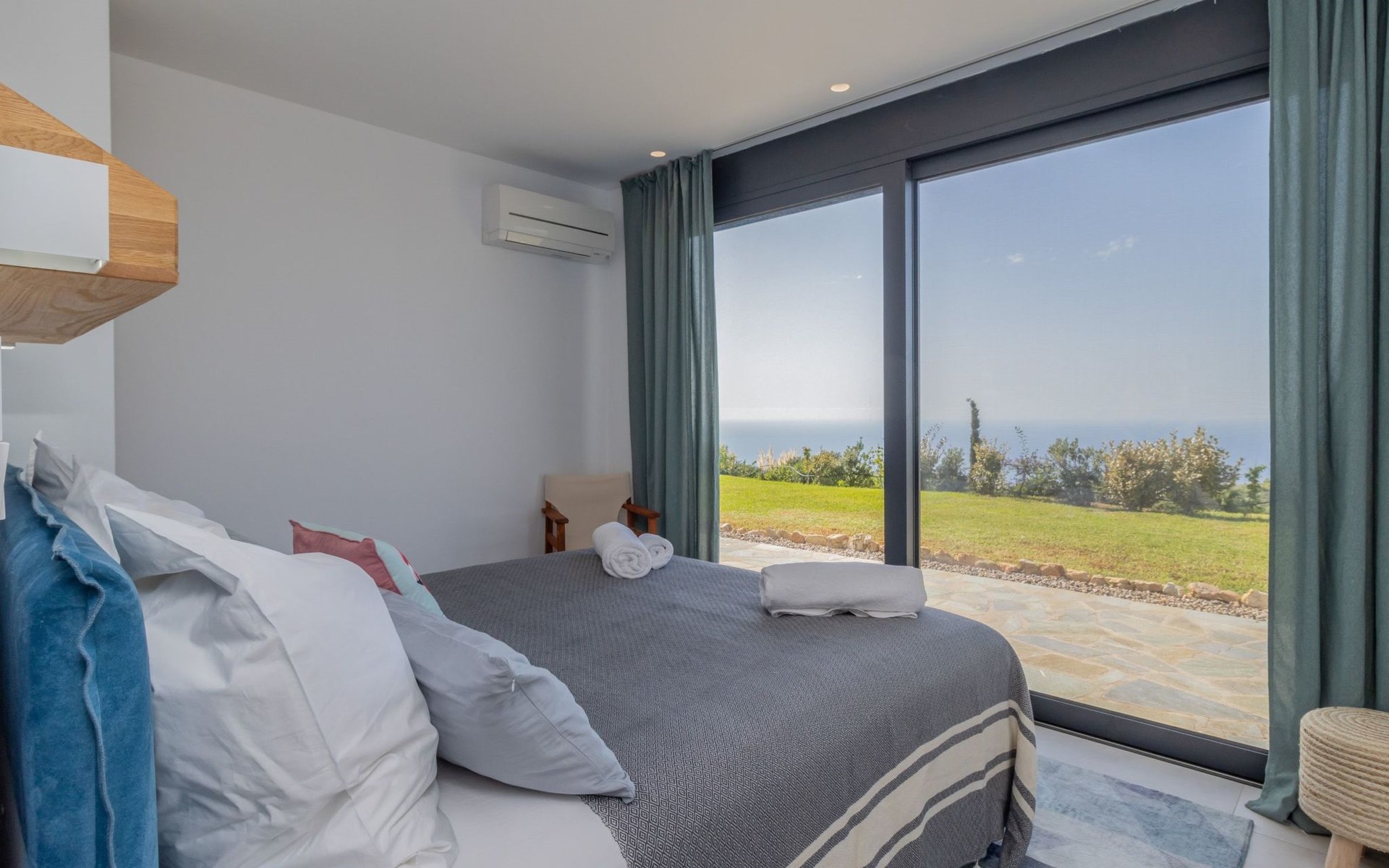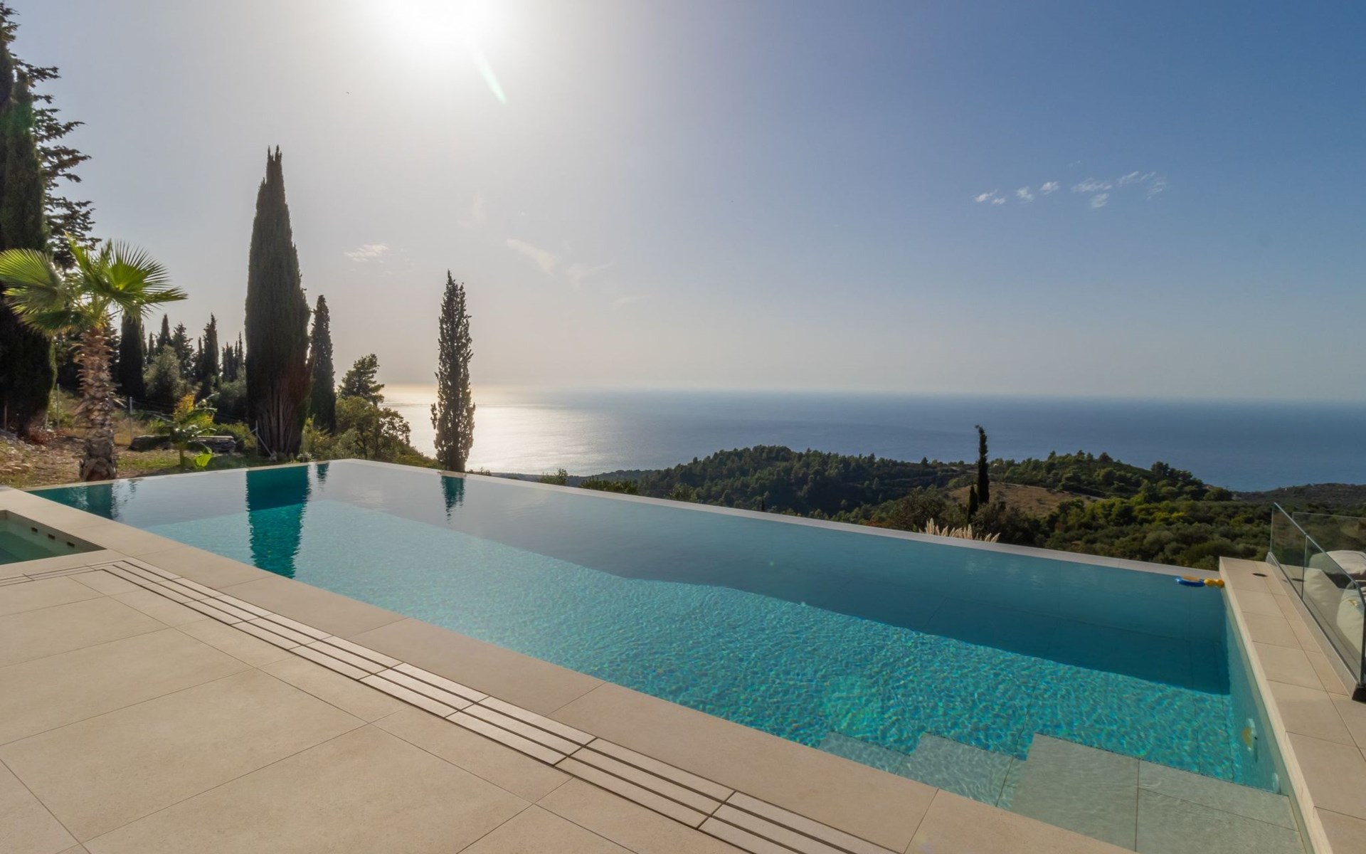 Villa Horizon is a modern villa with large glass fronts that maximise the view of the Ionian Sea. On clear days you can see as far as the island of Zakynthos. The design is modern but cosy and emphasises the beautiful nature surrounding the house.