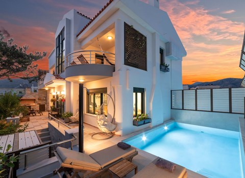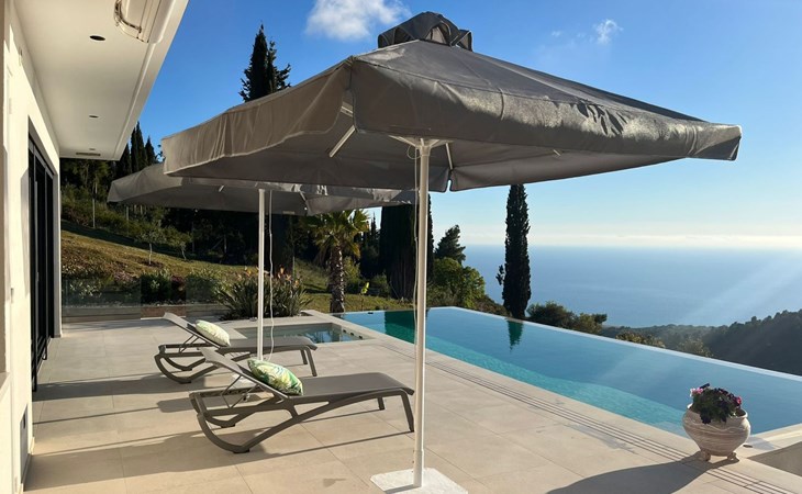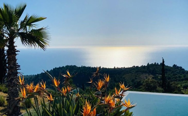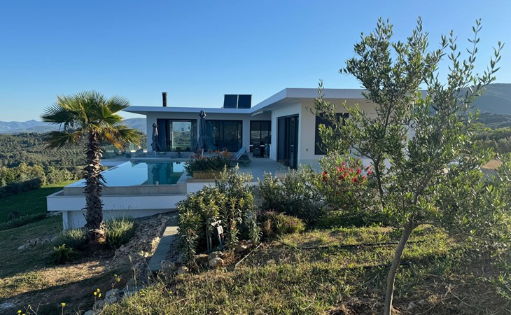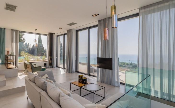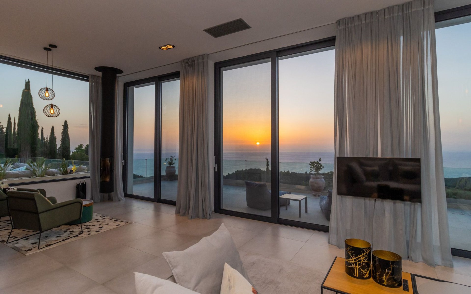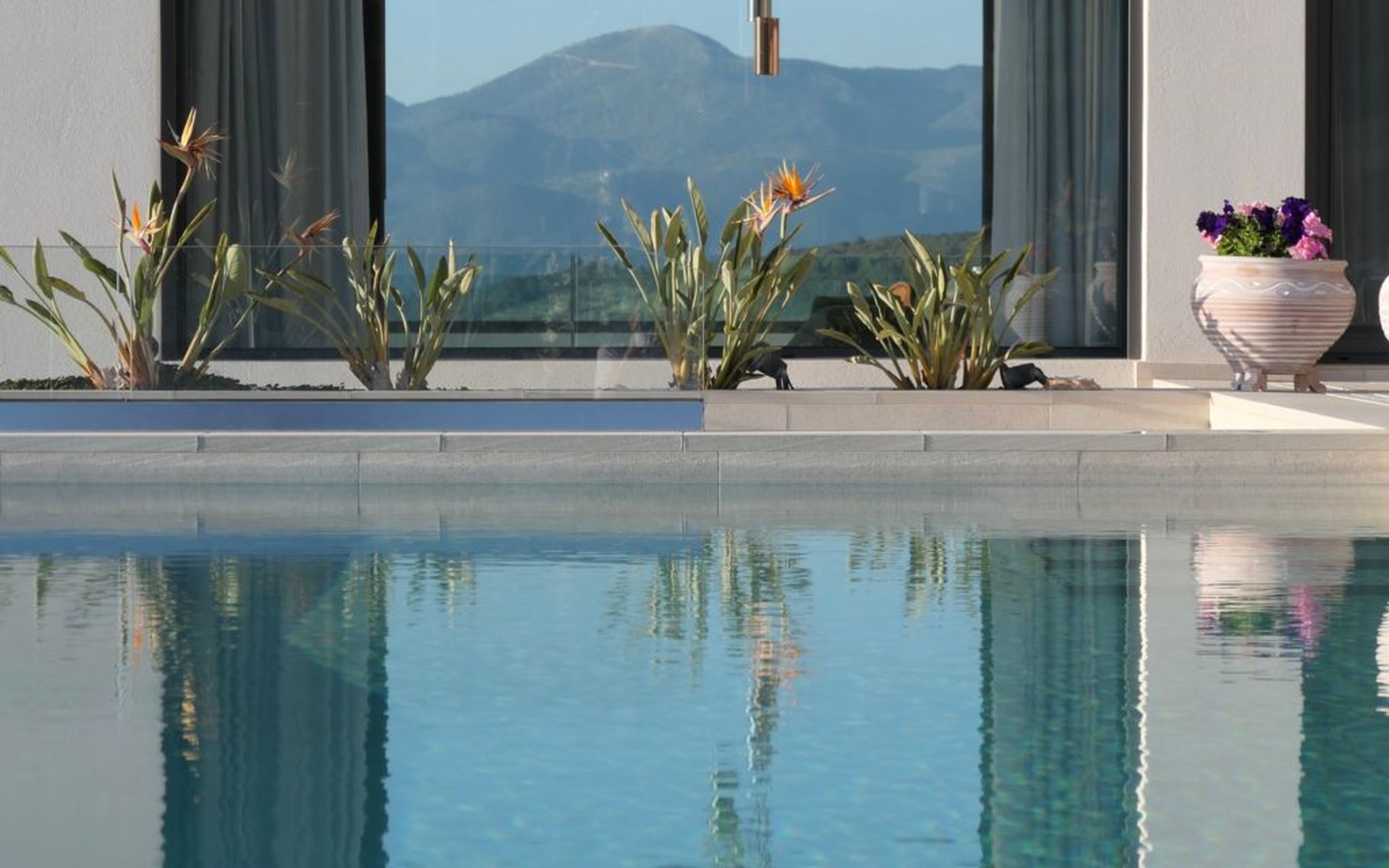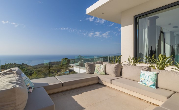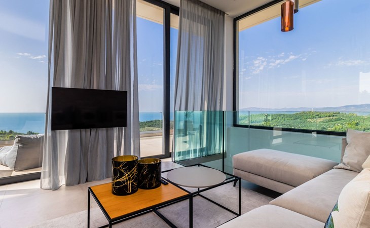 Villa Horizon is a modern villa with large glass fronts that maximise the view of the Ionian Sea. On clear days you can see as far as the island of Zakynthos. The design is modern but cosy and emphasises the beautiful nature surrounding the house.