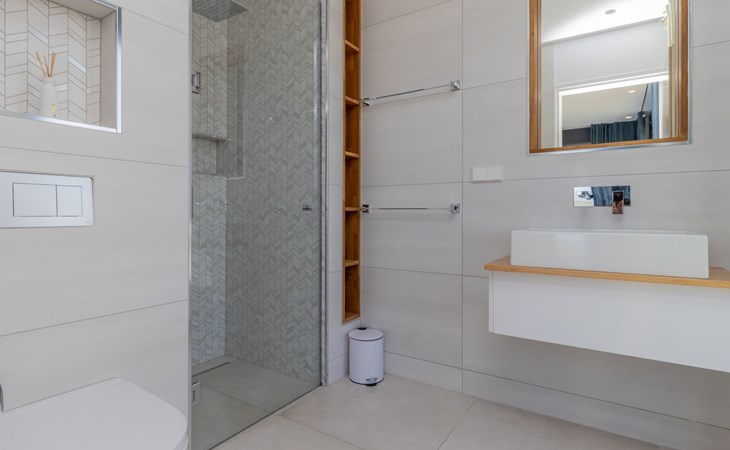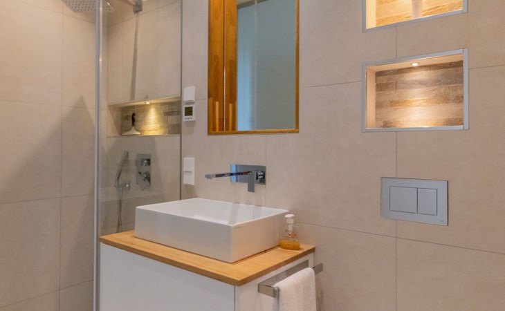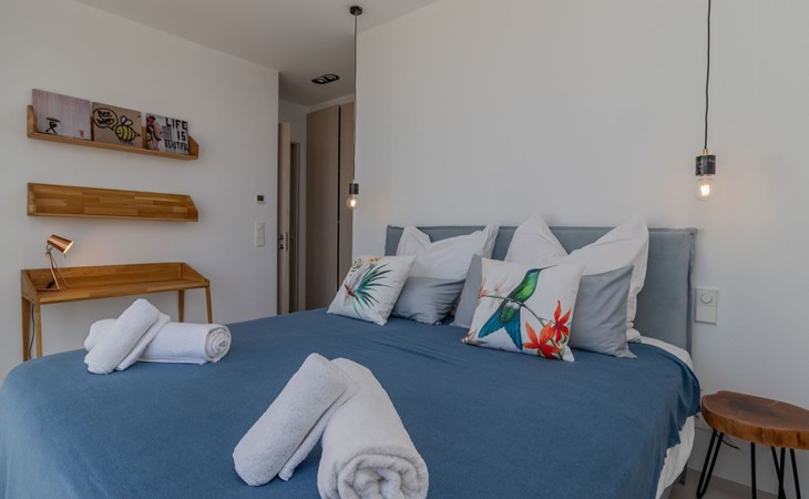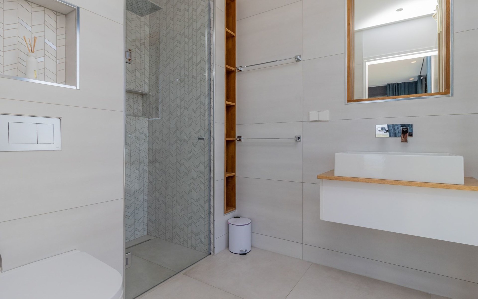 - 3 bedrooms with king-size box-spring beds, each with adjoining bathrooms (one bathroom per bedroom). The bathrooms are equipped with a walk-in shower, washbasin and WC