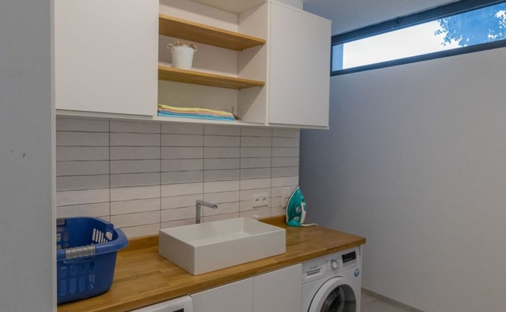 - Laundry room with washing machine, tumble dryer, iron, ironing board and storage area