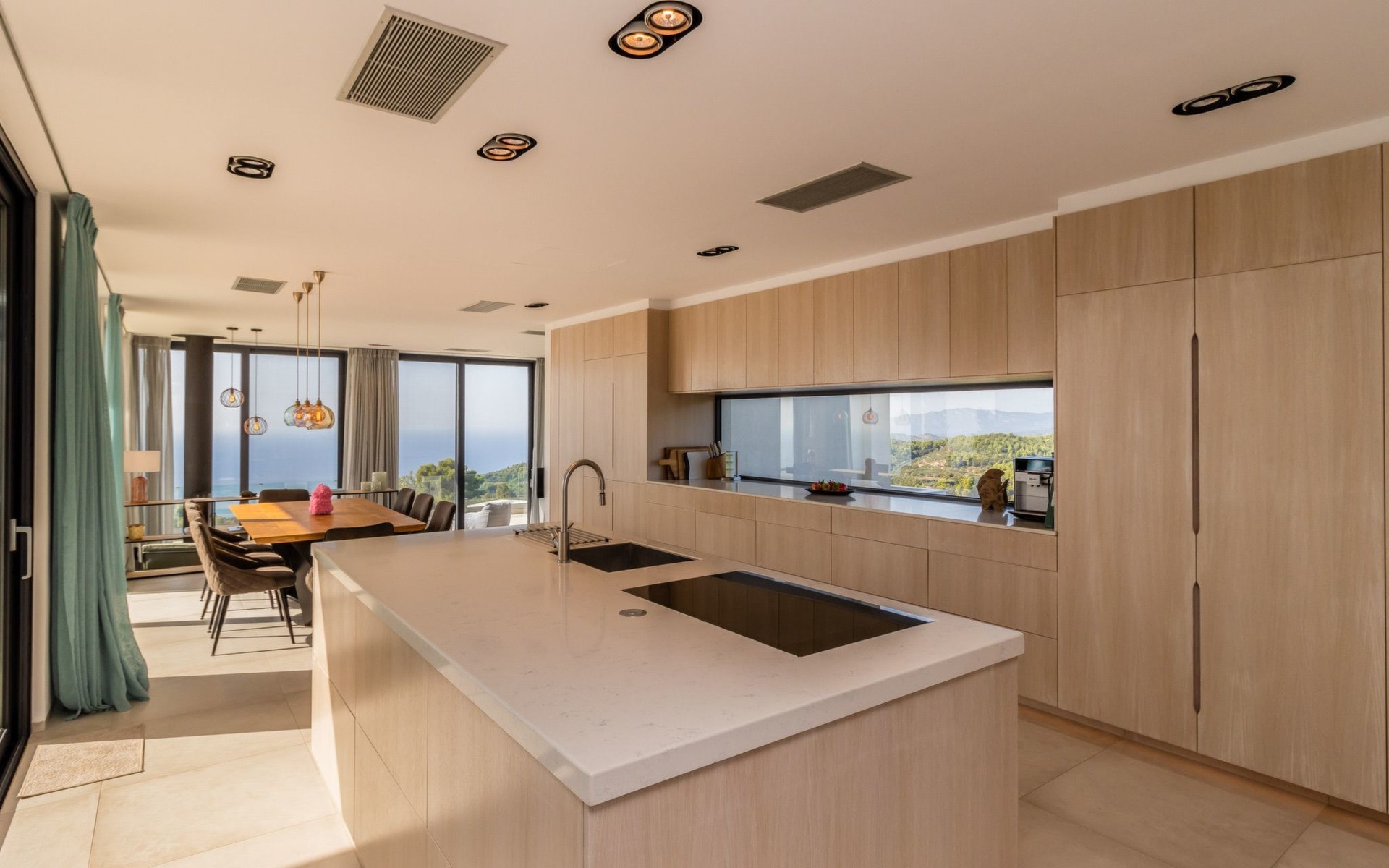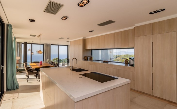 The living and dining area extends over two open-plan levels. The upper area with a large kitchen, cooking block and dining table opens onto the partially covered terrace with dining table, cosy lounge area and an infinity pool. The lower level is divided into two areas - the cosy sofa corner with coffee table and TV and the comfortable armchairs, where you can enjoy the cosy warmth of the free-hanging fireplace on cooler days. The terrace partially surrounds the house, so you can find a pleasant spot in the sun or shade at any time of day. The open-plan kitchen offers a view of the terrace and pool area through the floor-to-ceiling windows, as well as the open sea as far as the horizon.
