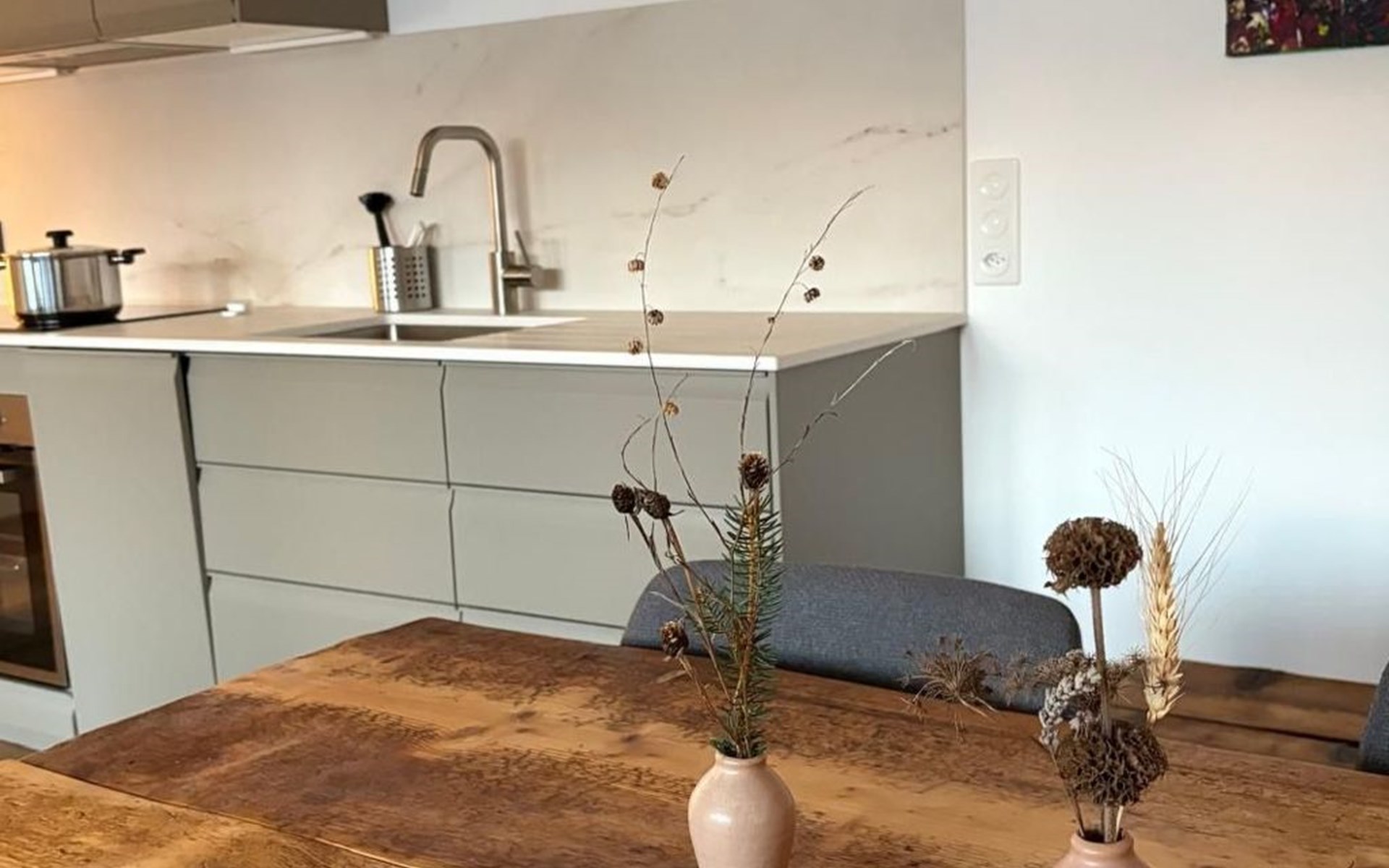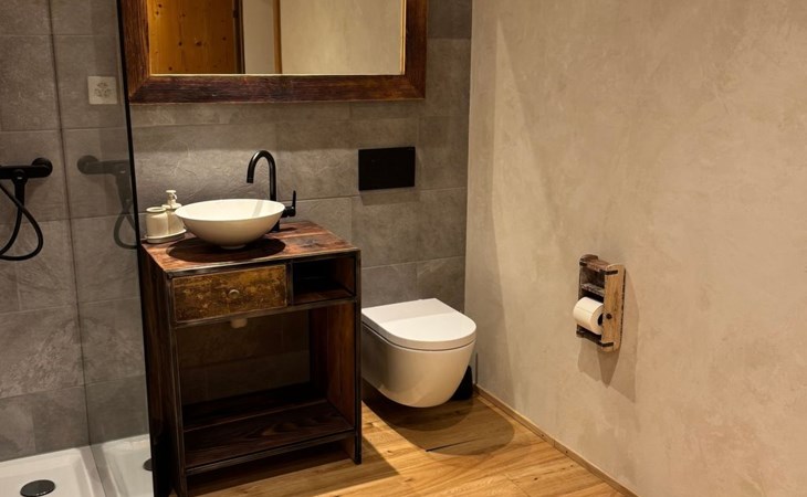 The interior of our holiday flat combines cosiness with functionality. A bedroom with a comfortable double bed also offers space for a cot if required. The underfloor heating provides pleasant warmth everywhere, while the fully equipped kitchen with induction hob, capsule coffee machine and dishwasher leaves nothing to be desired. The living area invites you to linger with a sofa, a dining table and a panoramic view. The bathroom with a rain shower promises relaxing moments after an active day in the great outdoors.
