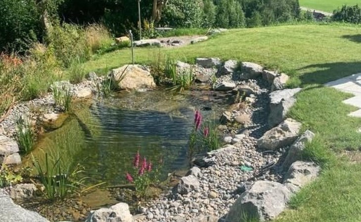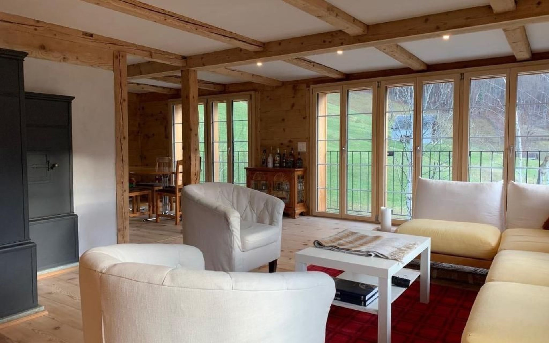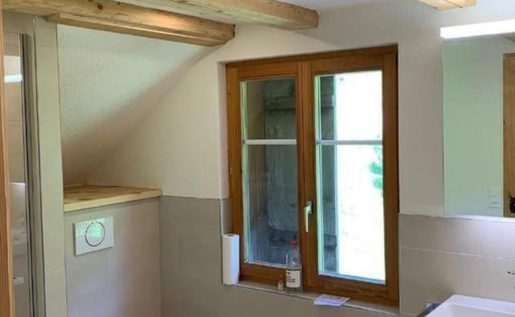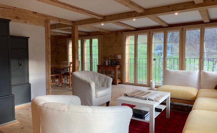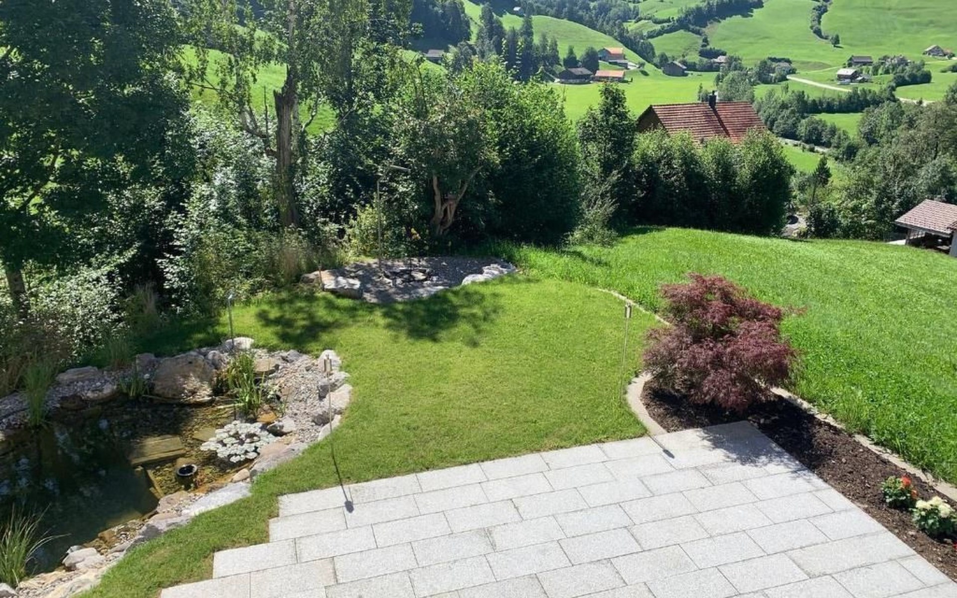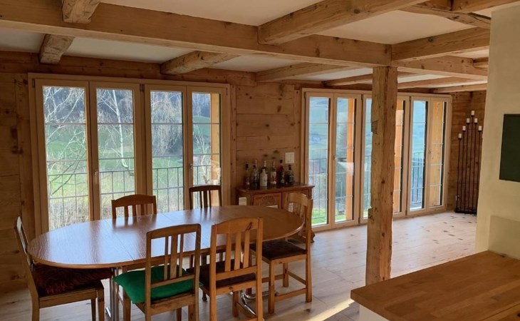 Garden: Large terrace 40 m2, natural swimming pond, barbecue area, lawn, further seating area (approx. 10 m2) with unobstructed view of the Churfirsten, the Speer and the valley. Garden furniture available.