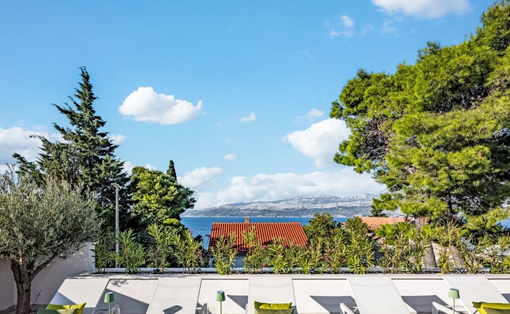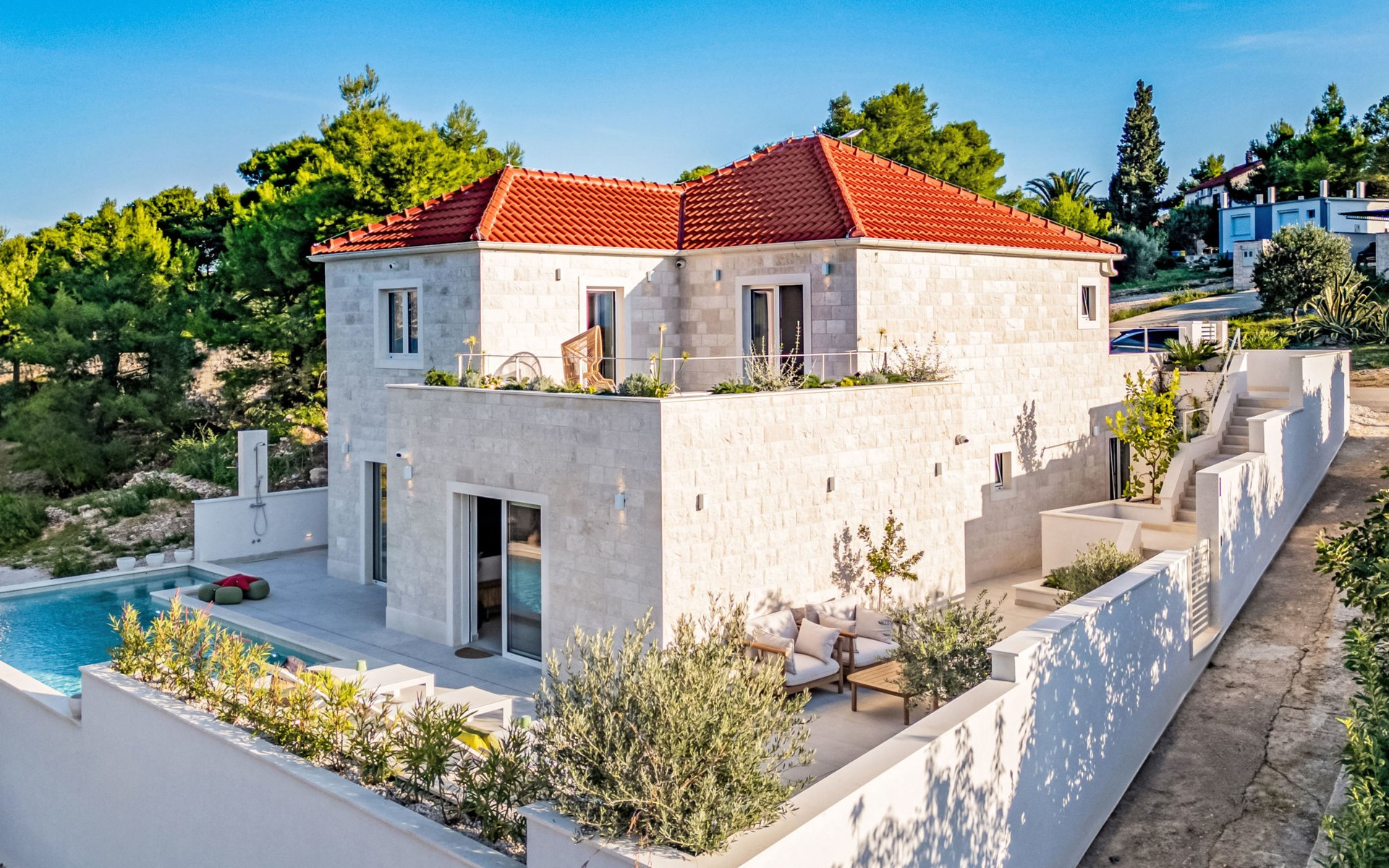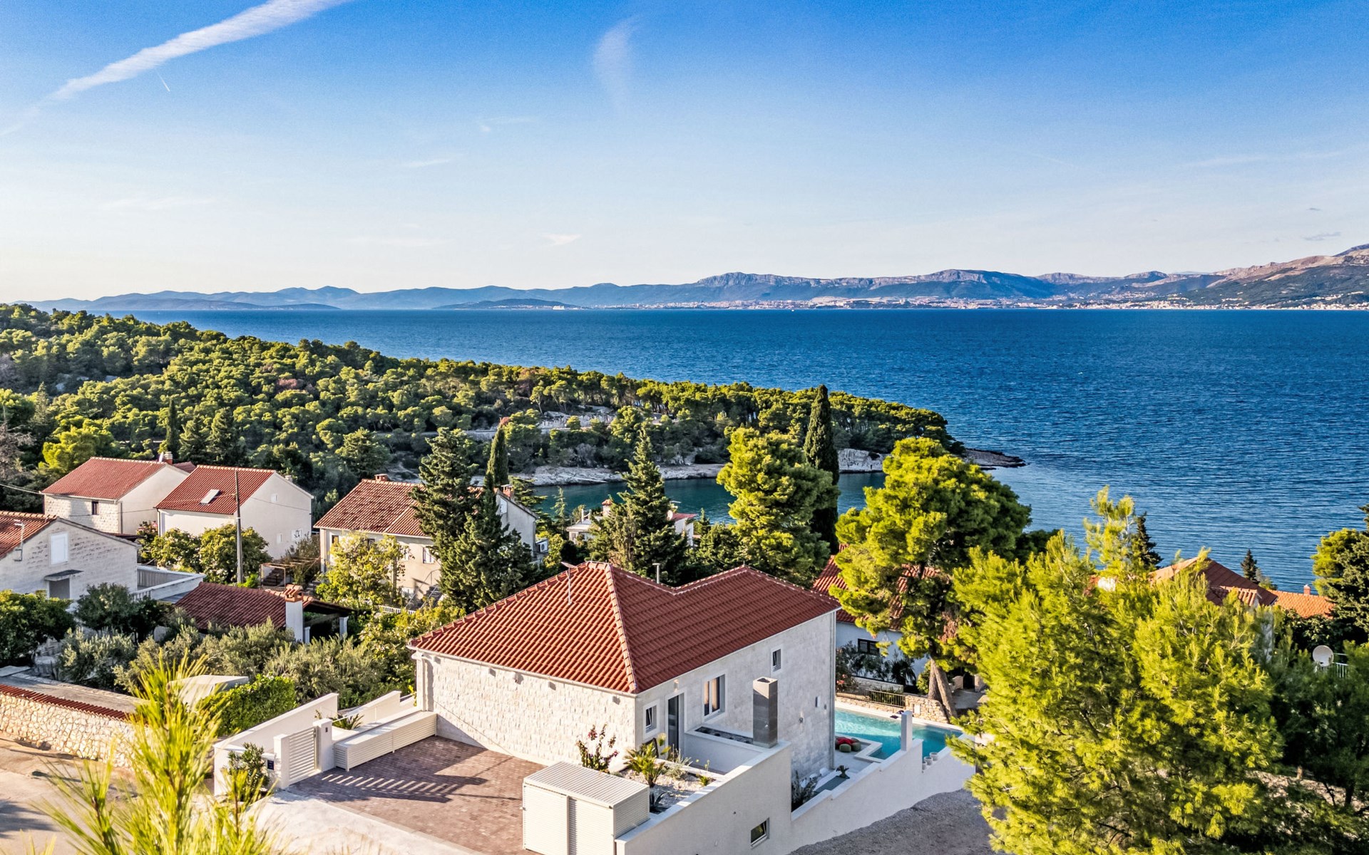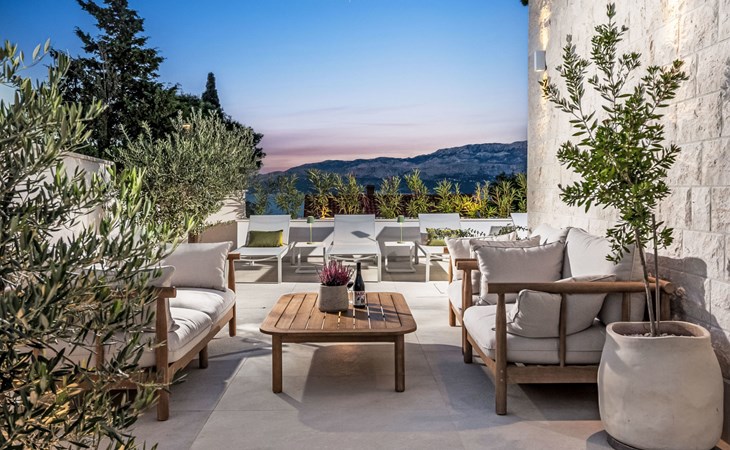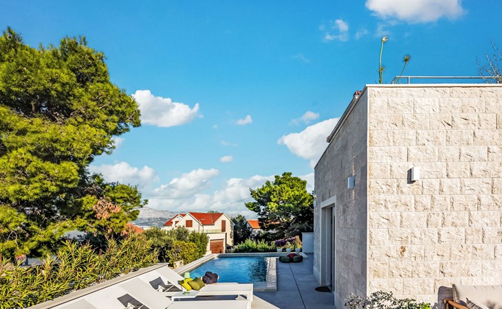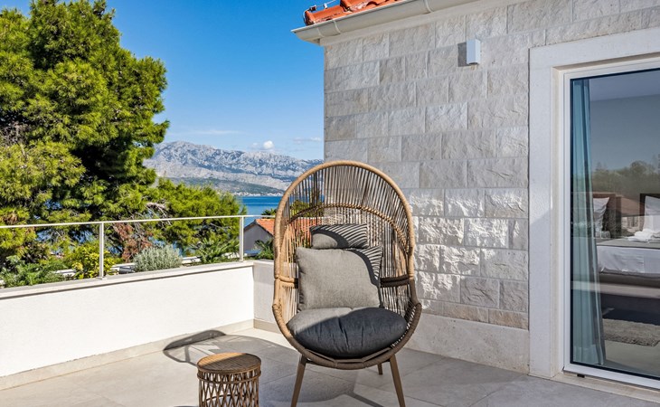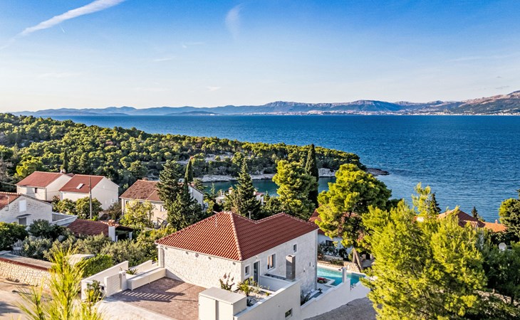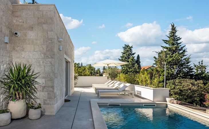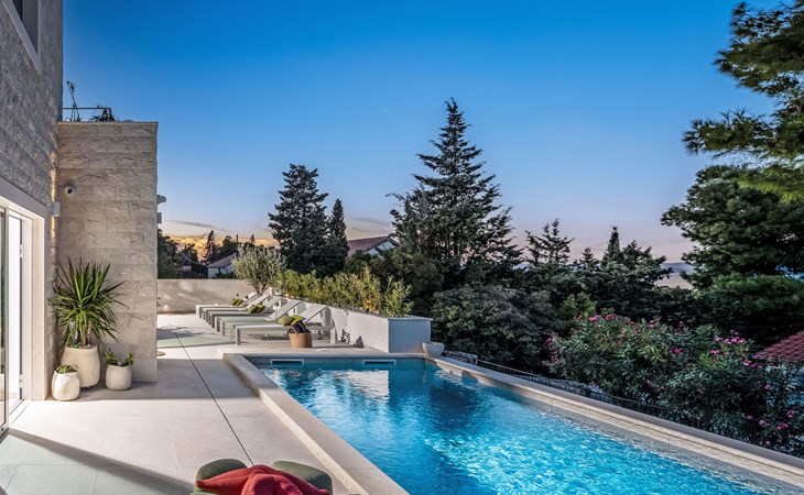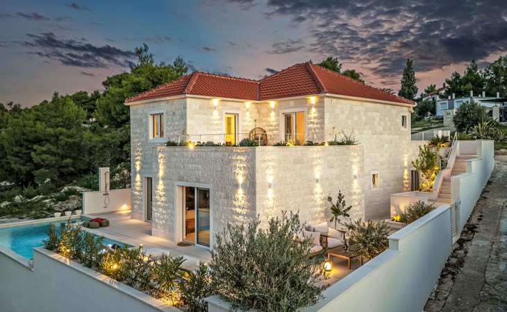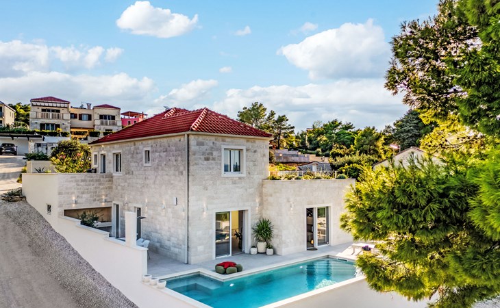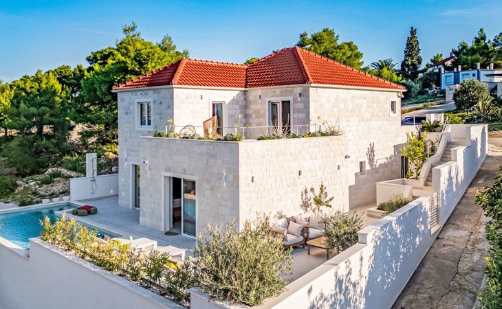 Splitska 5 km from Supetar: Beautiful villa "Brax8", built in 2024. In a quiet, sunny, elevated position, 200 m from the sea, 500 m from the beach. Private: property 370 m2, swimming pool angular (8 x 3 m, depth 150 cm, seasonal availability: 01.May. - 01.Oct.) with internal staircase. Outdoor shower, terrace (50 m2), garden furniture, barbecue. In the house: internet access, washing machine, tumble dryer. Parking (for 3 cars) at the house on the premises. Shop 400 m, supermarket 5 km, shopping centre 5 km, restaurant, café, bus stop 400 m, pebble beach 500 m.