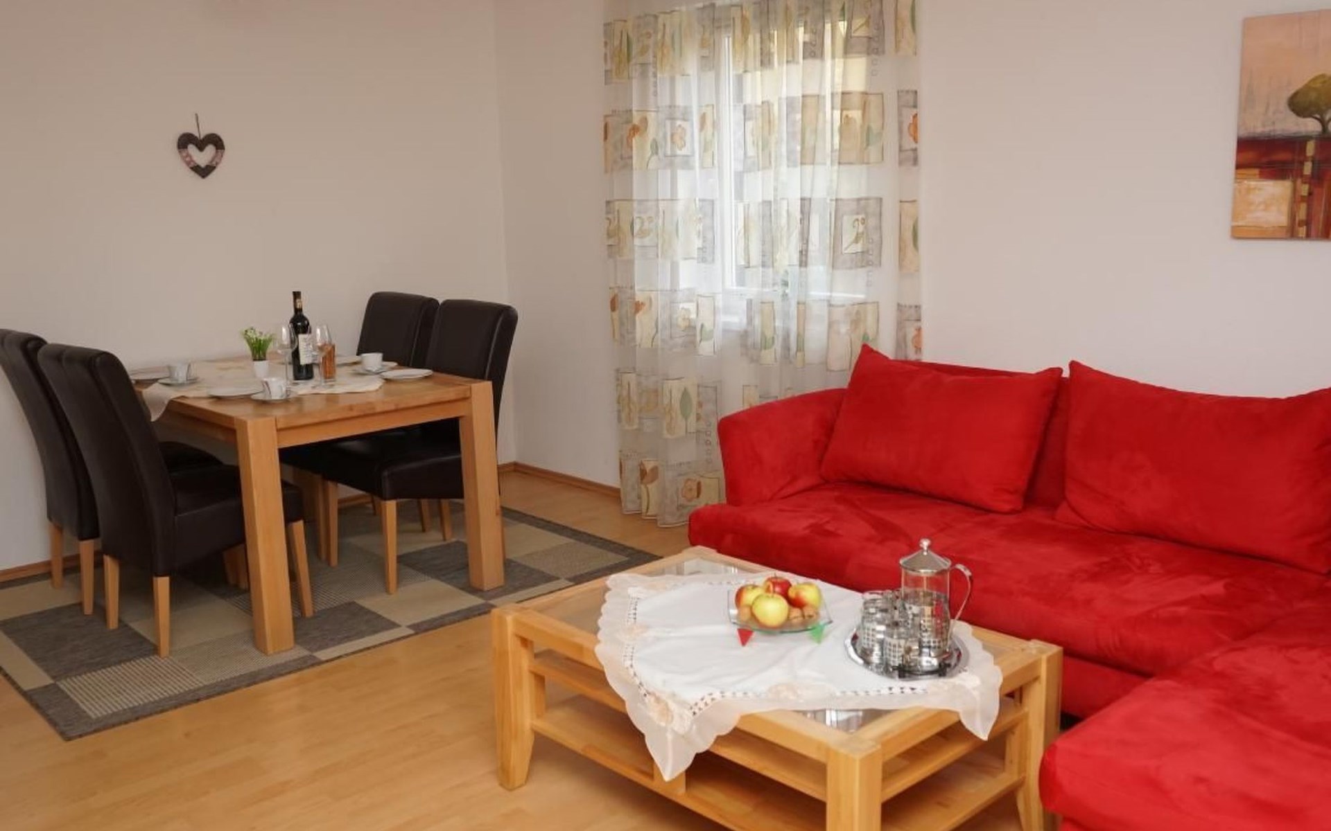 The large covered balcony is furnished with a seating area for four people so that you can enjoy a cosy breakfast outside in the morning sun and start the day in a relaxed manner.