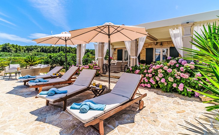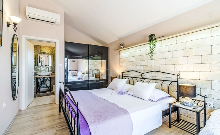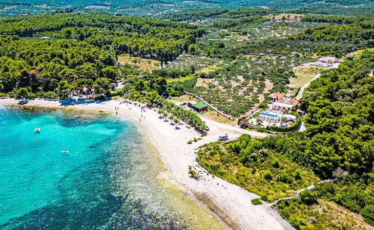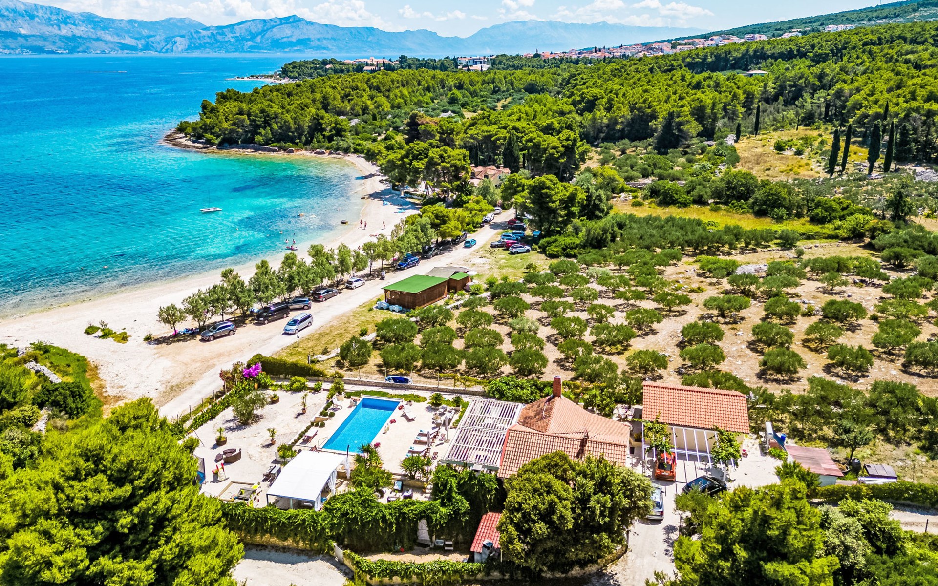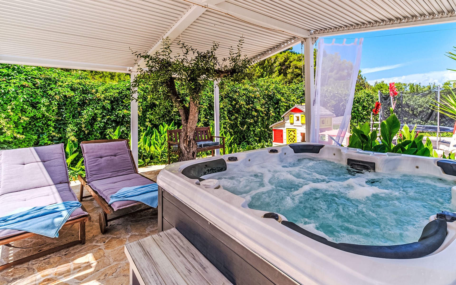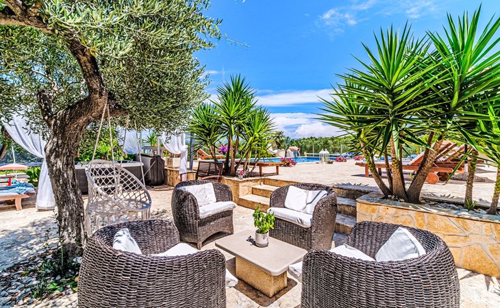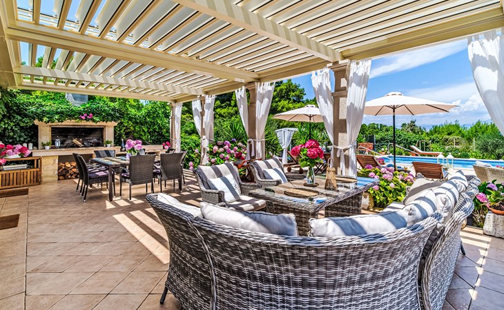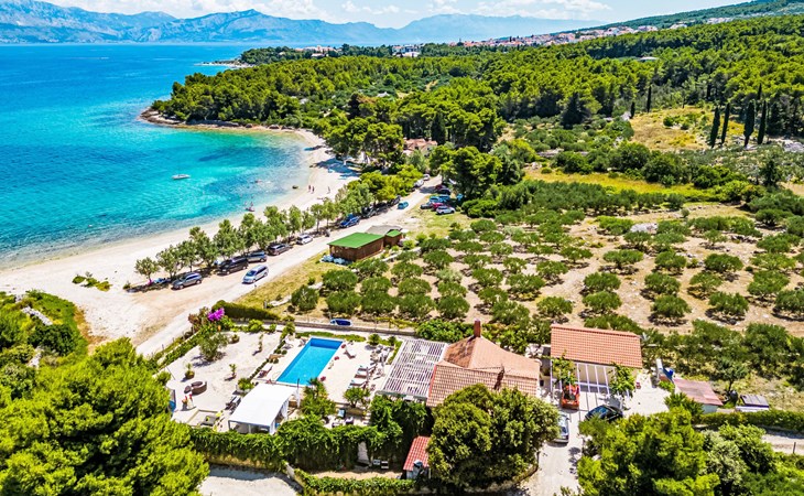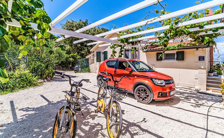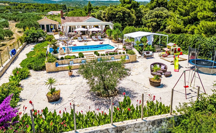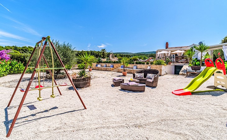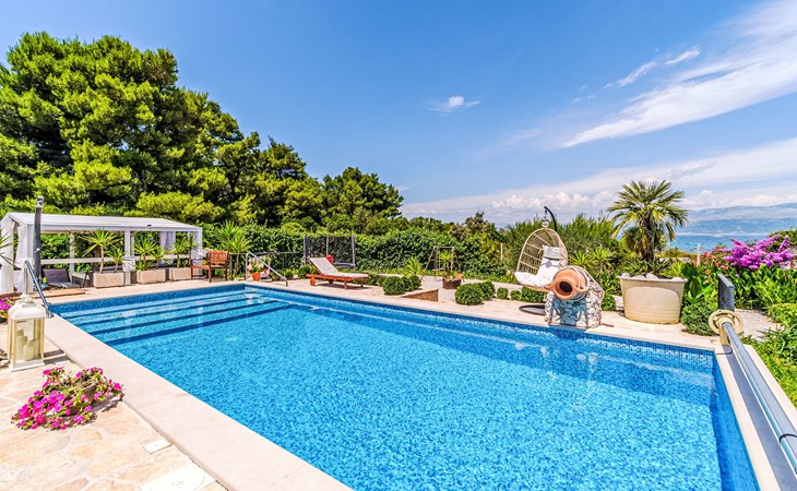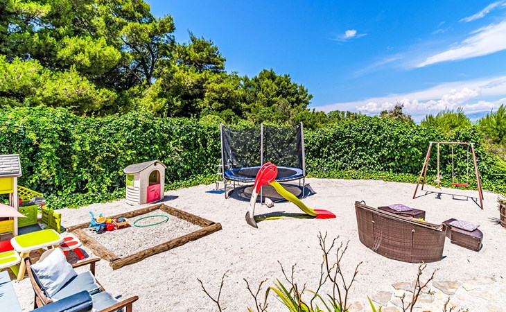Mirca: Single-family house "Villa Mutnik". 2.4 km from the centre of Supetar, in a secluded, quiet, sunny position, at the seaside, on the beach. Private: property 1'500 m2 (fenced), garden with wildlife garden, swimming pool angular, heated (10 x 4 m, depth 150 cm, seasonal availability: 01.Apr. - 15.Nov.) with internal staircase. Outdoor shower, hot tub, terrace (100 m2), barbecue (swing, sandbox). In the house: internet access, trampoline, washing machine. Available: bicycles (6). Motor access to the house (500 m via unmade road). Parking at the house on the premises. Shop 1.2 km, restaurant 1.6 km, bus stop 4.2 km, pebble beach 20 m. The unit consists of the small, separate house and the main house rented as one unit. 1 SUP board for use in house.