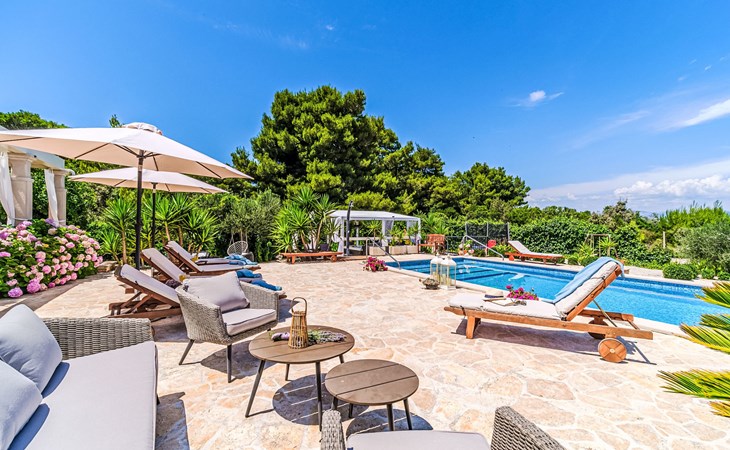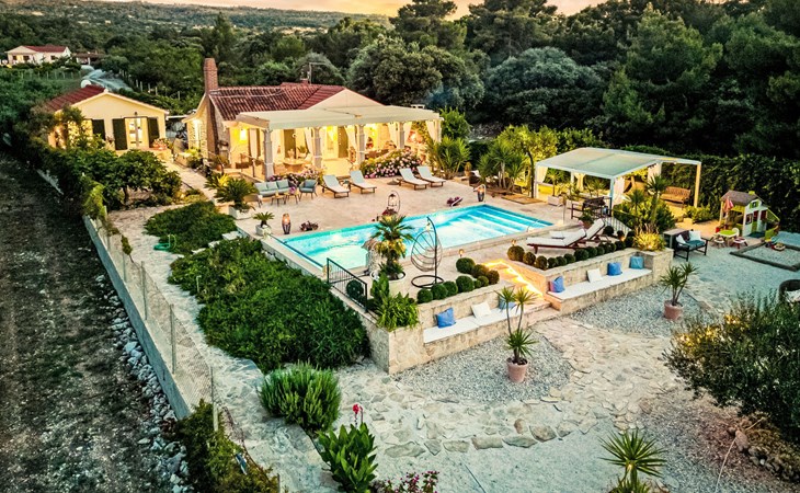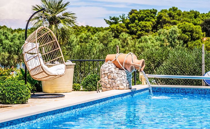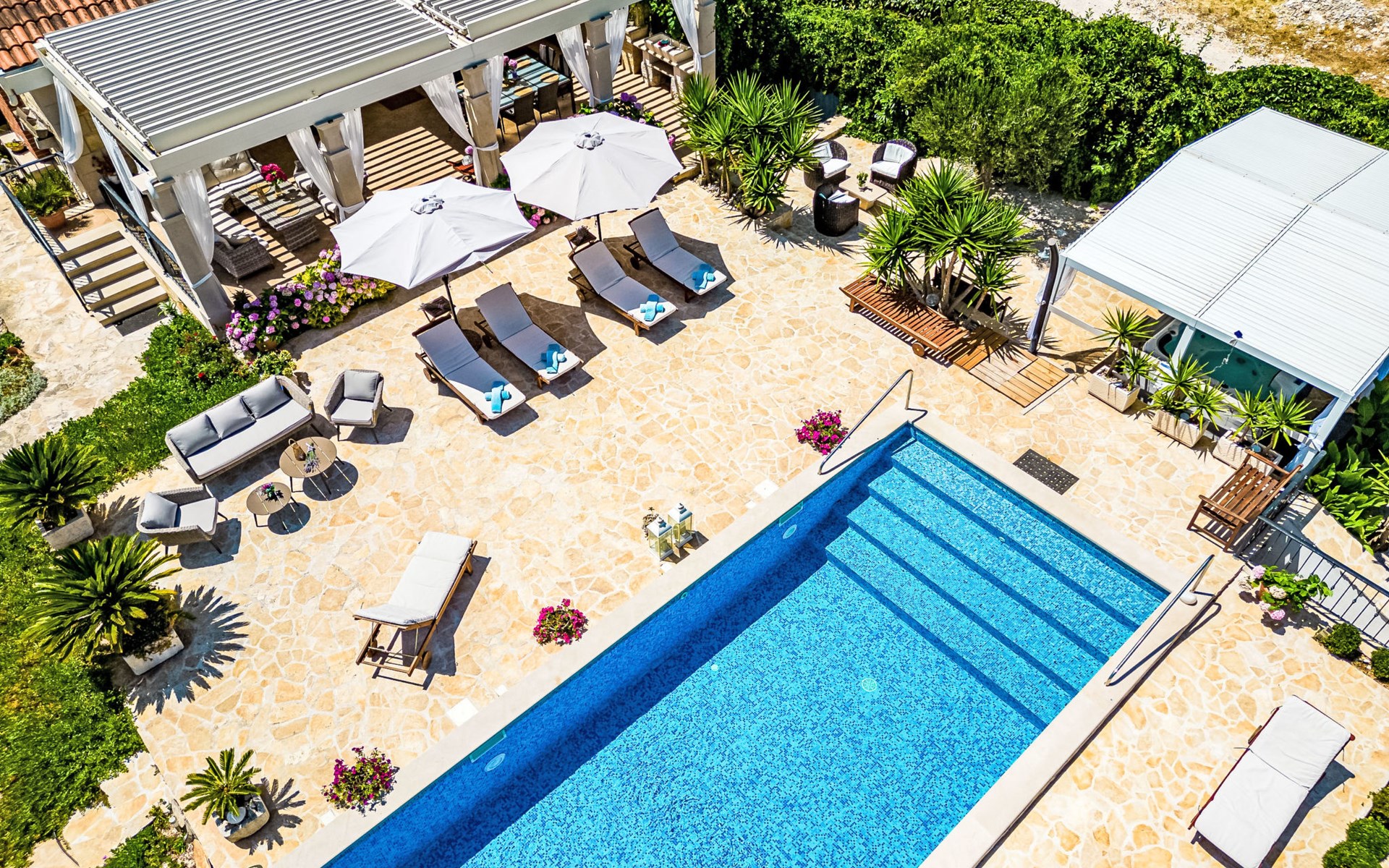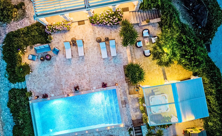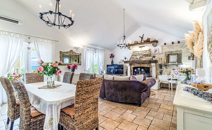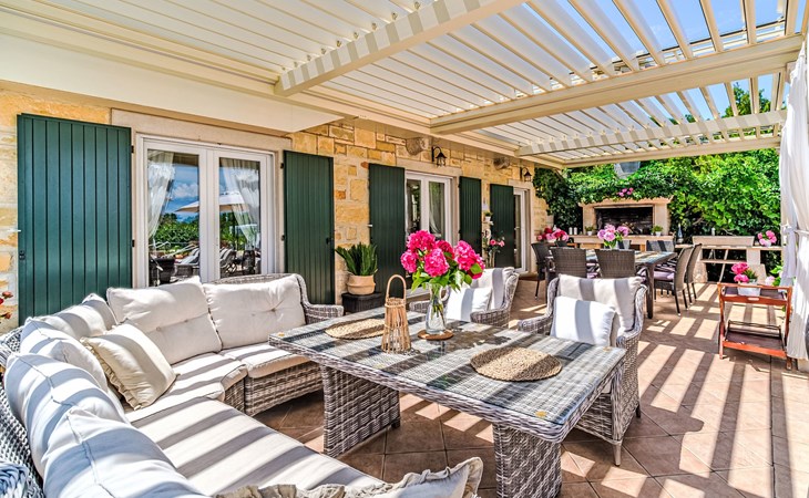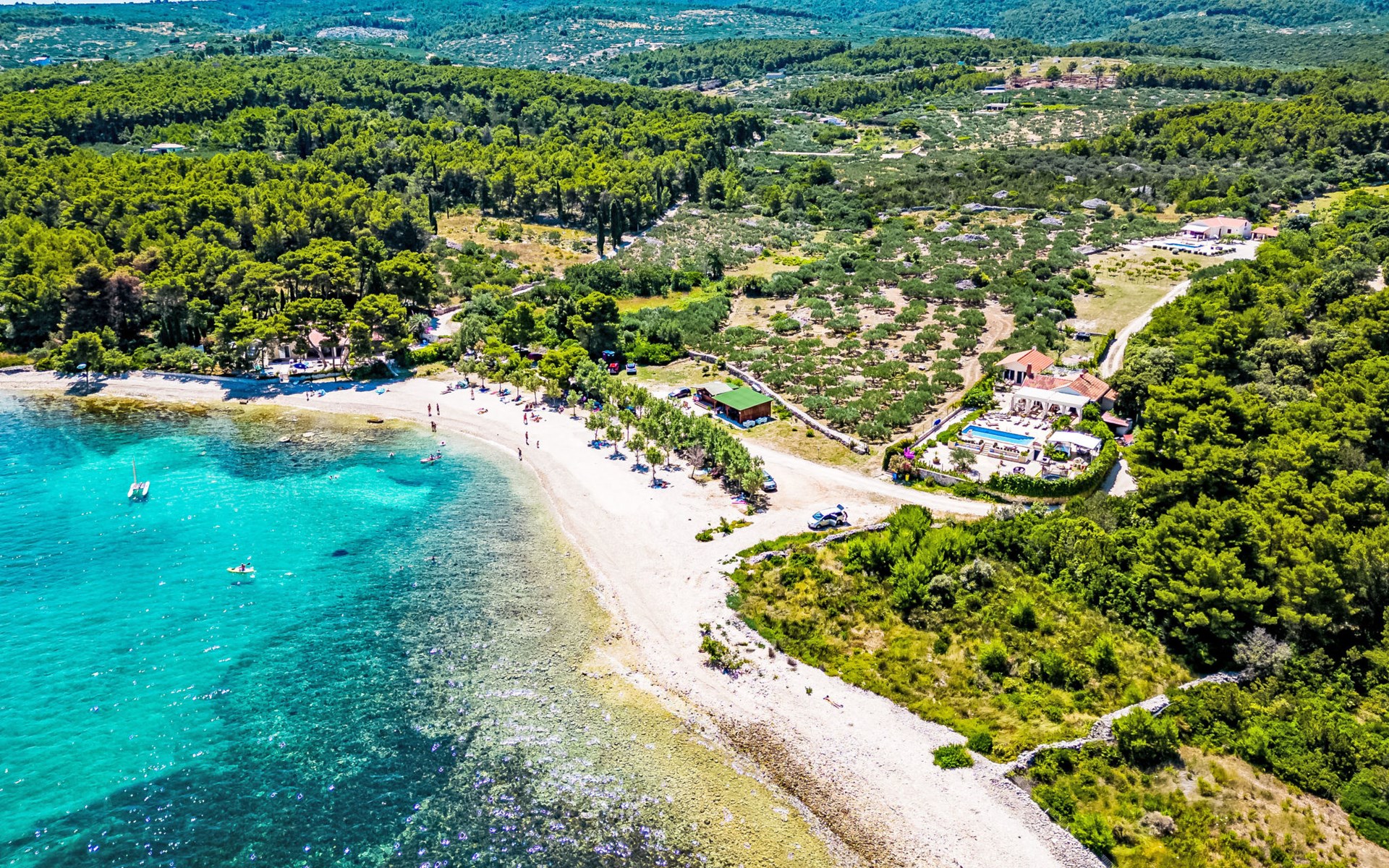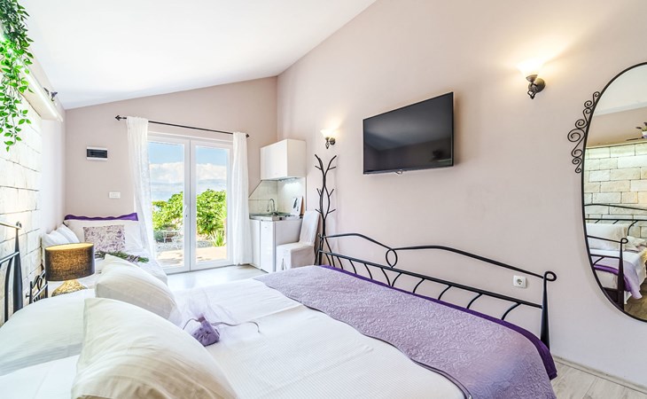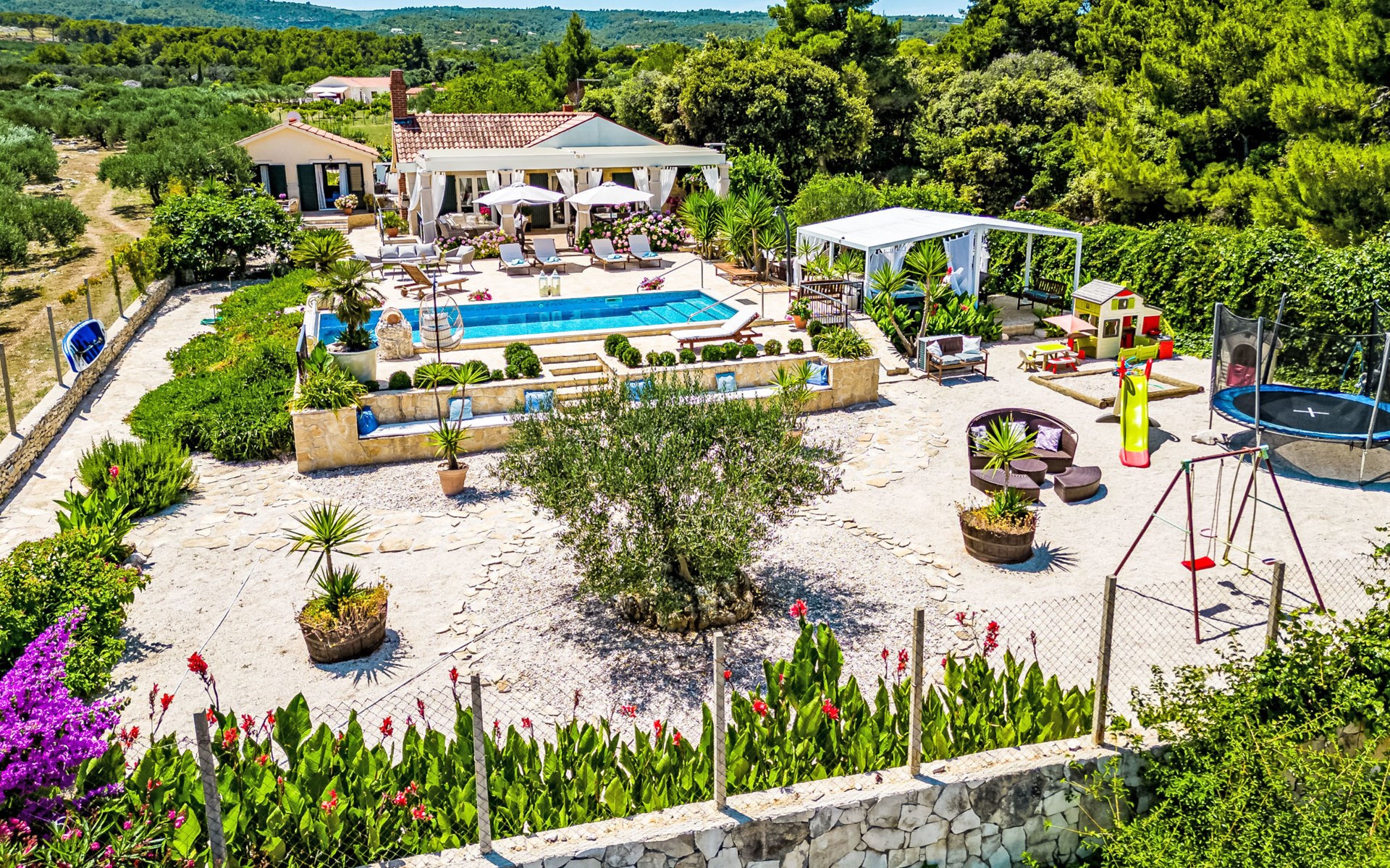 Mirca: Single-family house "Villa Mutnik". 2.4 km from the centre of Supetar, in a secluded, quiet, sunny position, at the seaside, on the beach. Private: property 1'500 m2 (fenced), garden with wildlife garden, swimming pool angular, heated (10 x 4 m, depth 150 cm, seasonal availability: 01.Apr. - 15.Nov.) with internal staircase. Outdoor shower, hot tub, terrace (100 m2), barbecue (swing, sandbox). In the house: internet access, trampoline, washing machine. Available: bicycles (6). Motor access to the house (500 m via unmade road). Parking at the house on the premises. Shop 1.2 km, restaurant 1.6 km, bus stop 4.2 km, pebble beach 20 m. The unit consists of the small, separate house and the main house rented as one unit. 1 SUP board for use in house.