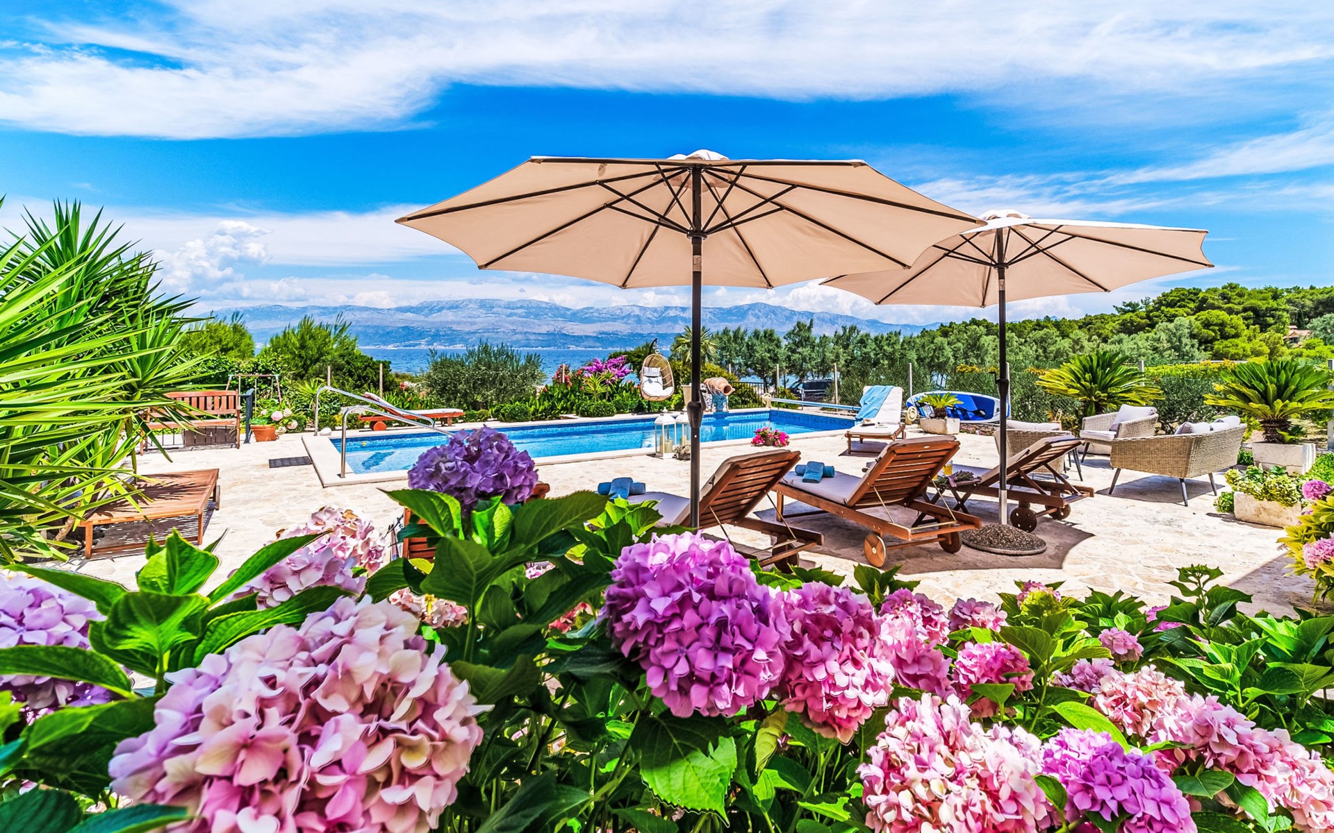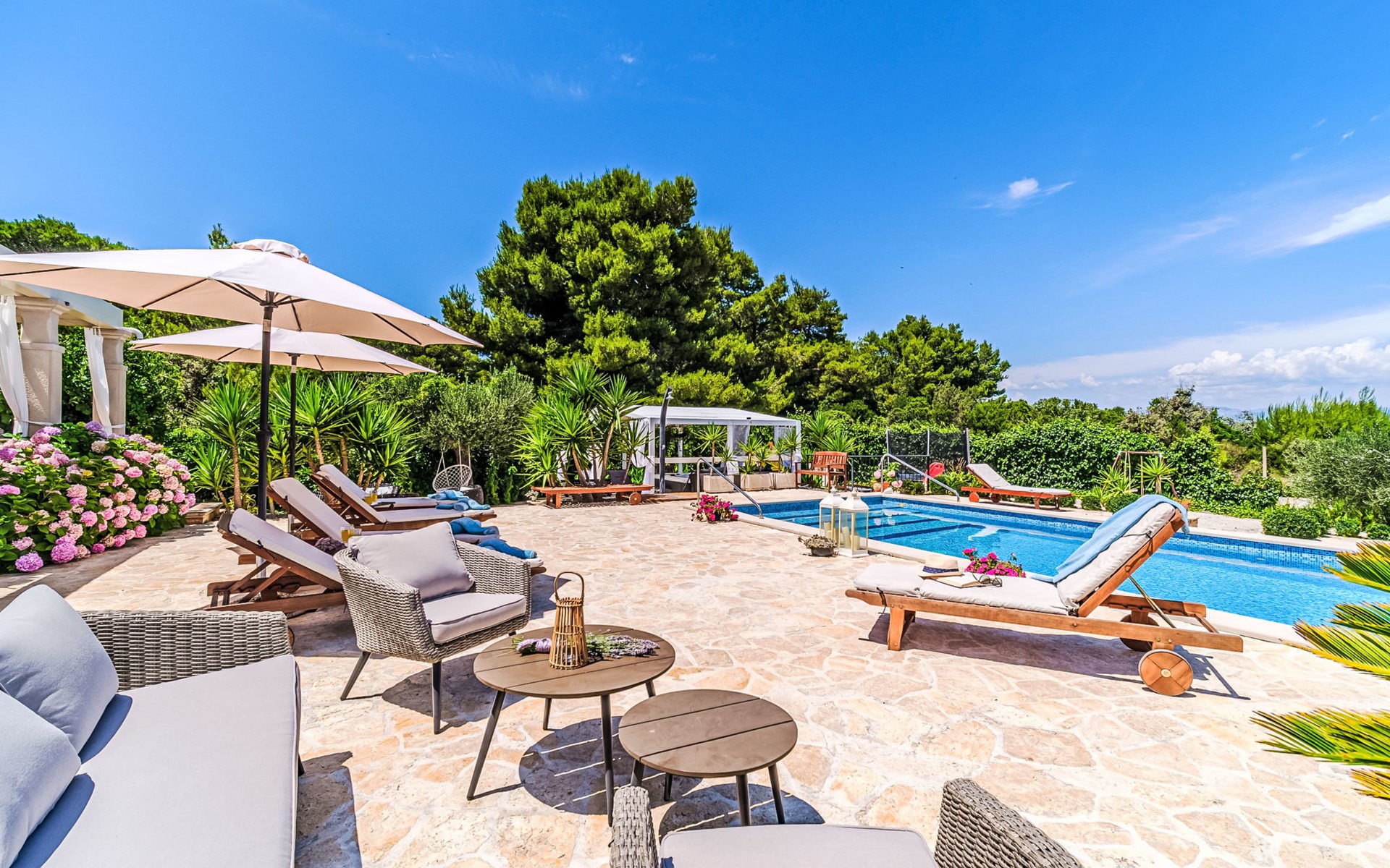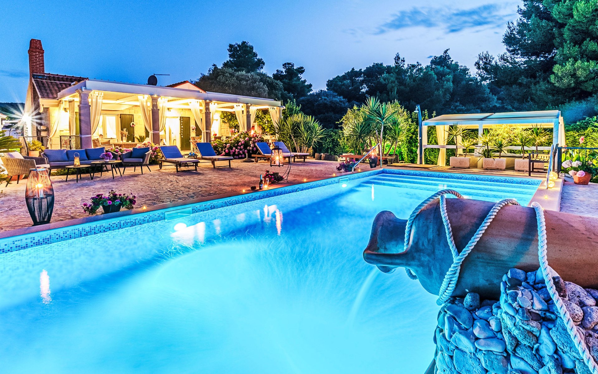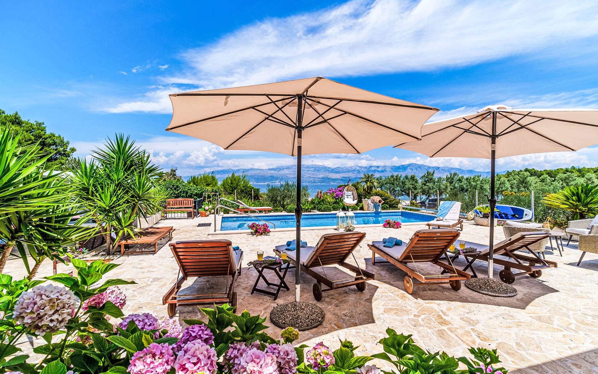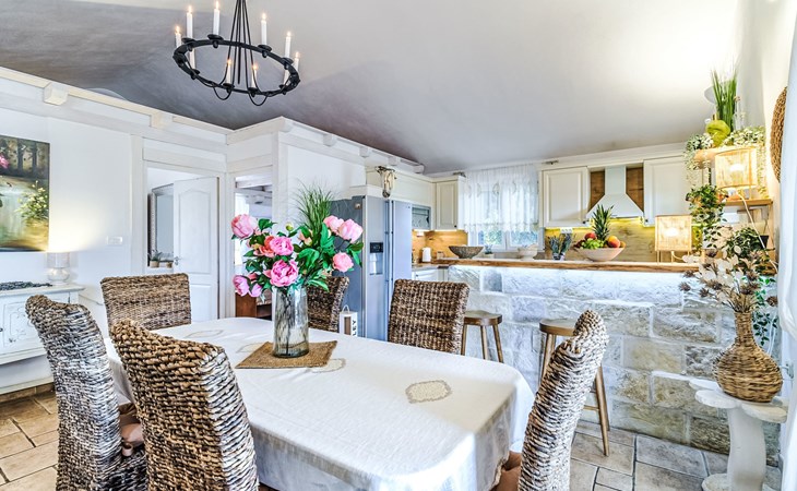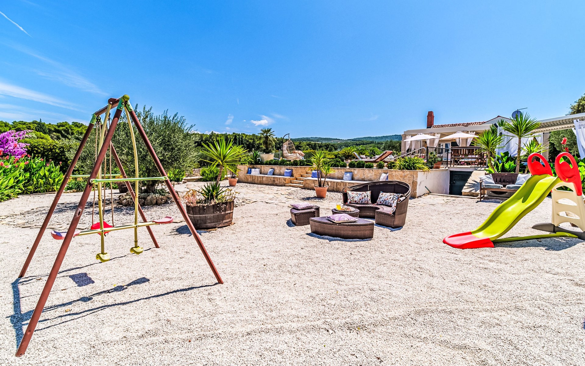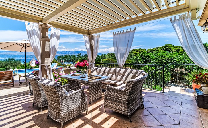 Mirca: Single-family house "Villa Mutnik". 2.4 km from the centre of Supetar, in a secluded, quiet, sunny position, at the seaside, on the beach. Private: property 1'500 m2 (fenced), garden with wildlife garden, swimming pool angular, heated (10 x 4 m, depth 150 cm, seasonal availability: 01.Apr. - 15.Nov.) with internal staircase. Outdoor shower, hot tub, terrace (100 m2), barbecue (swing, sandbox). In the house: internet access, trampoline, washing machine. Available: bicycles (6). Motor access to the house (500 m via unmade road). Parking at the house on the premises. Shop 1.2 km, restaurant 1.6 km, bus stop 4.2 km, pebble beach 20 m. The unit consists of the small, separate house and the main house rented as one unit. 1 SUP board for use in house.