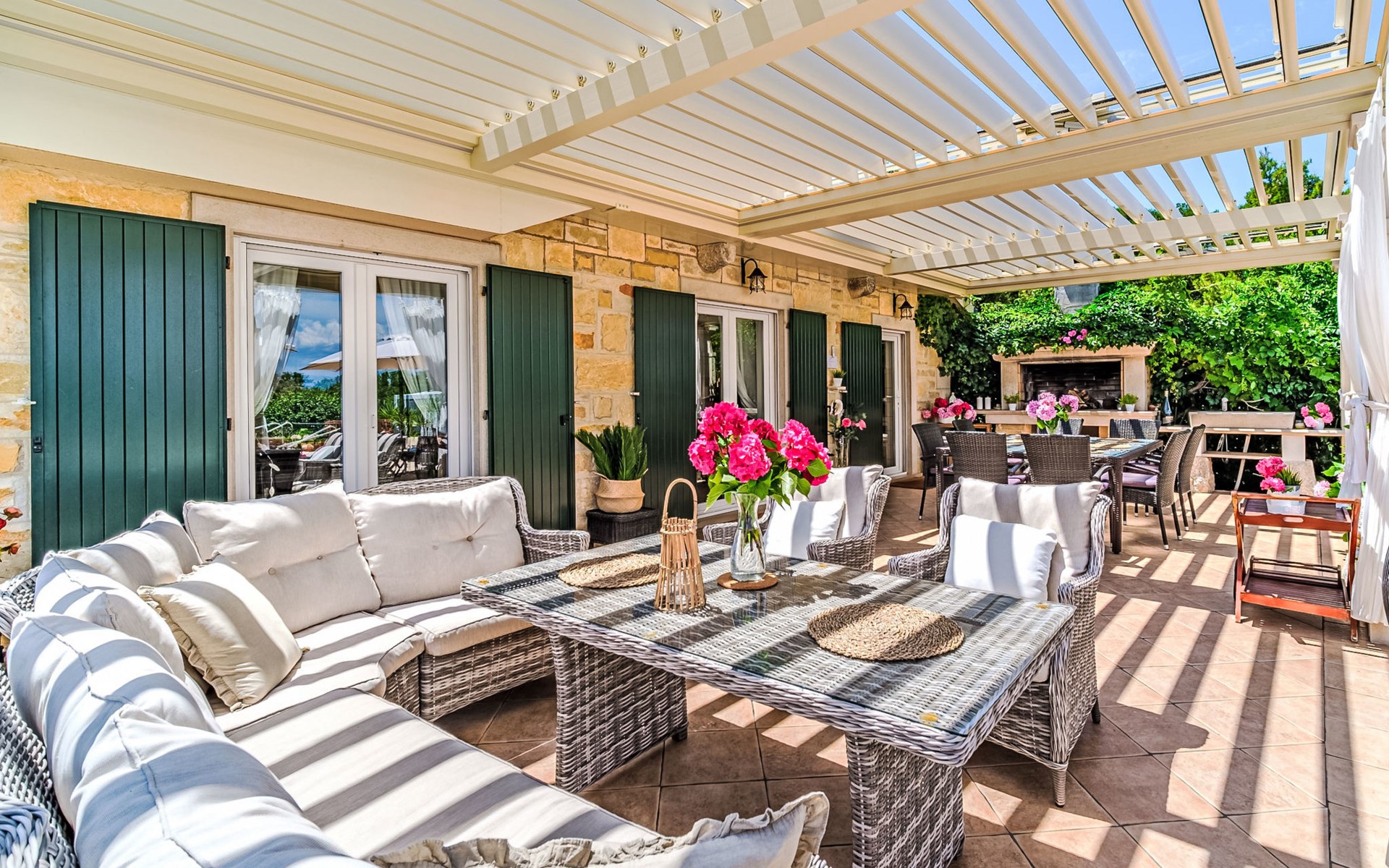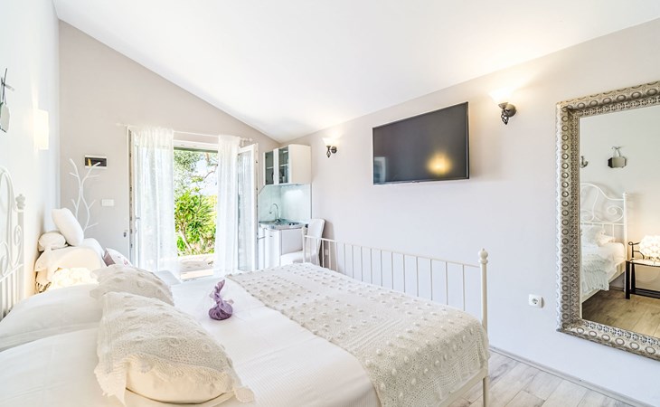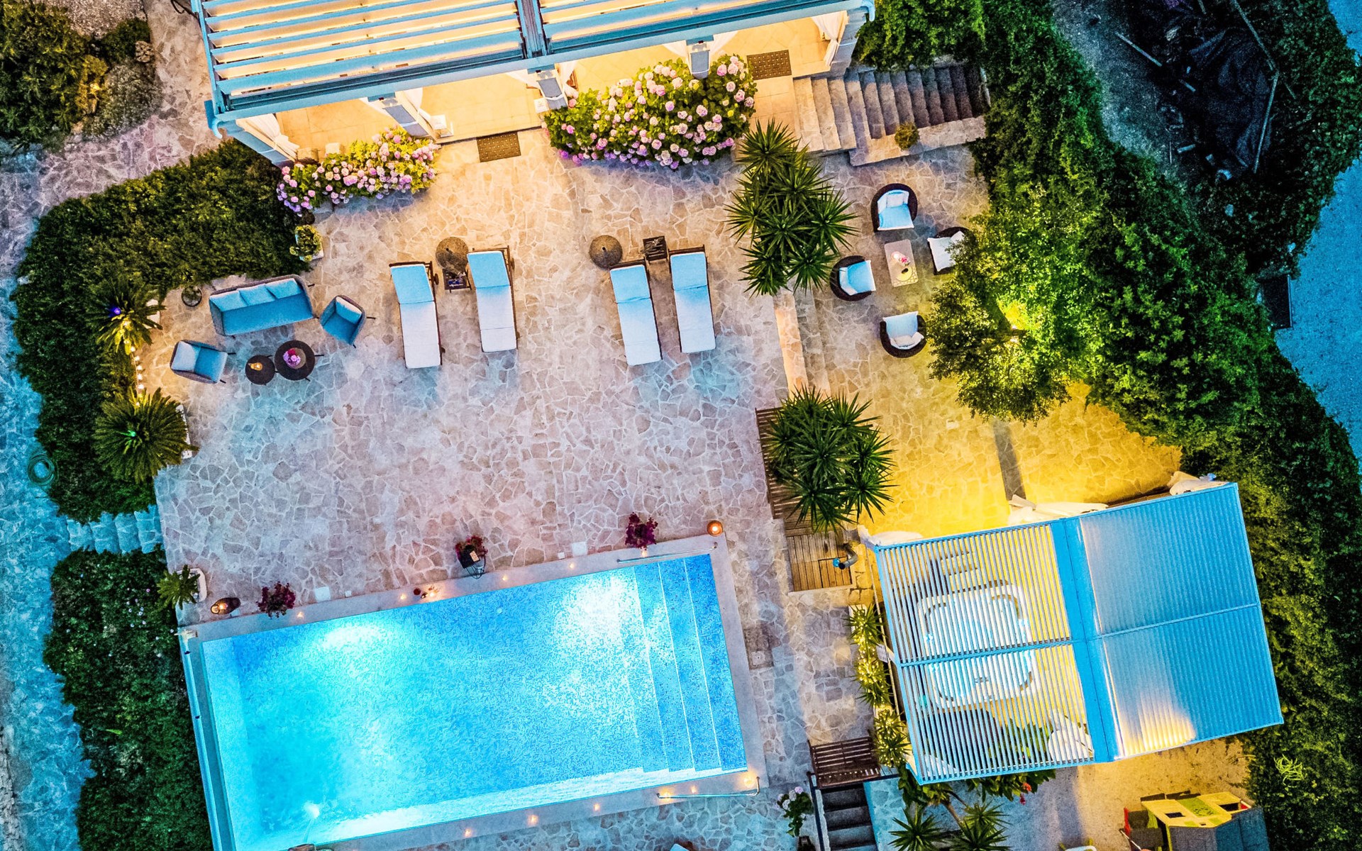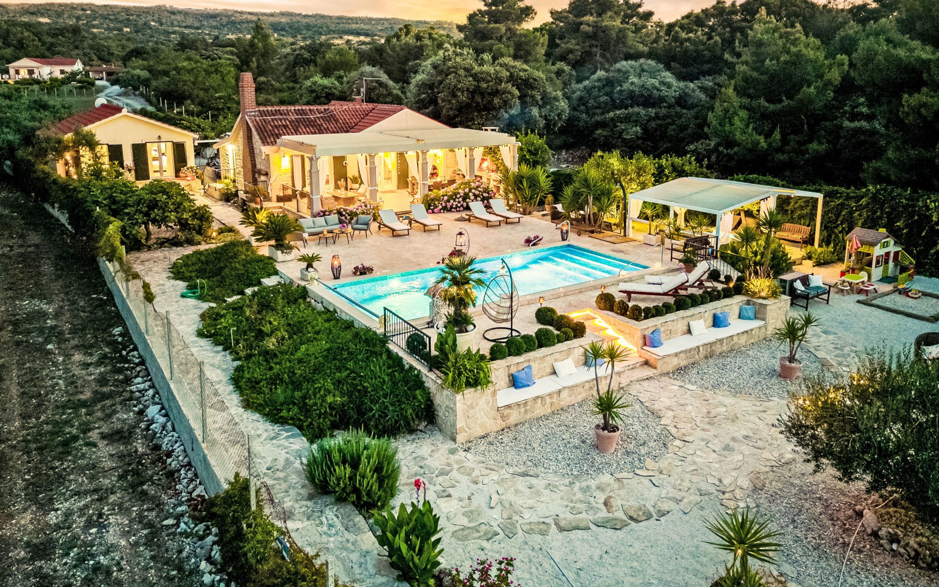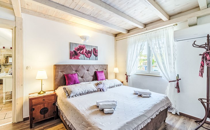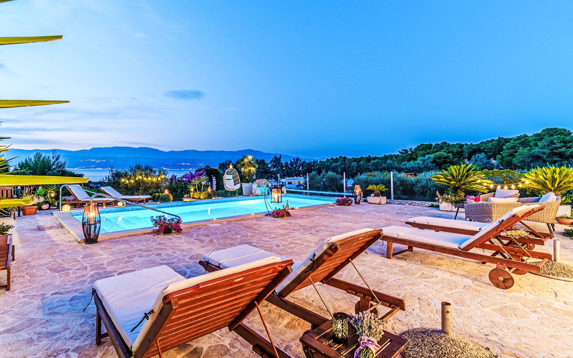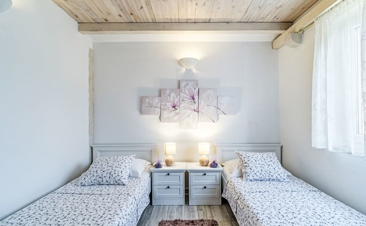 Mirca: Single-family house "Villa Mutnik". 2.4 km from the centre of Supetar, in a secluded, quiet, sunny position, at the seaside, on the beach. Private: property 1'500 m2 (fenced), garden with wildlife garden, swimming pool angular, heated (10 x 4 m, depth 150 cm, seasonal availability: 01.Apr. - 15.Nov.) with internal staircase. Outdoor shower, hot tub, terrace (100 m2), barbecue (swing, sandbox). In the house: internet access, trampoline, washing machine. Available: bicycles (6). Motor access to the house (500 m via unmade road). Parking at the house on the premises. Shop 1.2 km, restaurant 1.6 km, bus stop 4.2 km, pebble beach 20 m. The unit consists of the small, separate house and the main house rented as one unit. 1 SUP board for use in house.