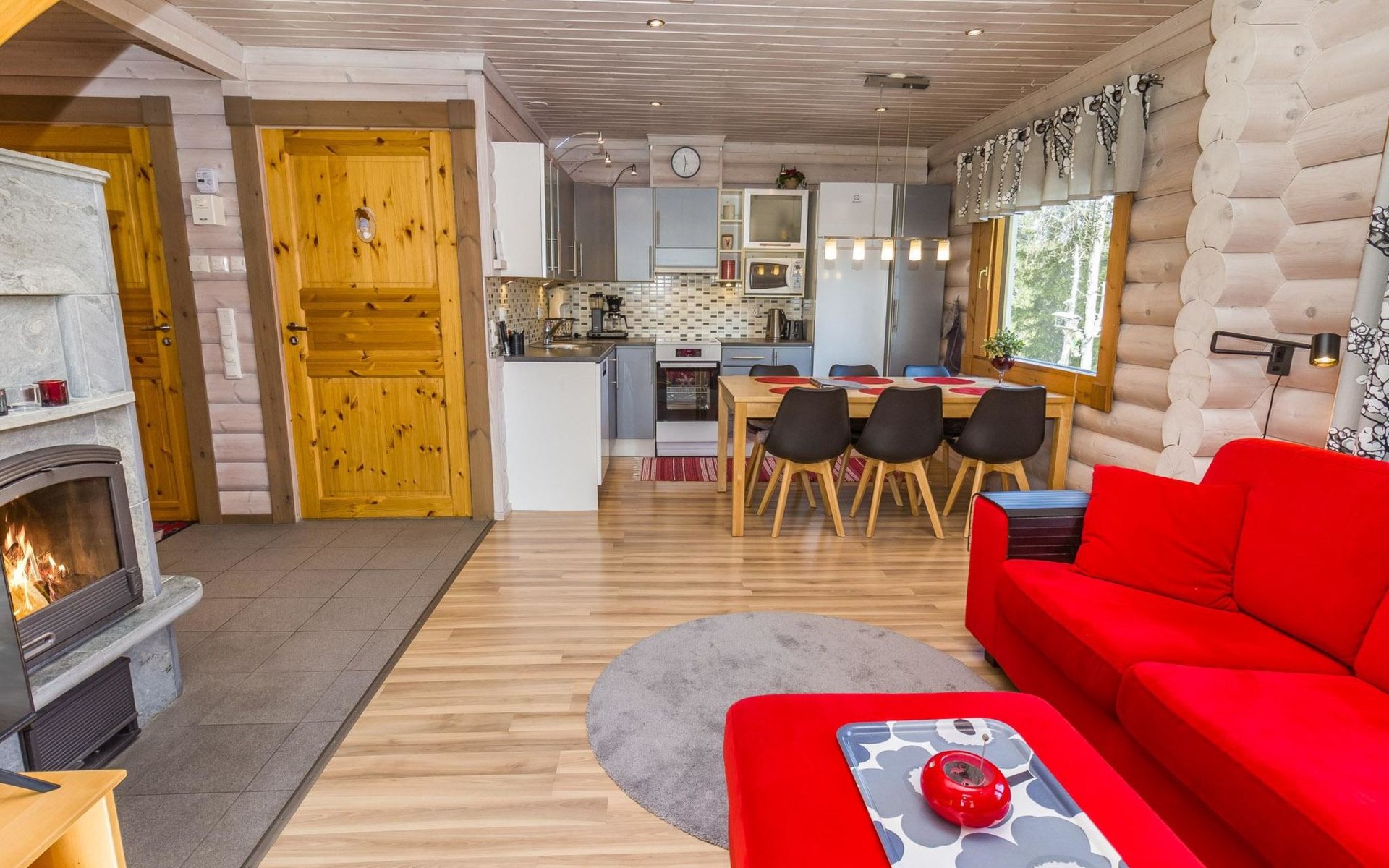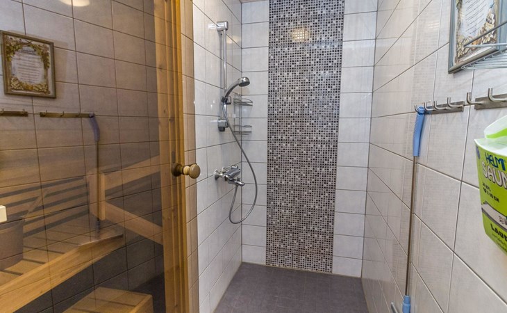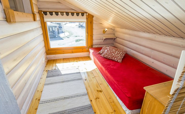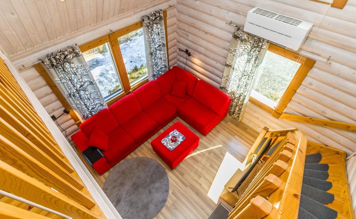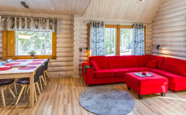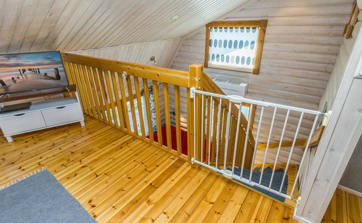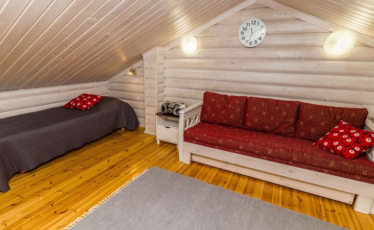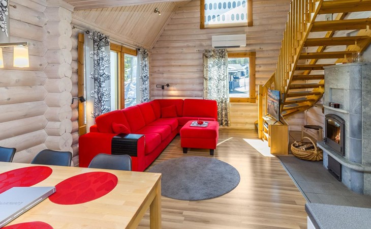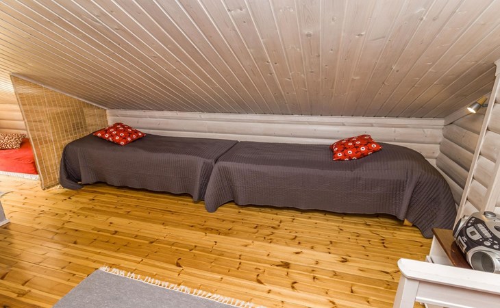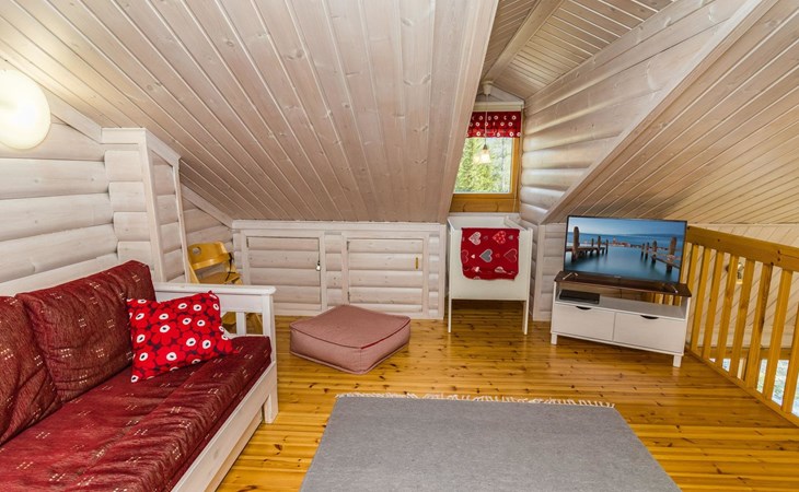 Welcome to enjoy a holiday in this magnificent log-built semi-detached cabin, which offers ideal conditions for both families and groups of friends. This bright and spacious cabin is perfect for relaxing and enjoying nature year-round. The ground floor features a bedroom with a double bed. The spacious loft has two single beds, a sofa bed for two, and additional mattresses. The cabin accommodates a maximum of 6 people, so there is plenty of space for everyone. The living room/kitchen allows you to prepare delicious meals during your stay, and the electric sauna provides relaxing moments after an active day.
