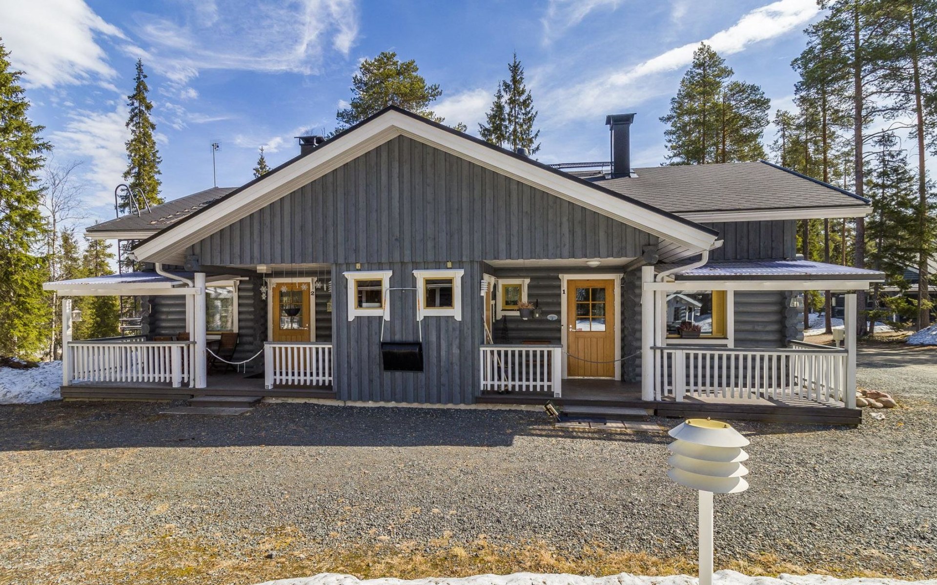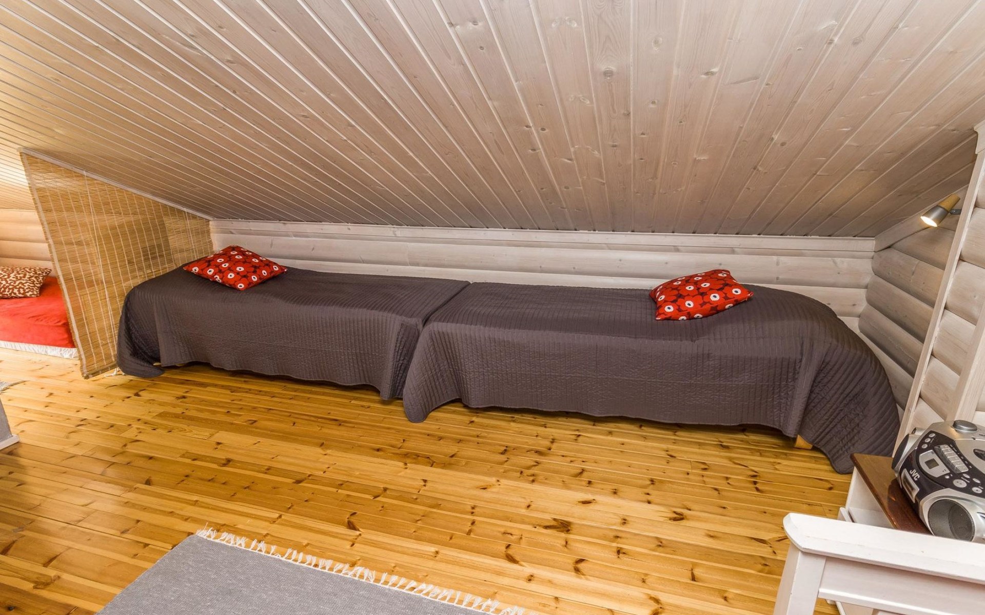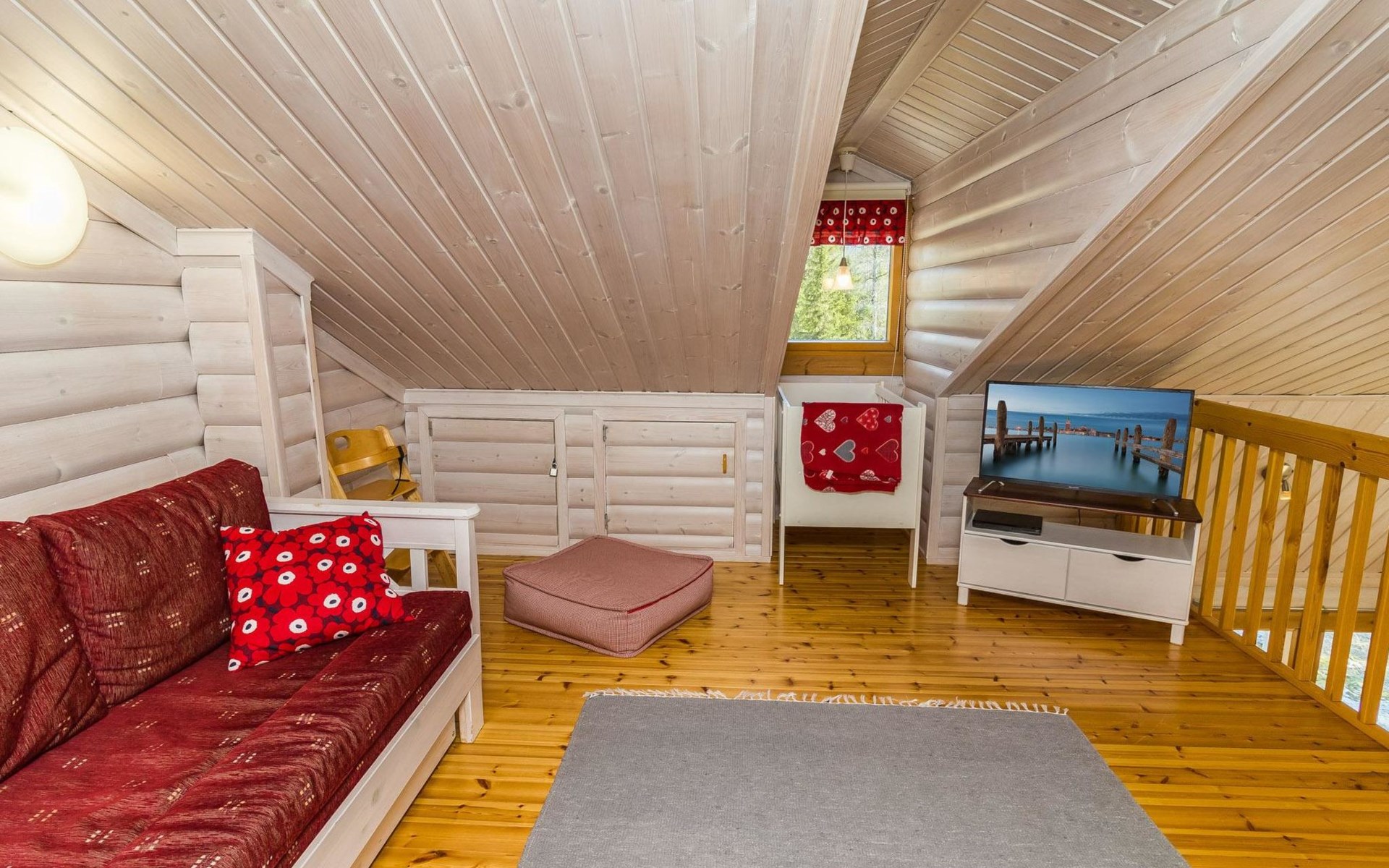 Welcome to enjoy a holiday in this magnificent log-built semi-detached cabin, which offers ideal conditions for both families and groups of friends. This bright and spacious cabin is perfect for relaxing and enjoying nature year-round. The ground floor features a bedroom with a double bed. The spacious loft has two single beds, a sofa bed for two, and additional mattresses. The cabin accommodates a maximum of 6 people, so there is plenty of space for everyone. The living room/kitchen allows you to prepare delicious meals during your stay, and the electric sauna provides relaxing moments after an active day.