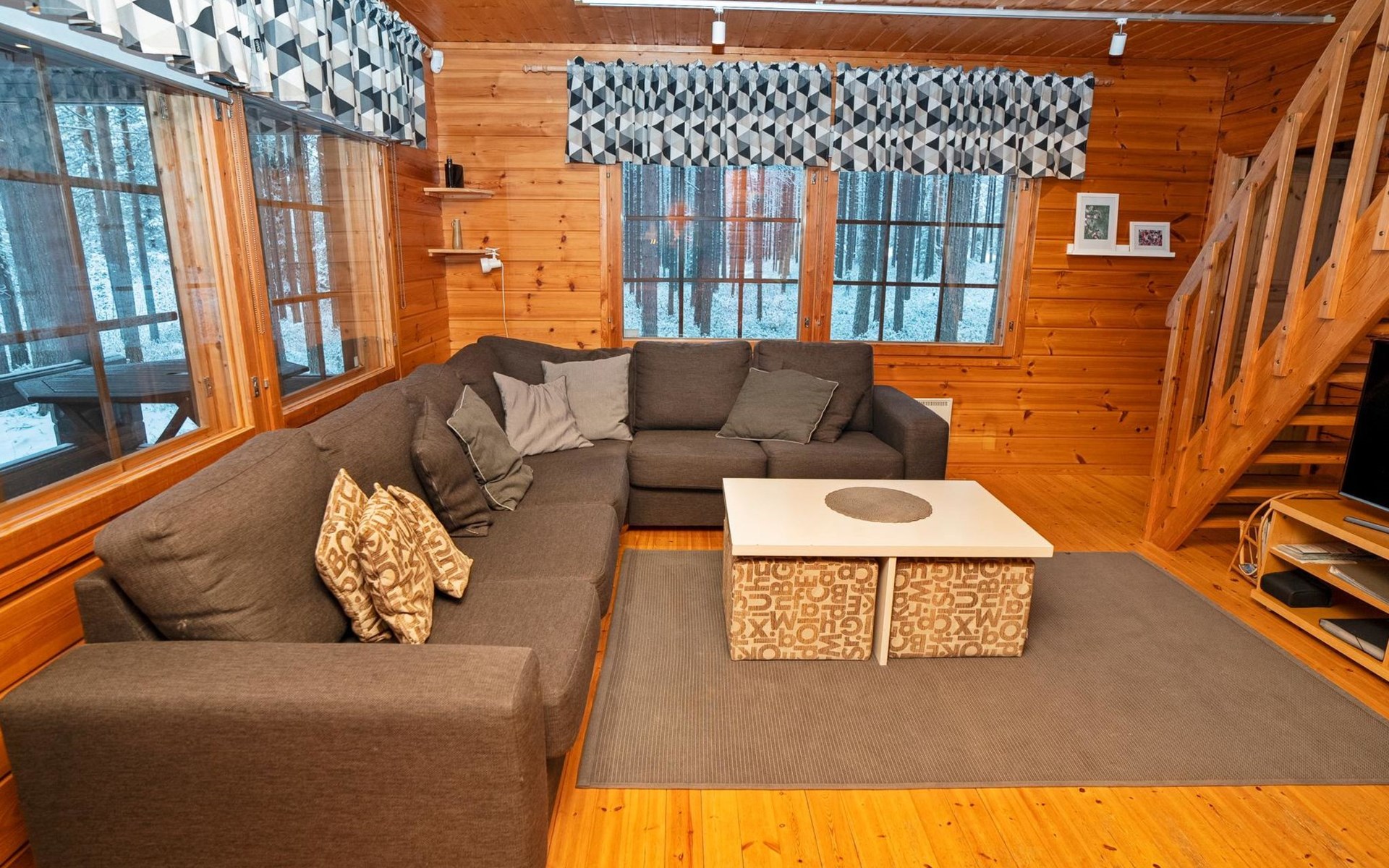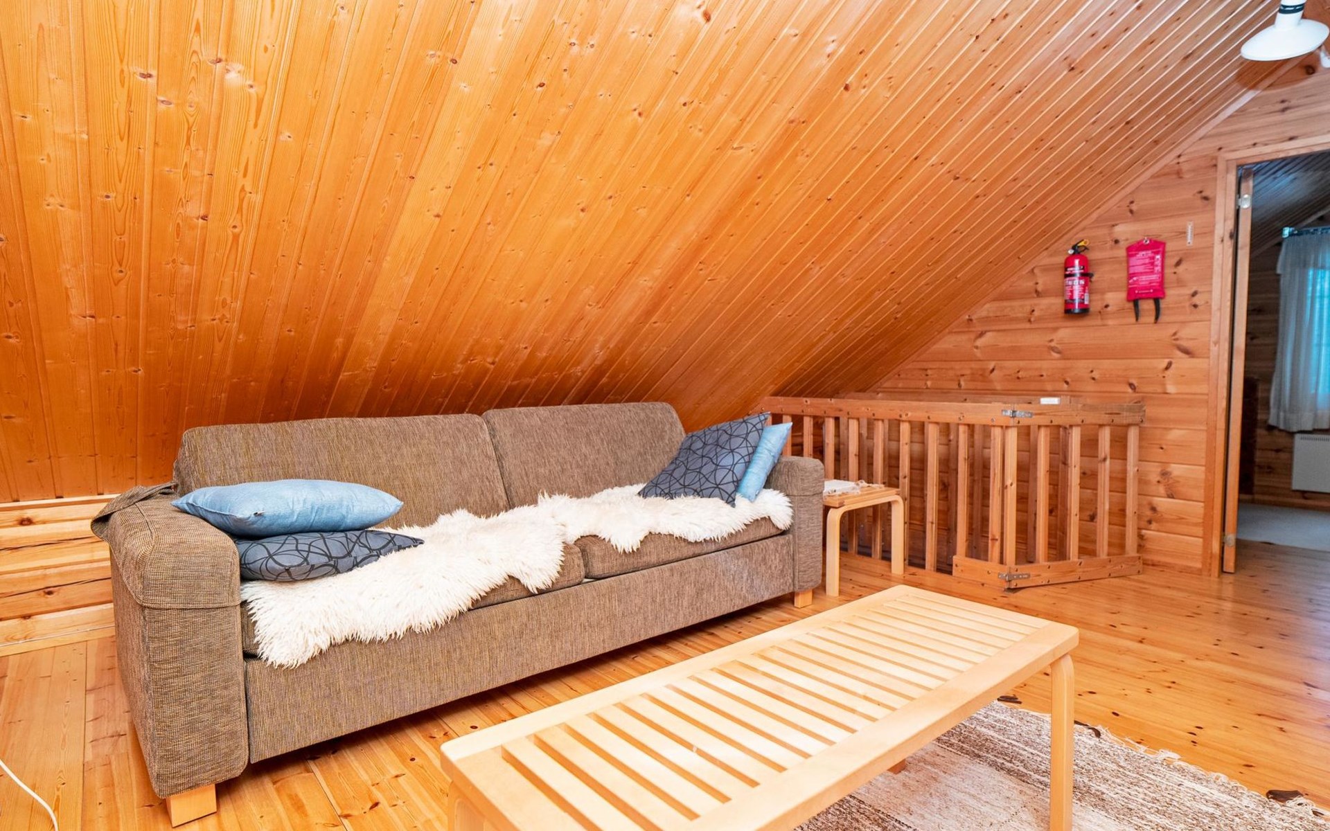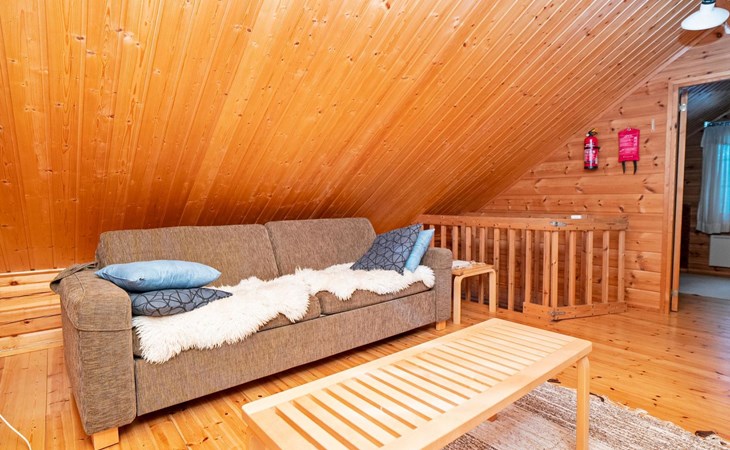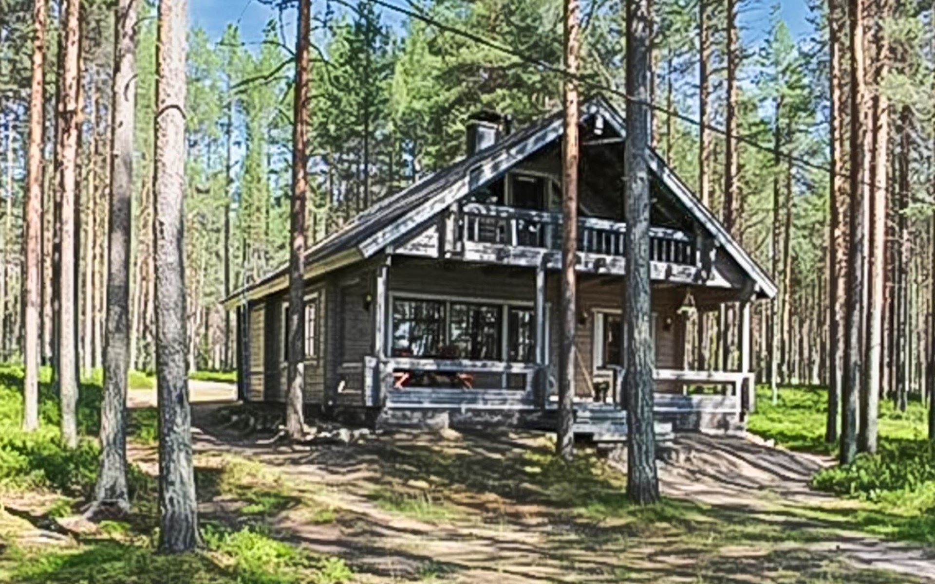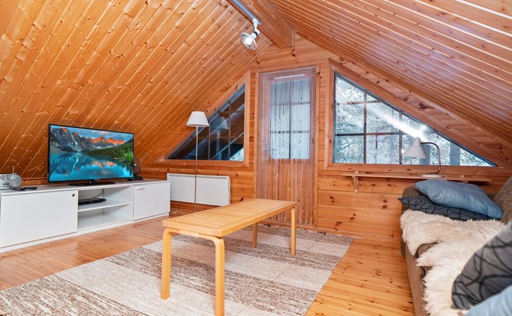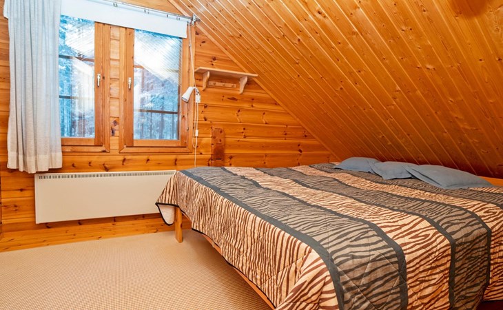Log cottage, built 1989, Downstairs: living room/kitchen and bedroom with double bed. Upstairs: bedroom with double bed, convertilble bed for 2 in bedroom/lounge, washroom, sauna (electric stove), open porch and balcony.