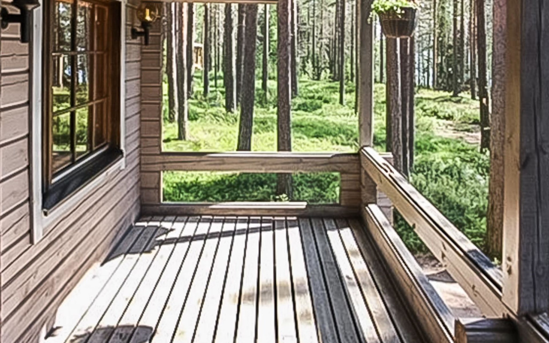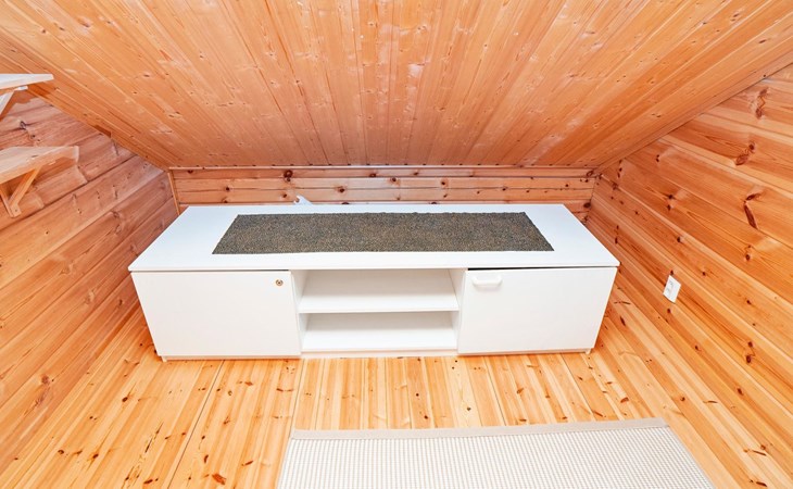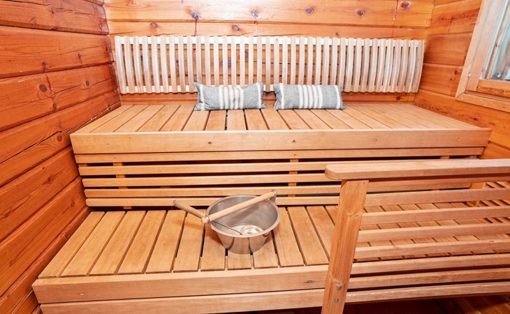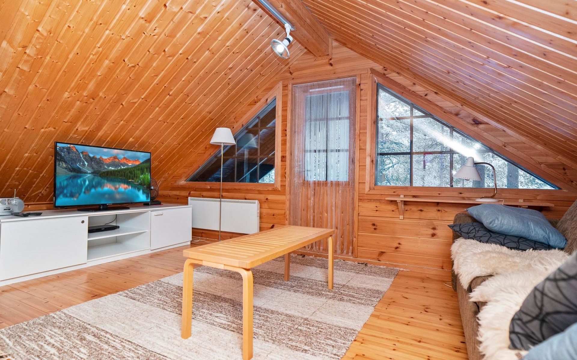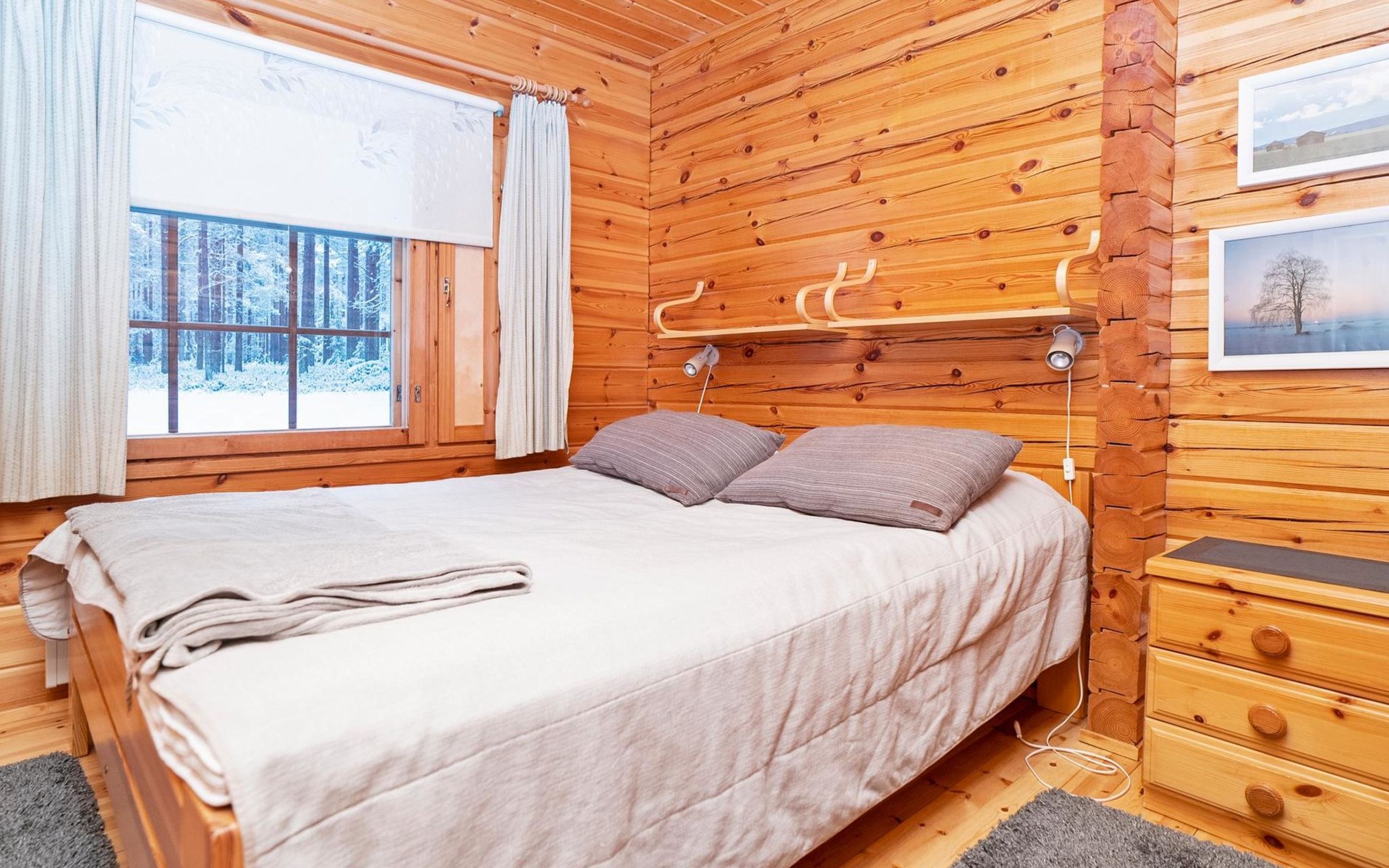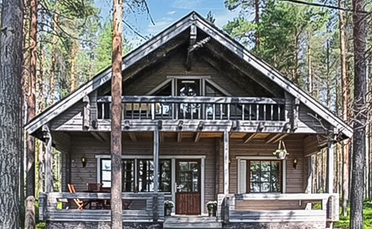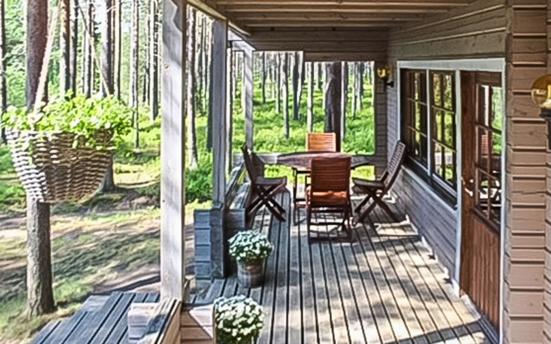 Log cottage, built 1989, Downstairs: living room/kitchen and bedroom with double bed. Upstairs: bedroom with double bed, convertilble bed for 2 in bedroom/lounge, washroom, sauna (electric stove), open porch and balcony.