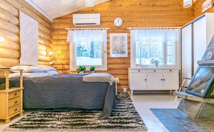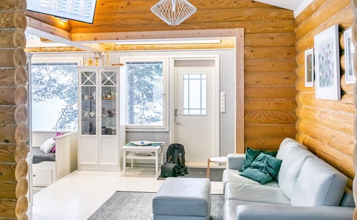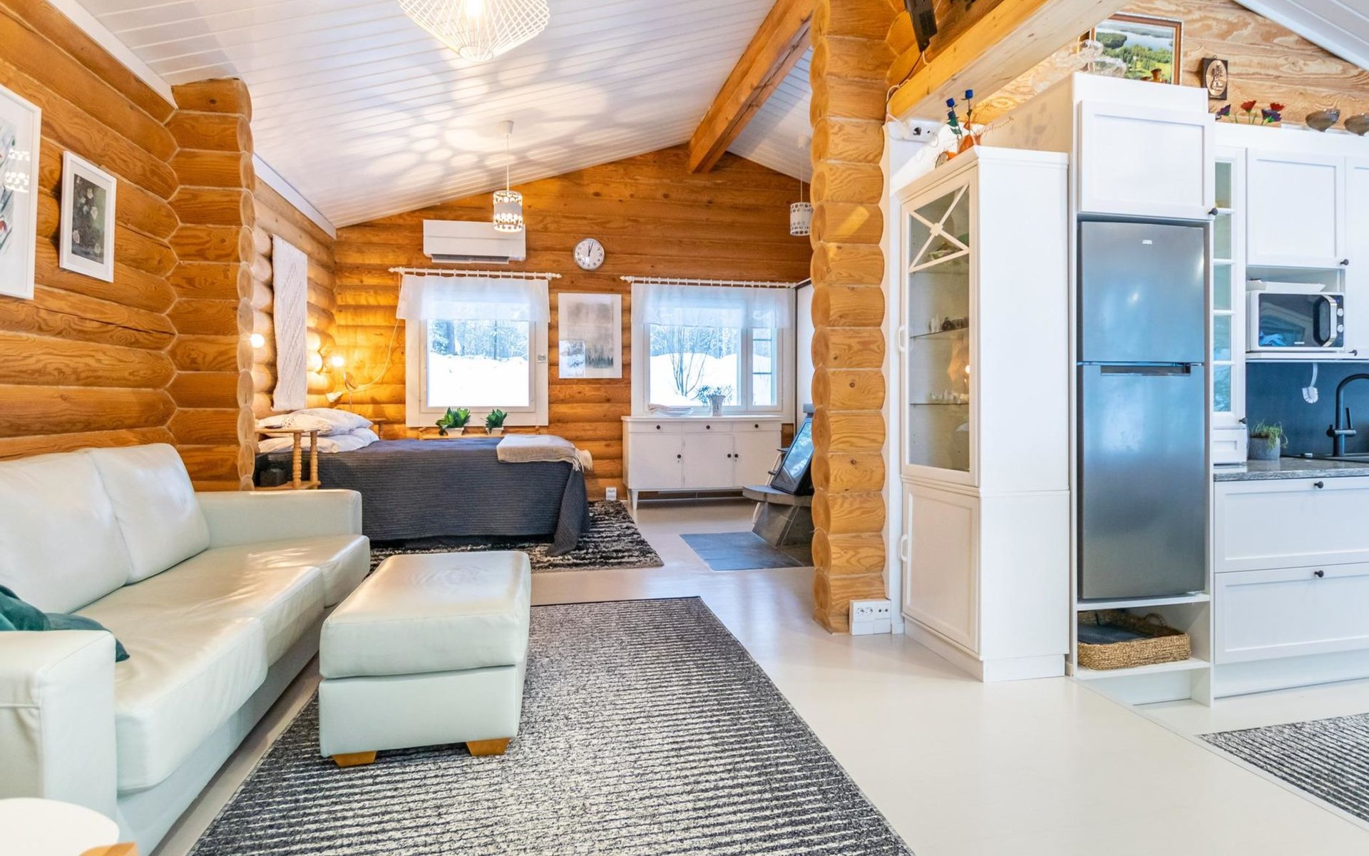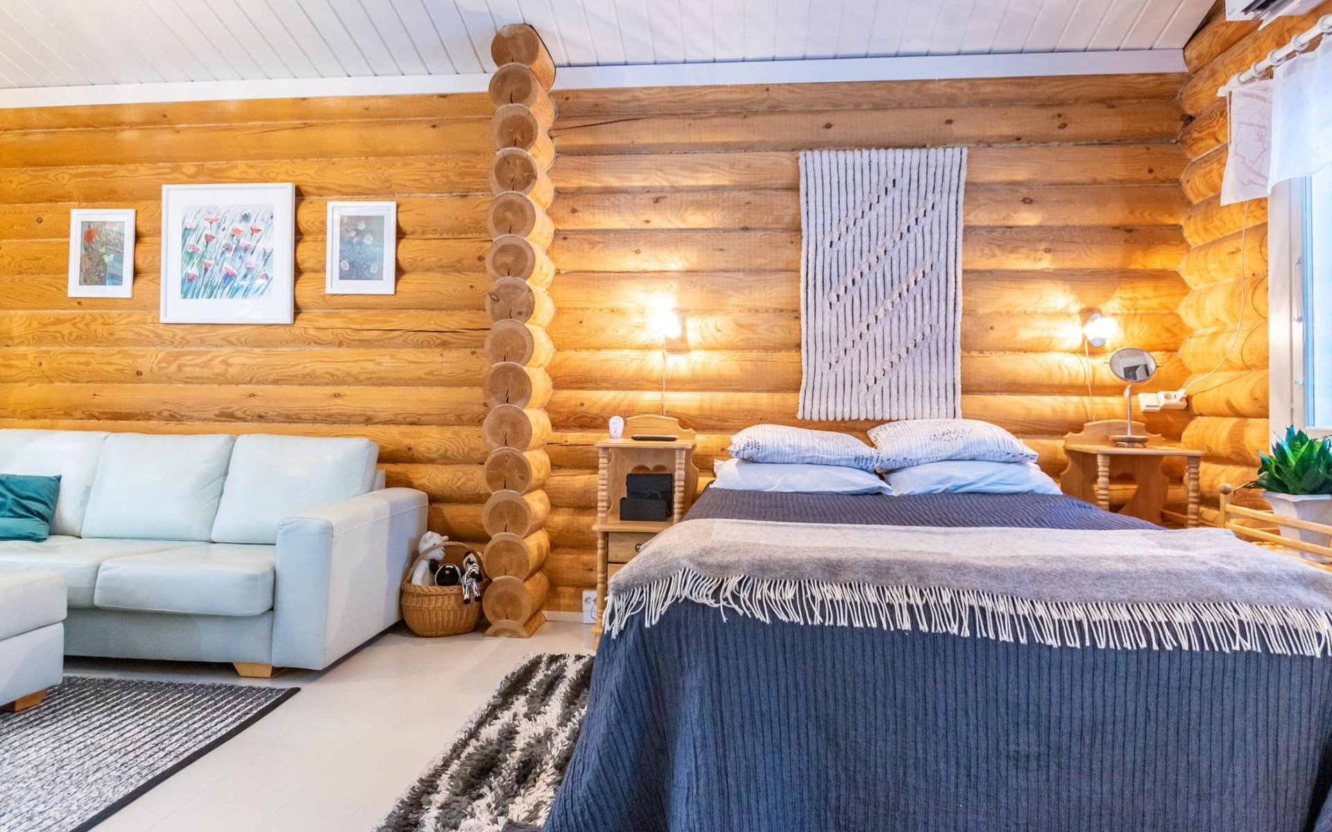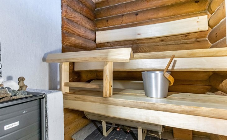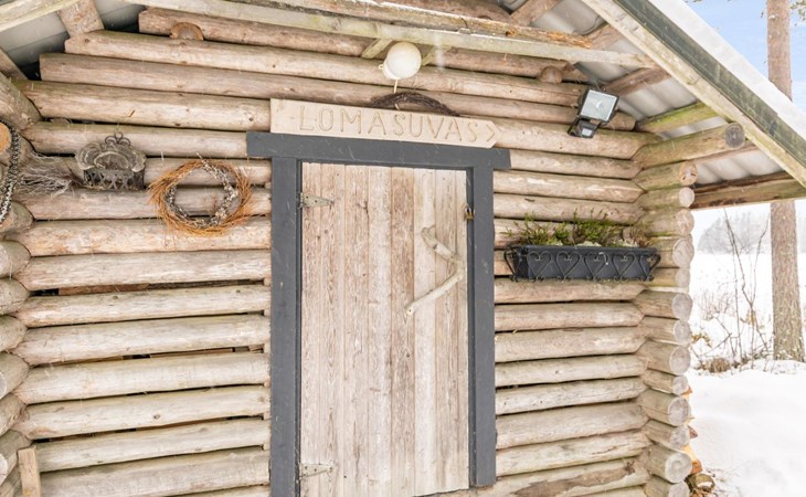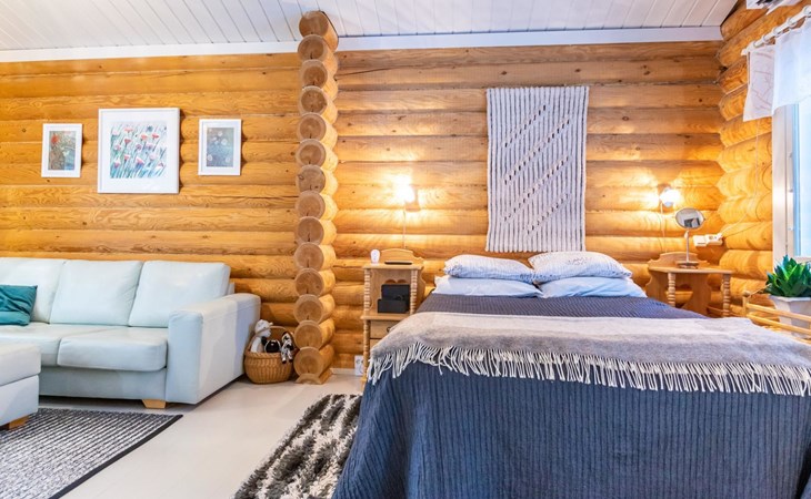 Log building 1994 (expanded 2022), living room - kitchen, a double bed 140 x 200 cm and a sofa bed (160 x 200 cm), washroom with shower and toilet, sauna (wood-burning stove).