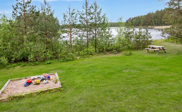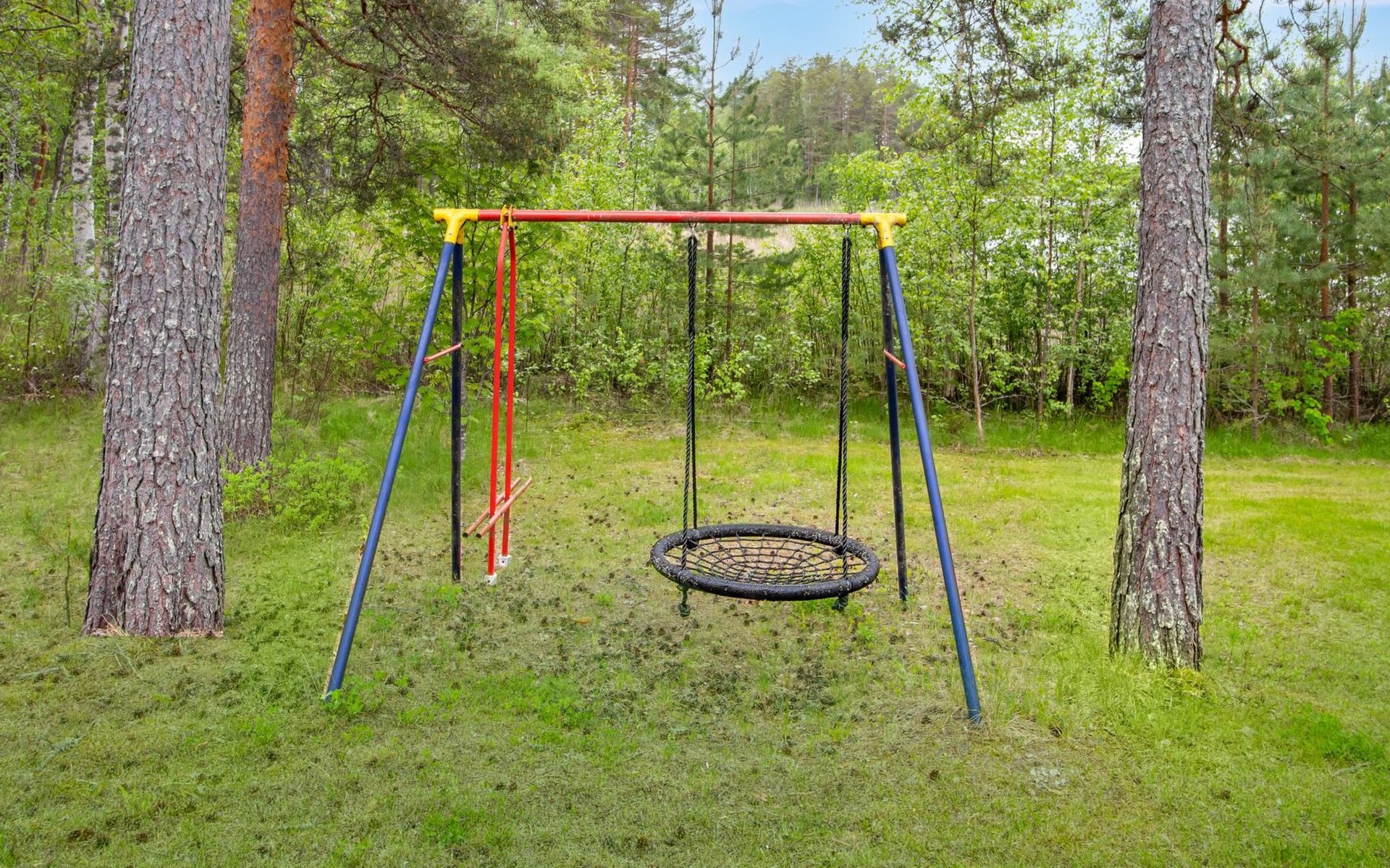 The yard includes a sandbox with toys and swings for children. A private grill hut is also available for outdoor cooking.