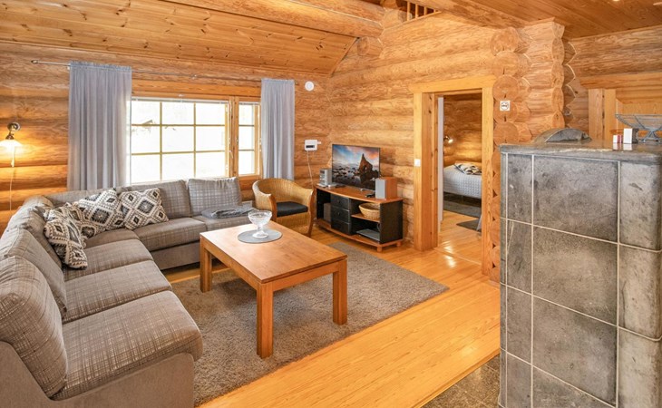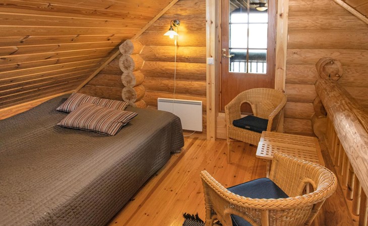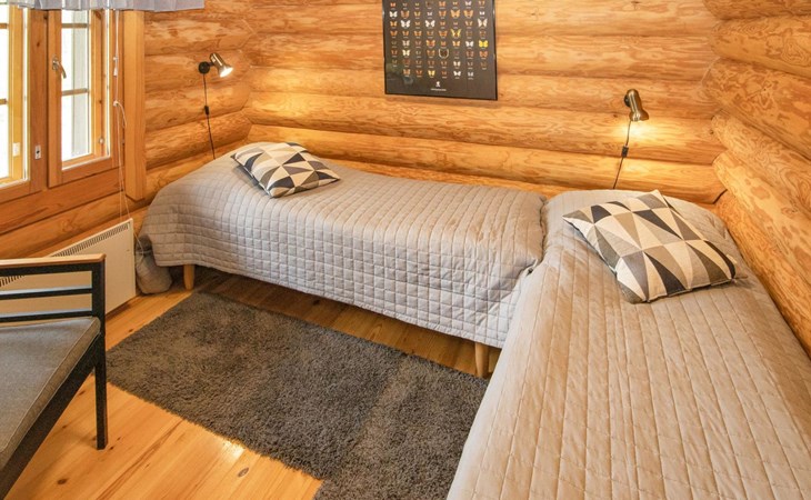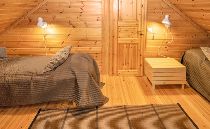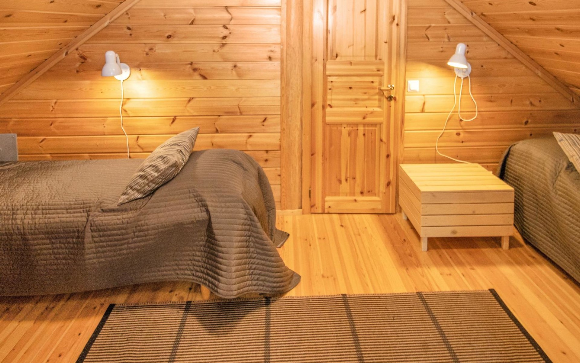 On the ground floor, there is a bright open-plan kitchen and living room, two bedrooms — one with a double bed and the other with two single beds — a separate WC, and a second WC/utility room with access to the washroom and an electric sauna. On the upper floor, there's a bedroom with two single beds and a living area. The open loft also offers two additional single beds.