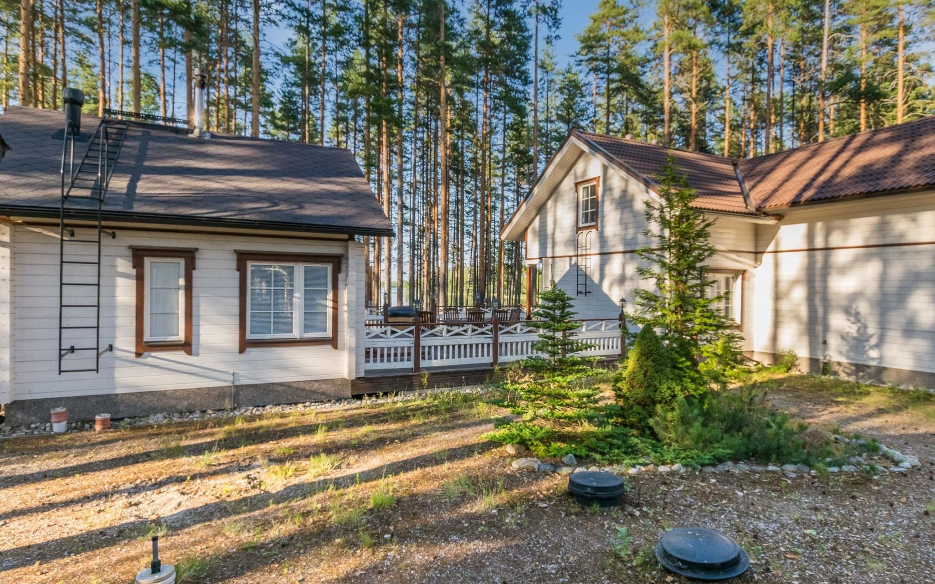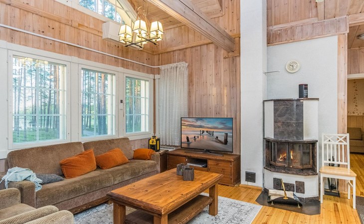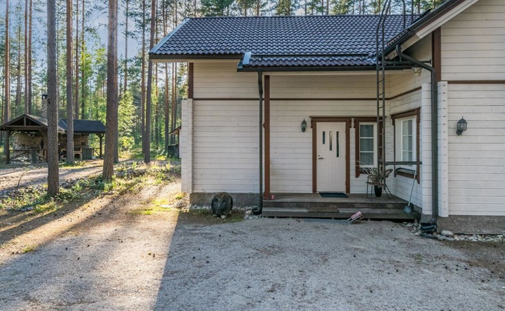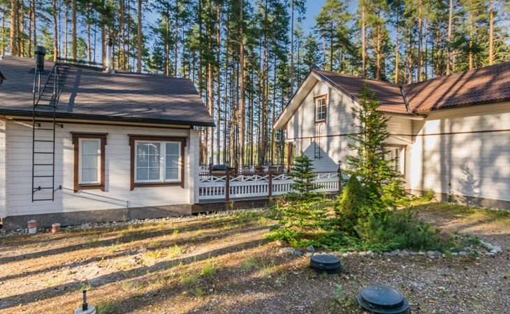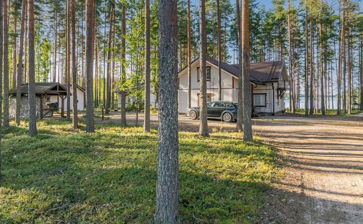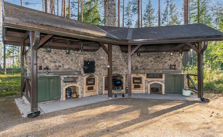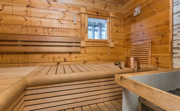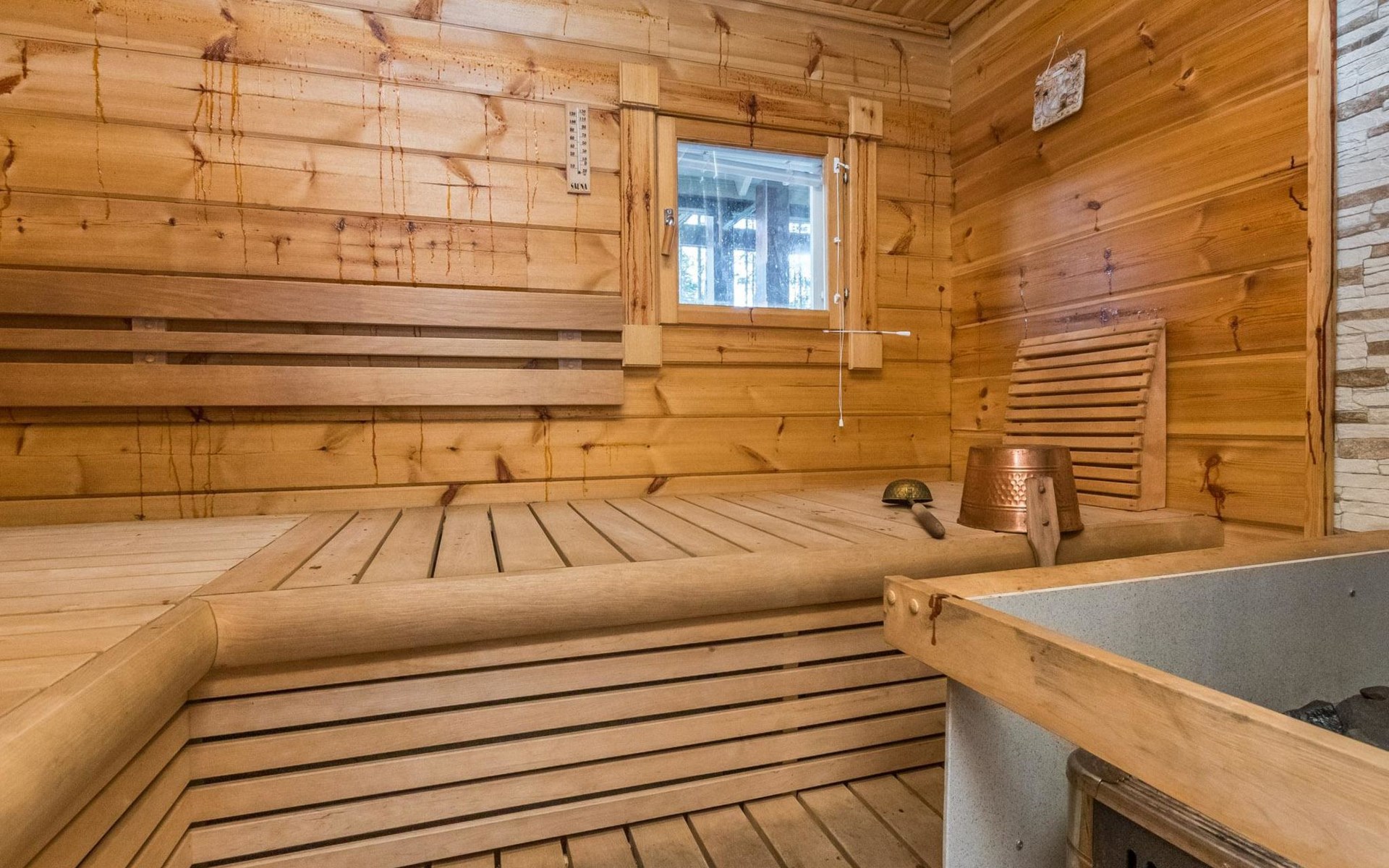 A separate sauna building with a wood stove, a toilet, shower and washing machine in the washroom, a room with a fireplace, a double bed in the loft. Open swimming in winter.