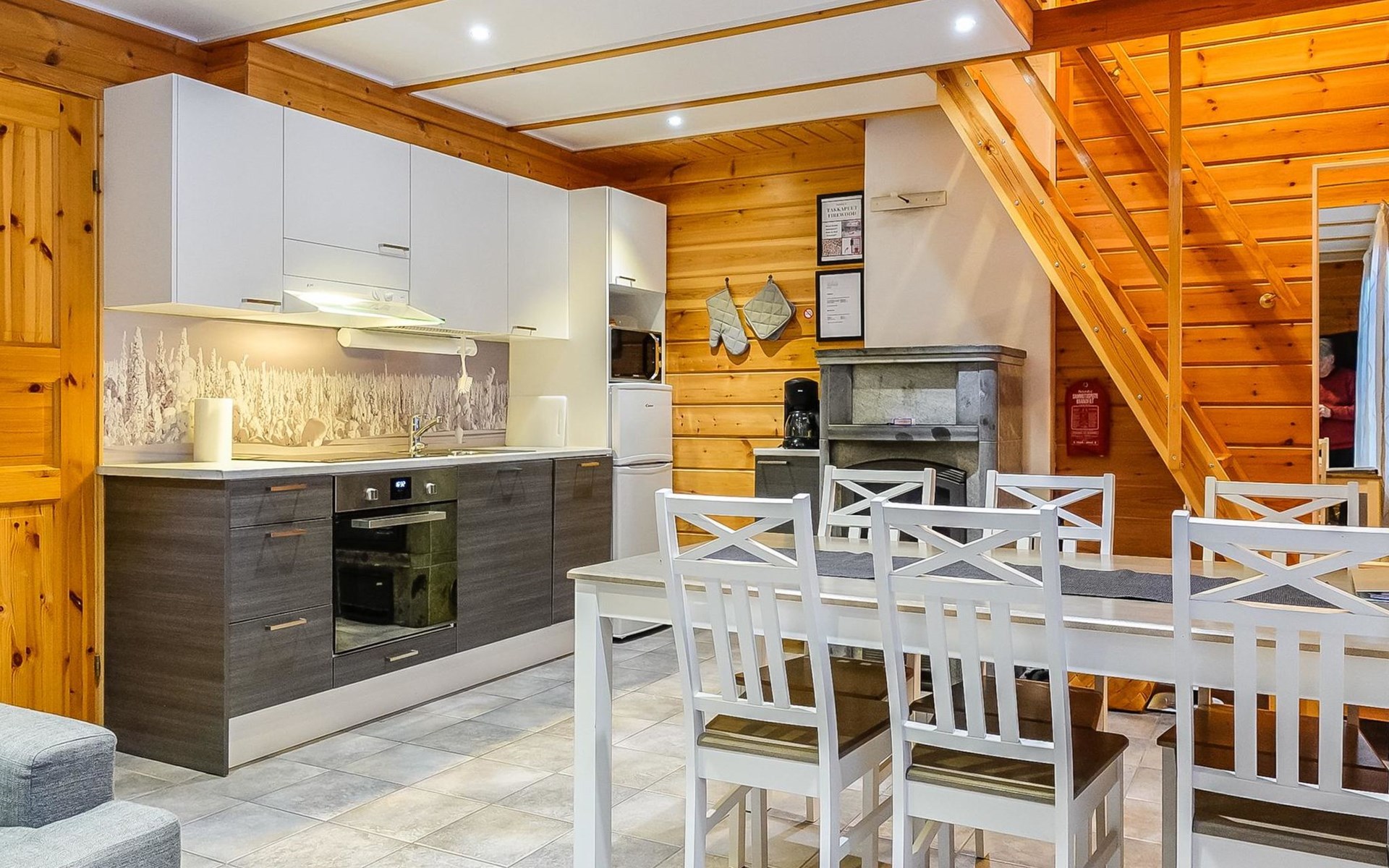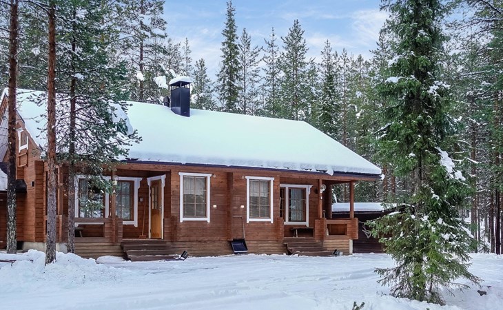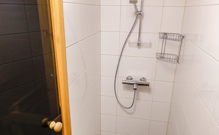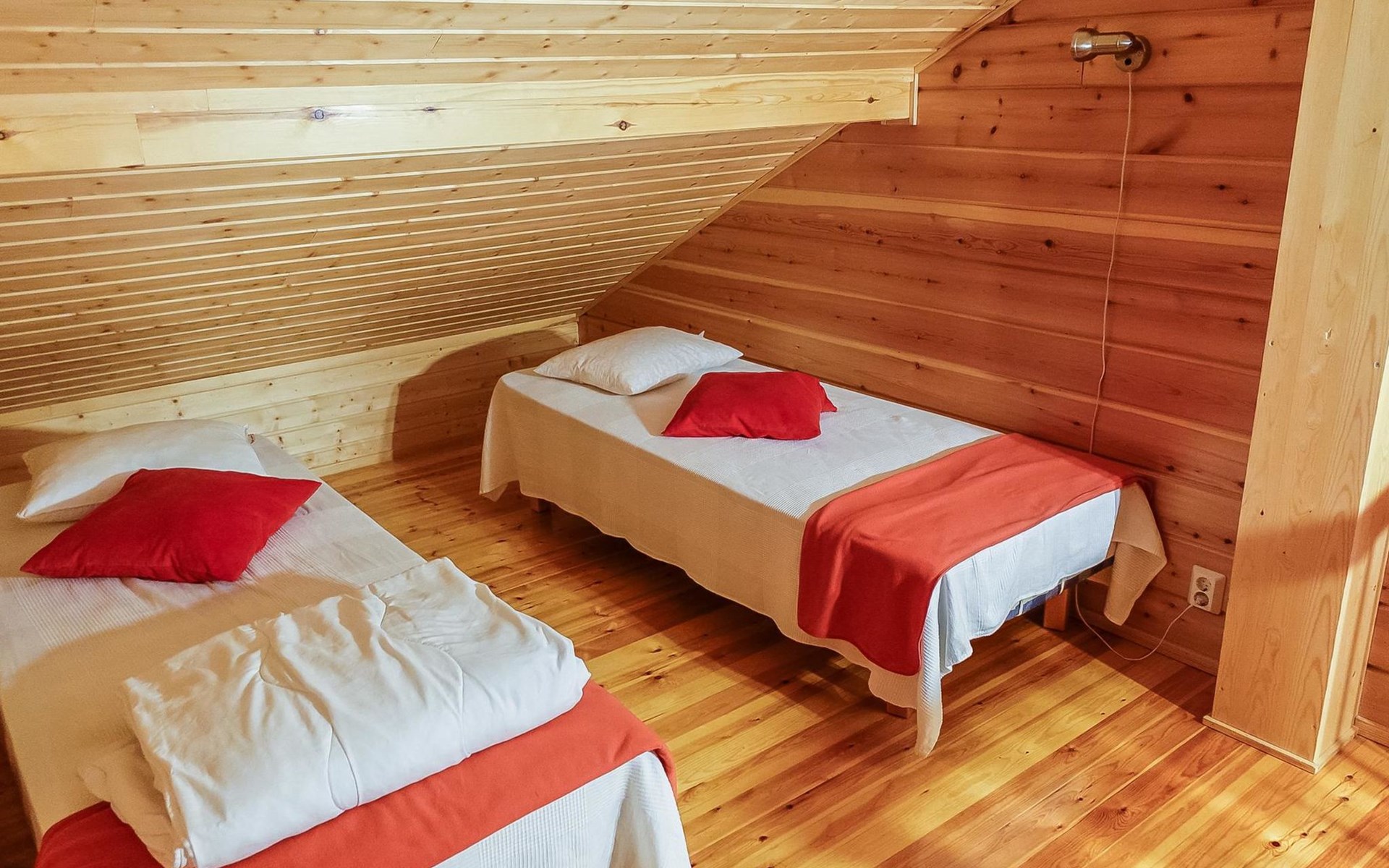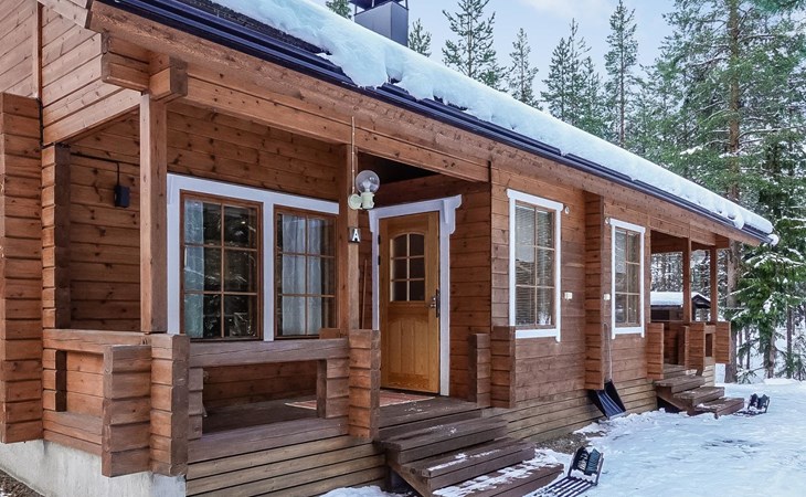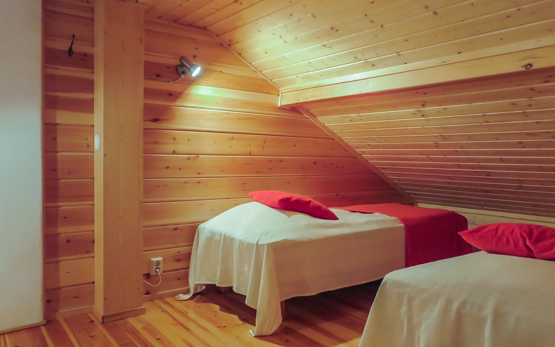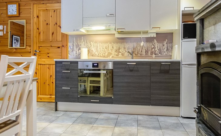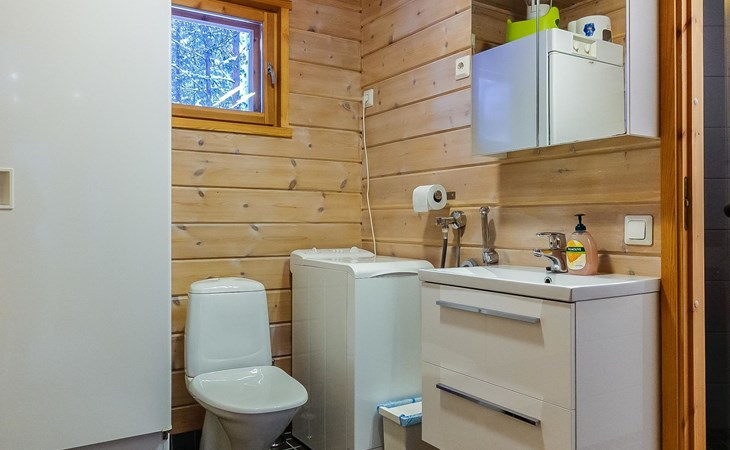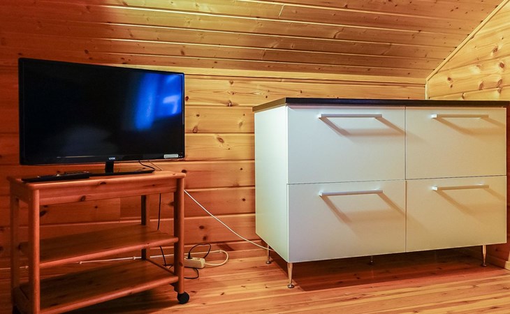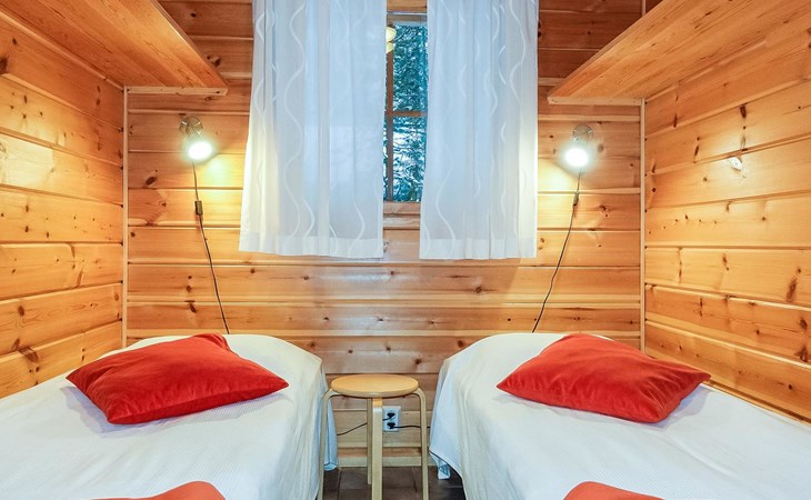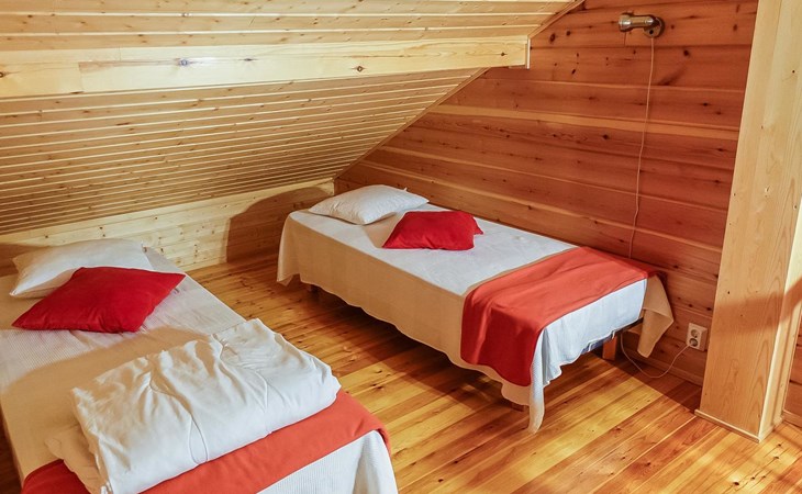 Kitchen-living room, downstairs bedroom with two single beds, upstairs room with 2 single beds ( steep stairs to upstairs/loft), a loft area with two single beds (beds can be moved, if necessary, to the upstairs spacious bedroom), sauna (electric stove), washroom / toilet, terrace. Underfloor heating throughout the ground floor.