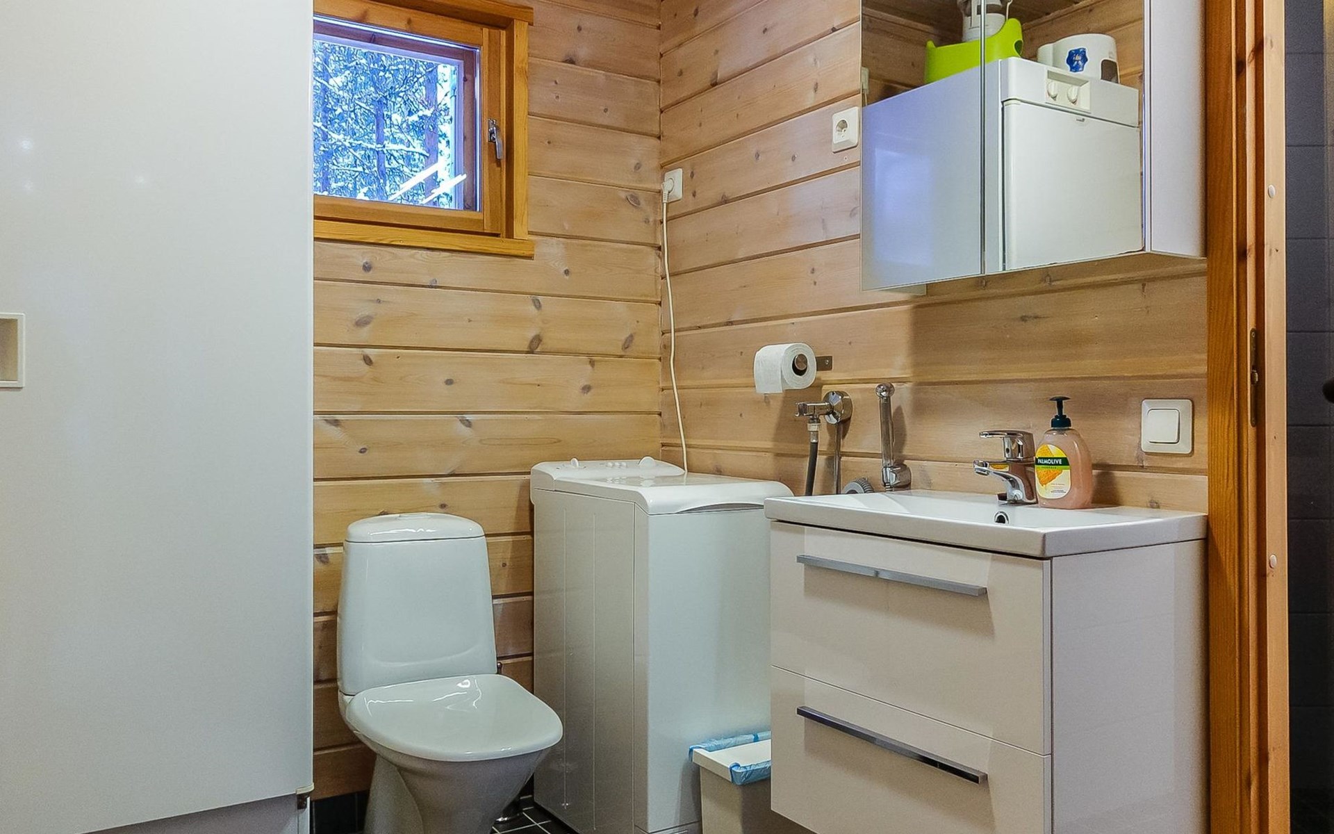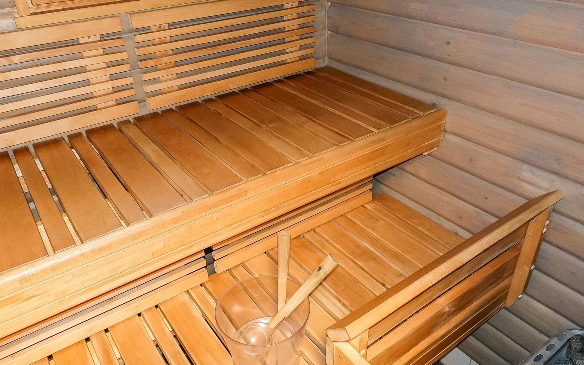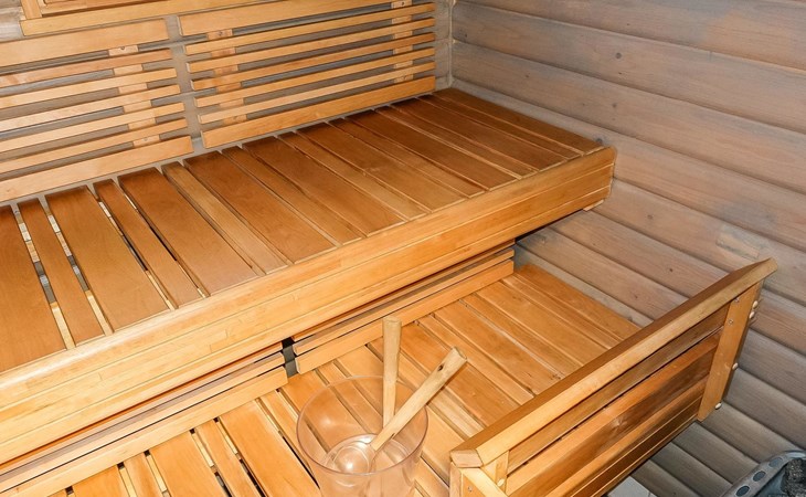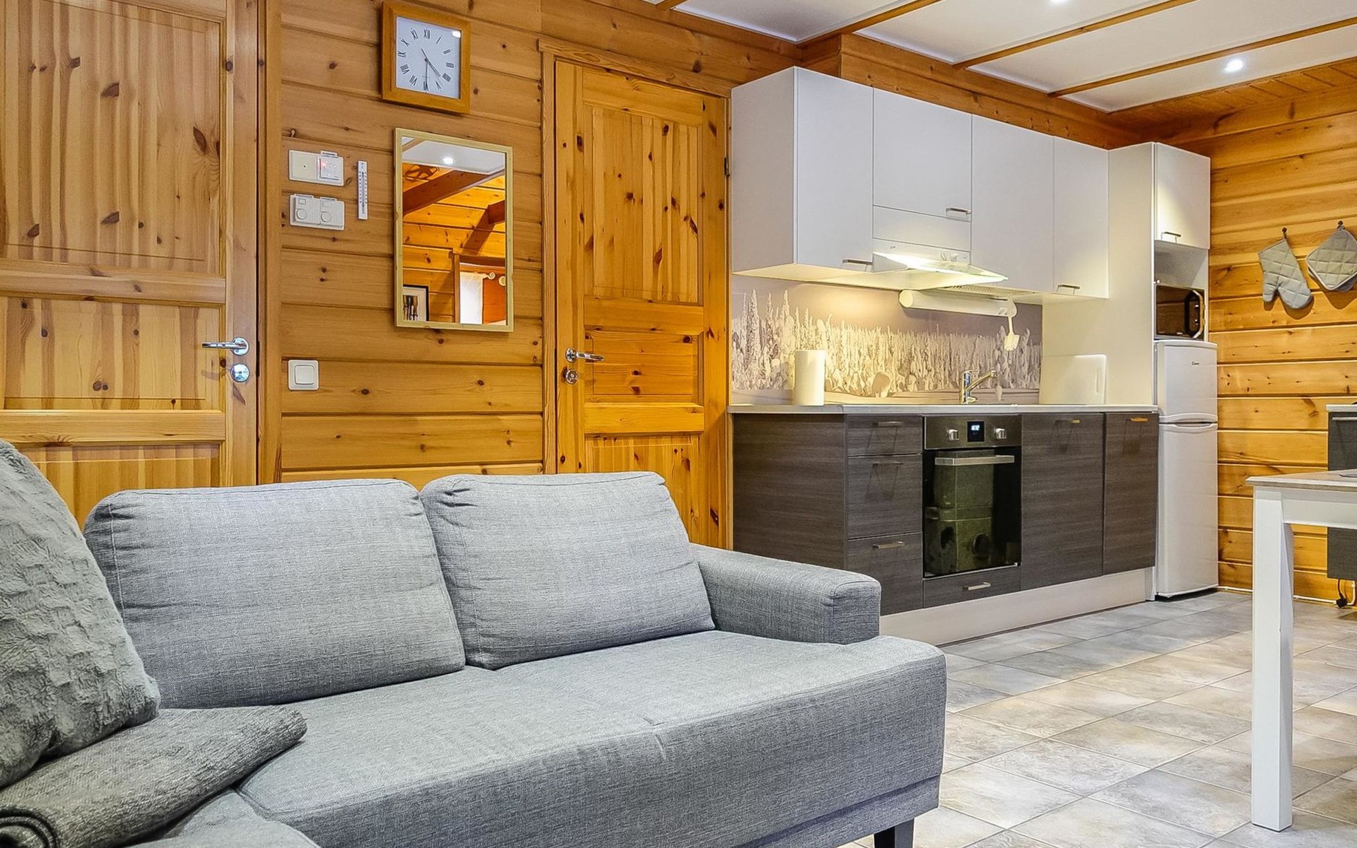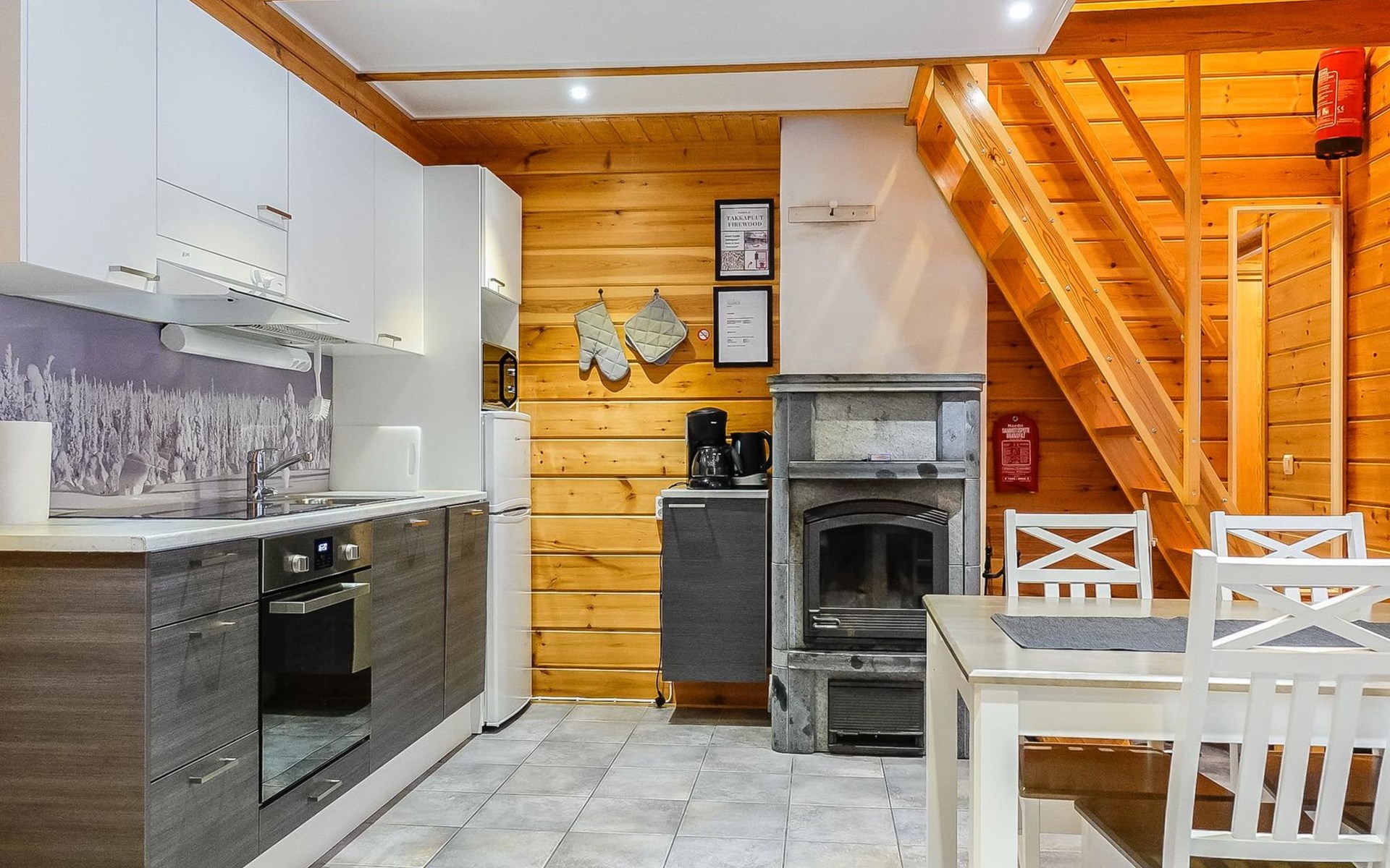 Kitchen-living room, downstairs bedroom with two single beds, upstairs room with 2 single beds ( steep stairs to upstairs/loft), a loft area with two single beds (beds can be moved, if necessary, to the upstairs spacious bedroom), sauna (electric stove), washroom / toilet, terrace. Underfloor heating throughout the ground floor.