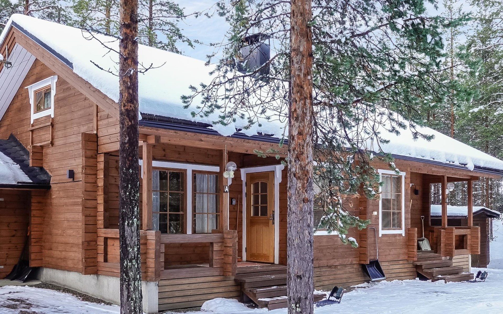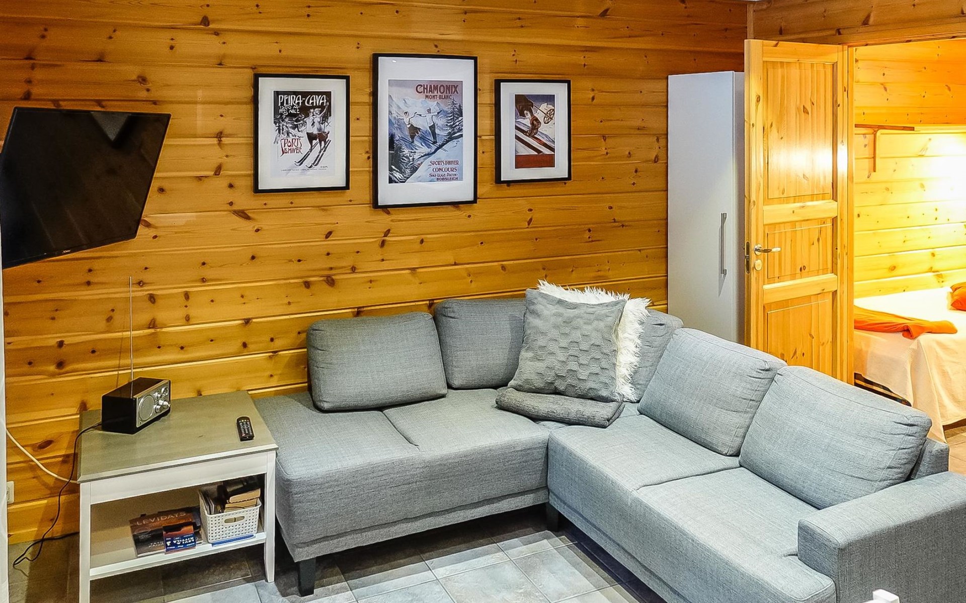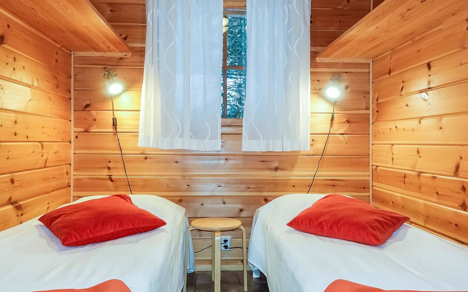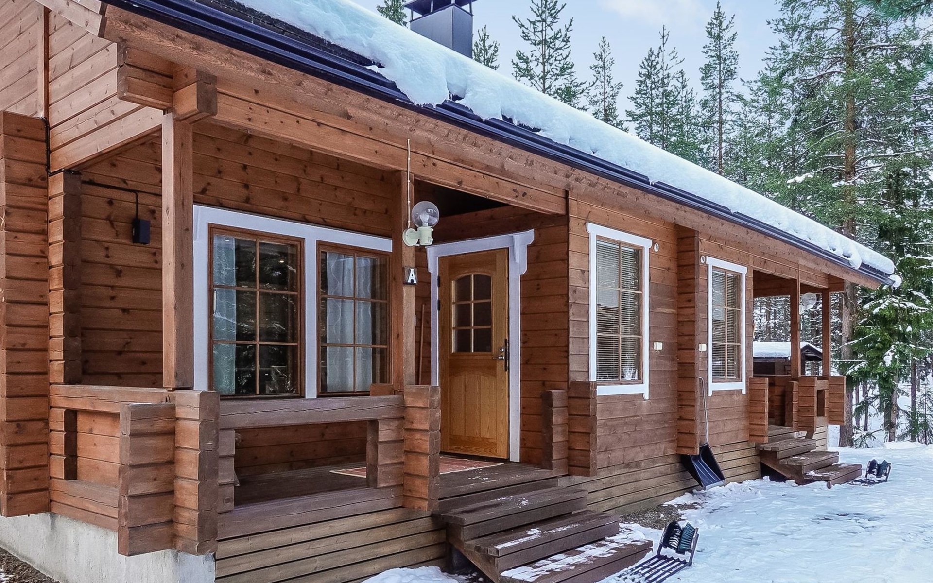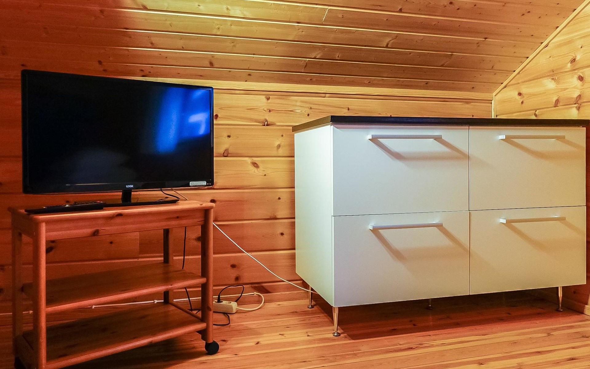 Kitchen-living room, downstairs bedroom with two single beds, upstairs room with 2 single beds ( steep stairs to upstairs/loft), a loft area with two single beds (beds can be moved, if necessary, to the upstairs spacious bedroom), sauna (electric stove), washroom / toilet, terrace. Underfloor heating throughout the ground floor.