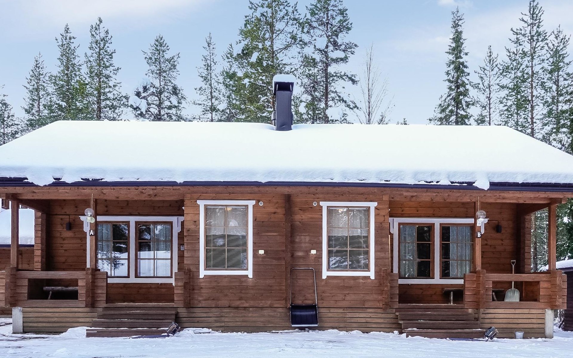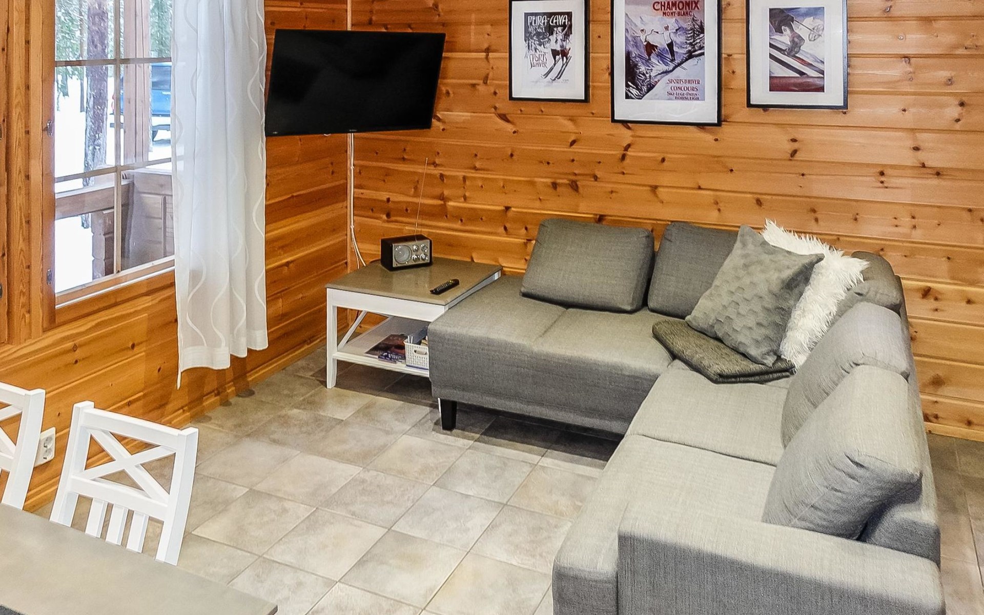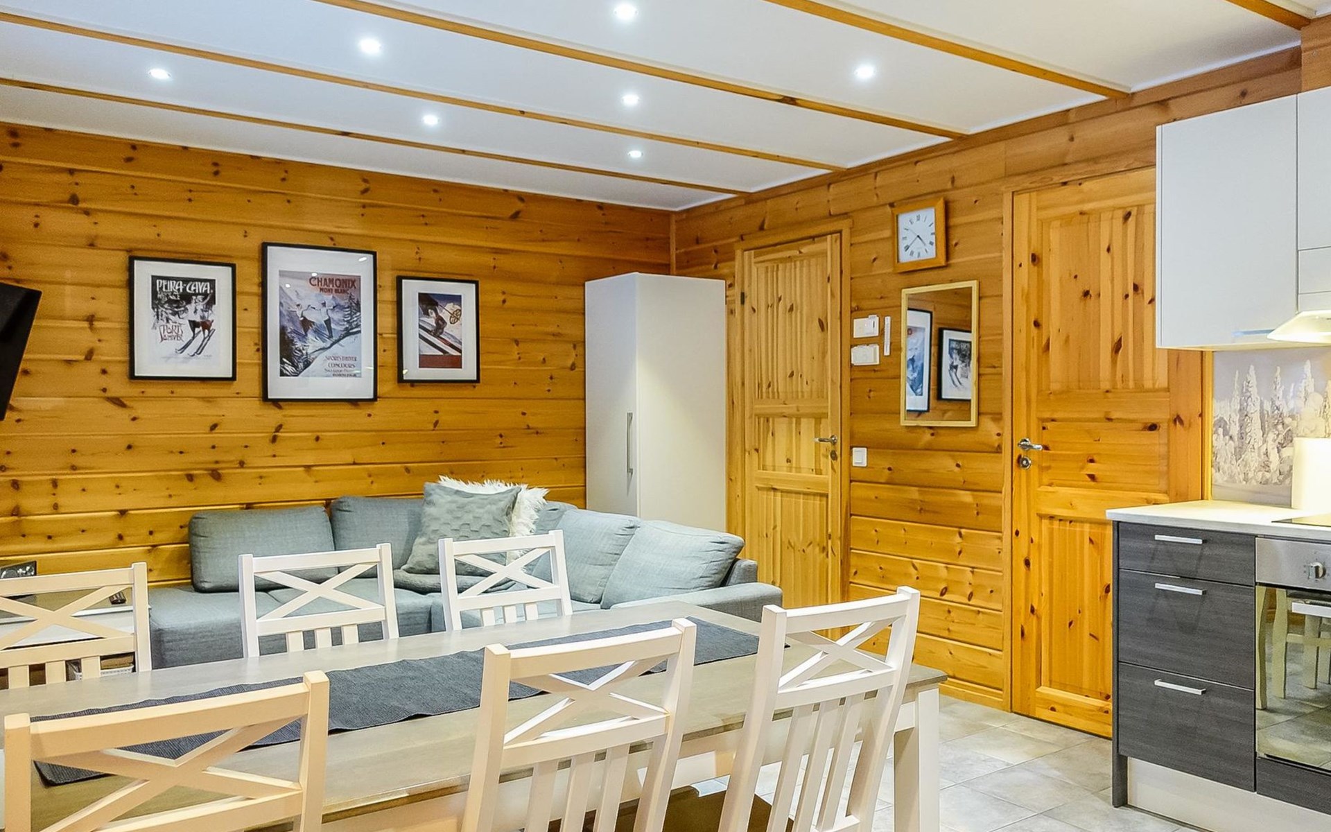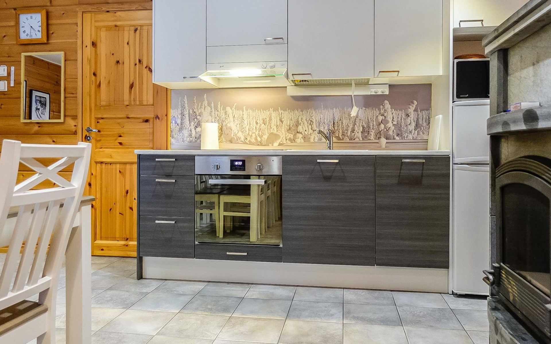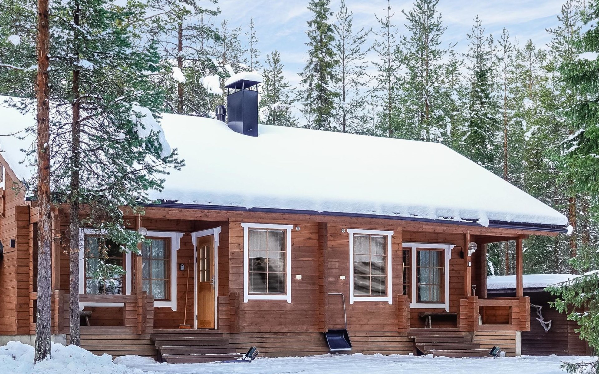 Kitchen-living room, downstairs bedroom with two single beds, upstairs room with 2 single beds ( steep stairs to upstairs/loft), a loft area with two single beds (beds can be moved, if necessary, to the upstairs spacious bedroom), sauna (electric stove), washroom / toilet, terrace. Underfloor heating throughout the ground floor.