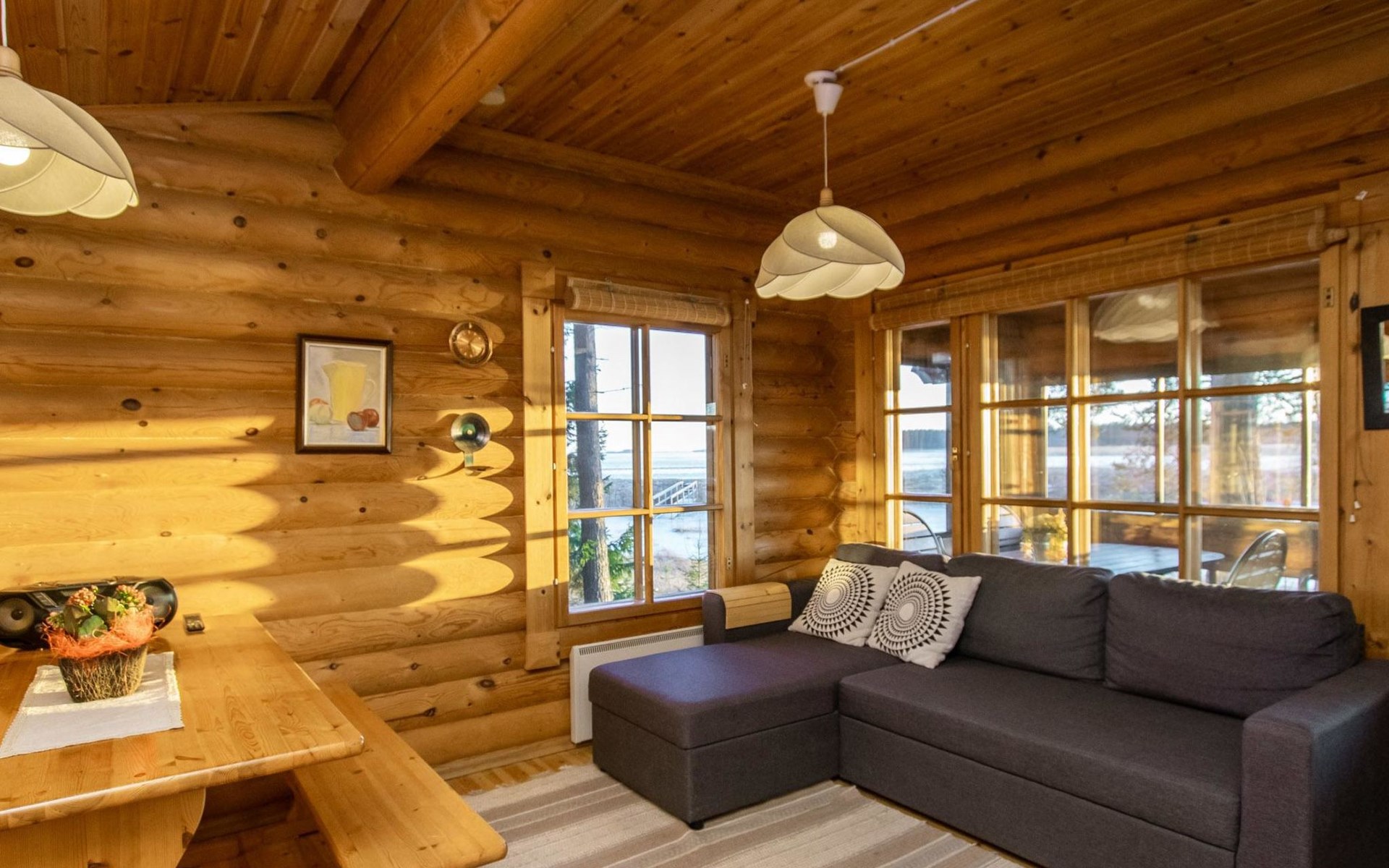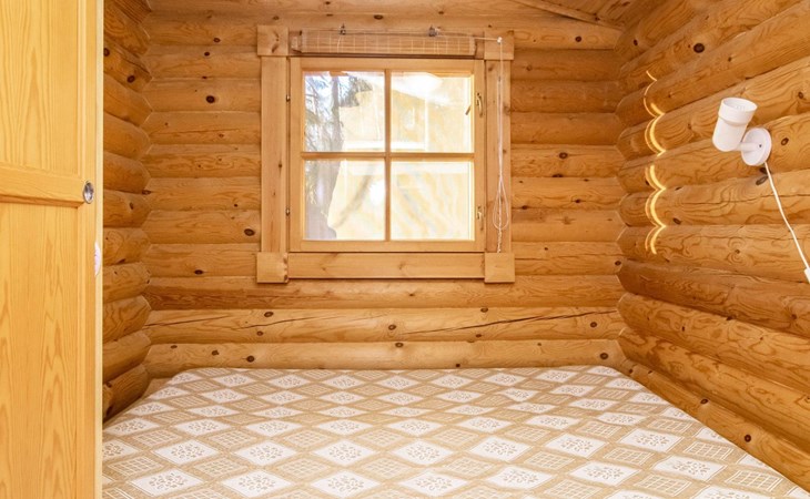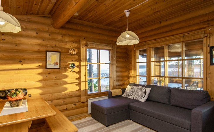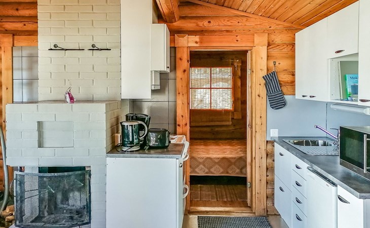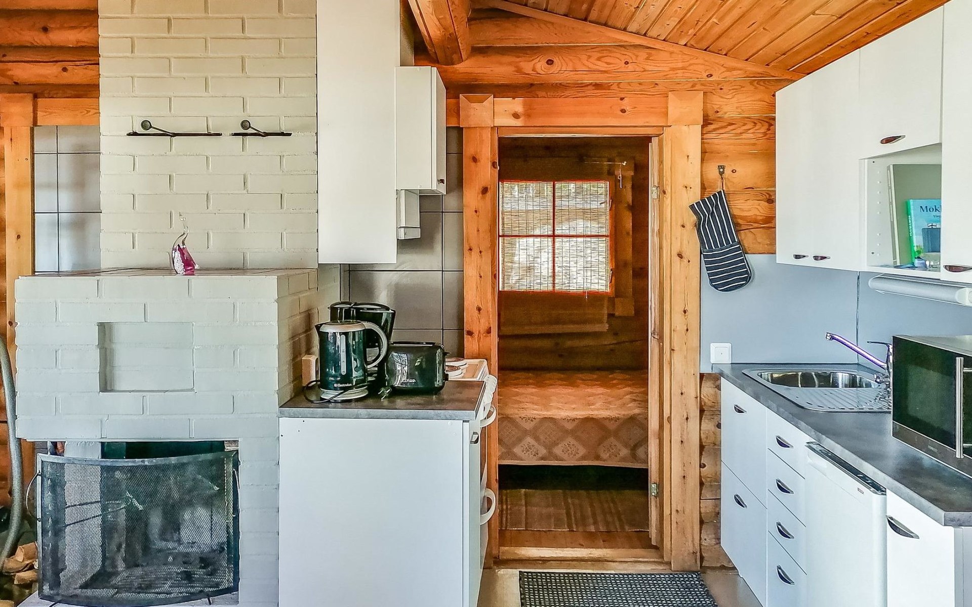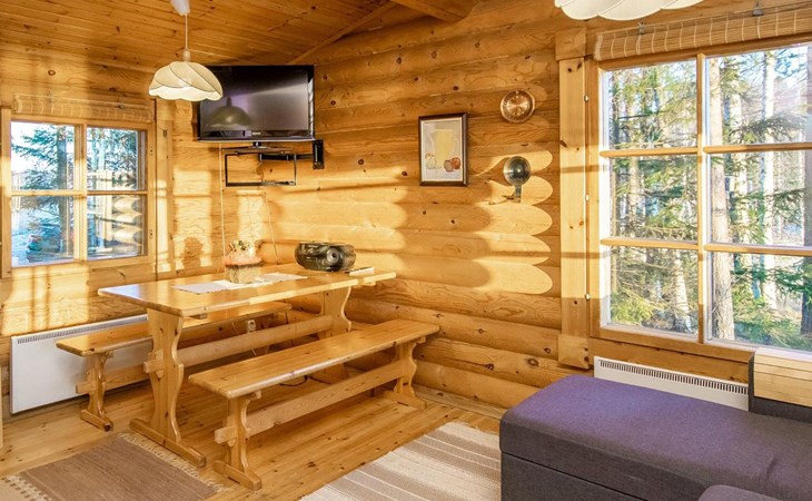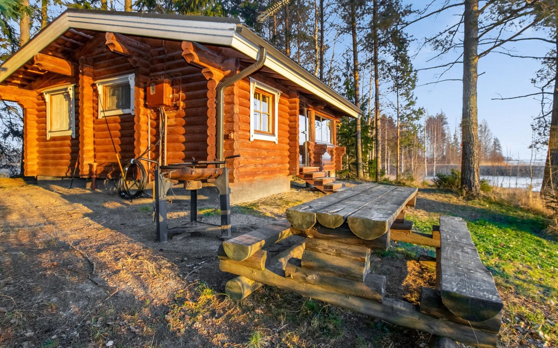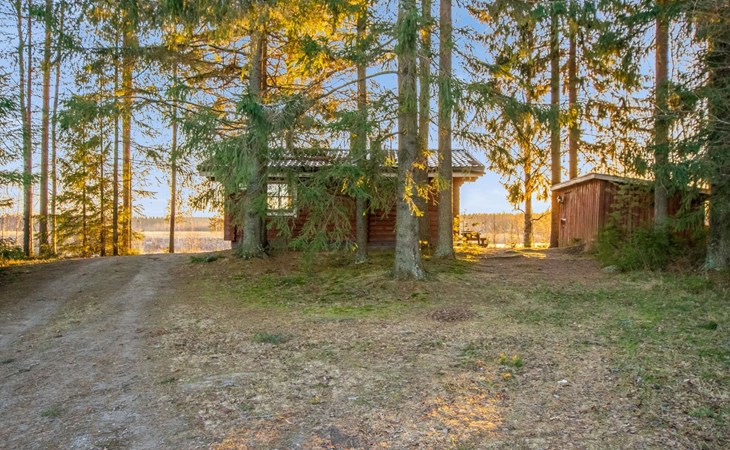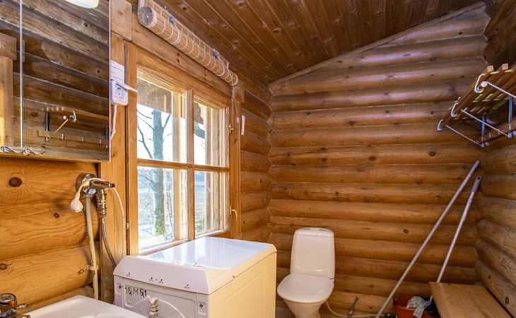 Log cabin 1990, living room/kitchen 1 sofa (for two persons), bedroom with 2 beds, dressing room, sauna (wood sauna stove), glazed veranda. Entrance to sauna and toilet via veranda. Neighbor cottage 100 m, distance between piers is 50 m.