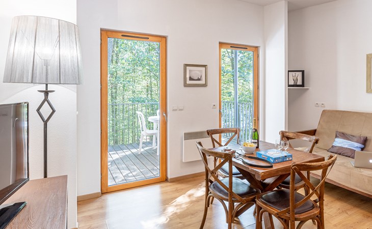 On the north shore of Lac du Valjoly, the residence is made up of 180 accommodations divided into semi-detached cottages or hamlets of semi-detached single-storey timber-framed cottages residence, surrounded by trees and meadows. Outside the resort, 3 km from the centre of Eppe Sauvage. In the complex: reception, internet access, washing machine, tumble dryer (for shared use, extra). Parking. Grocery, restaurant 500 m. Hiking paths: Parc Naturel Régional de l'Avesnois. Please note: car recommended. The photograph shows a typical example. Additional accommodations can be booked. Free access to the indoor aquatic center with wave pool, rapid river, waterfalls, massage jets.... Relaxation area, activities to be paid on site: sauna, hammam, nautical base, equestrian centre, mountain biking. Satellite TV (extra). TV rental 35 euros/week. Free Wi-Fi at reception.